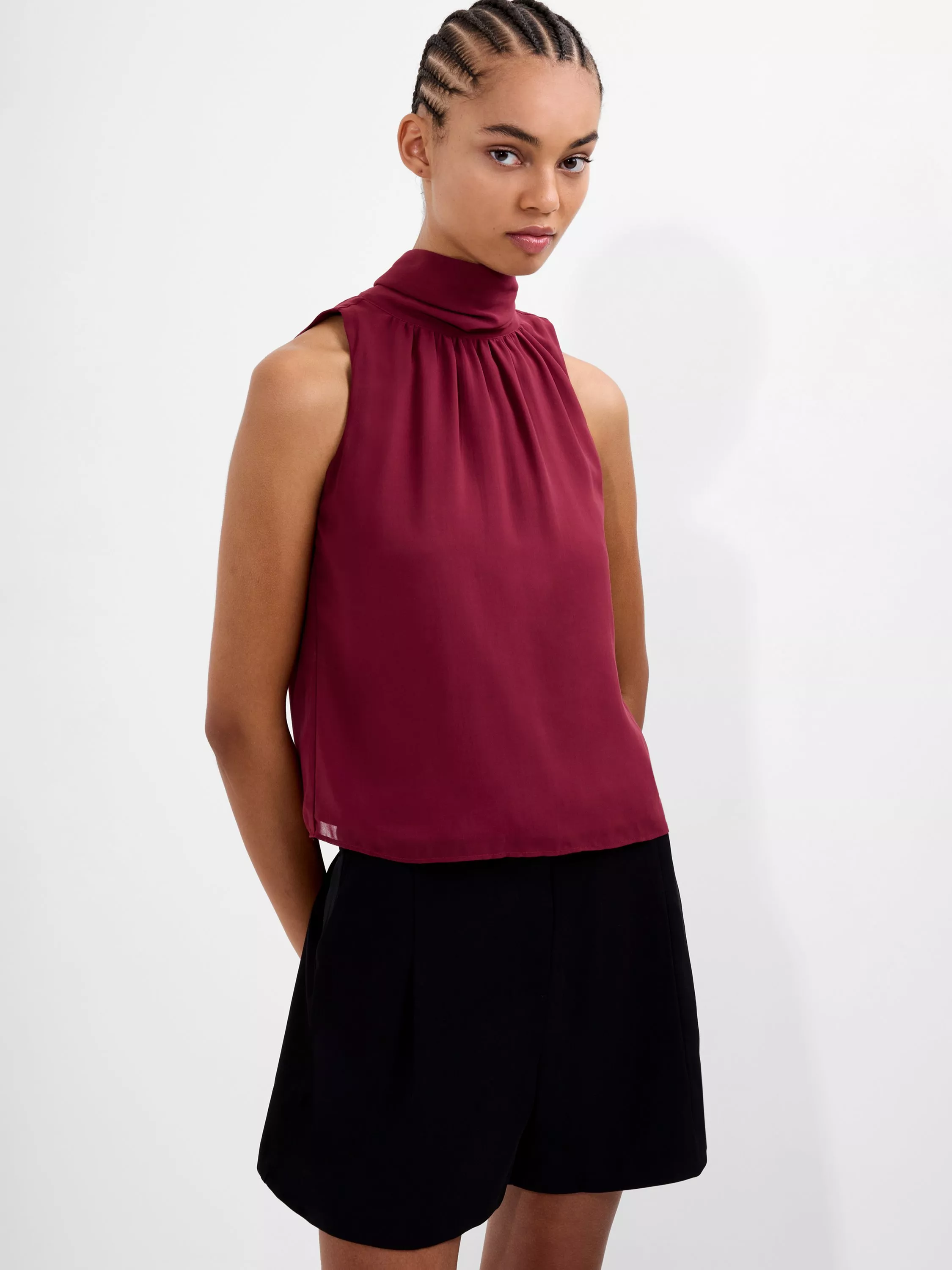 Softly does it. The Marina Chiffon Sleeveless Bow Top presents its sleeveless silhouette with a chiffon overlay and high gathered neckline with a self-tie back.
