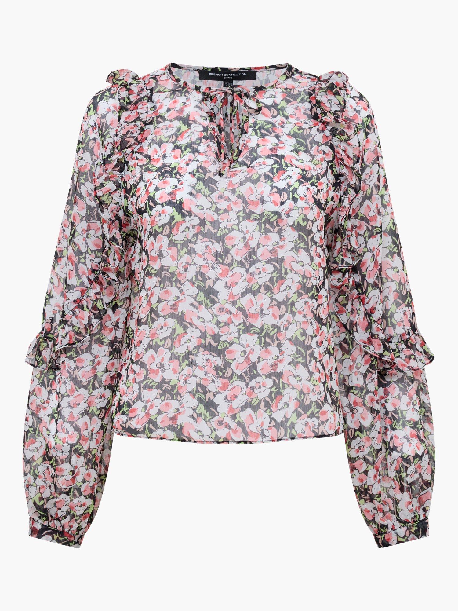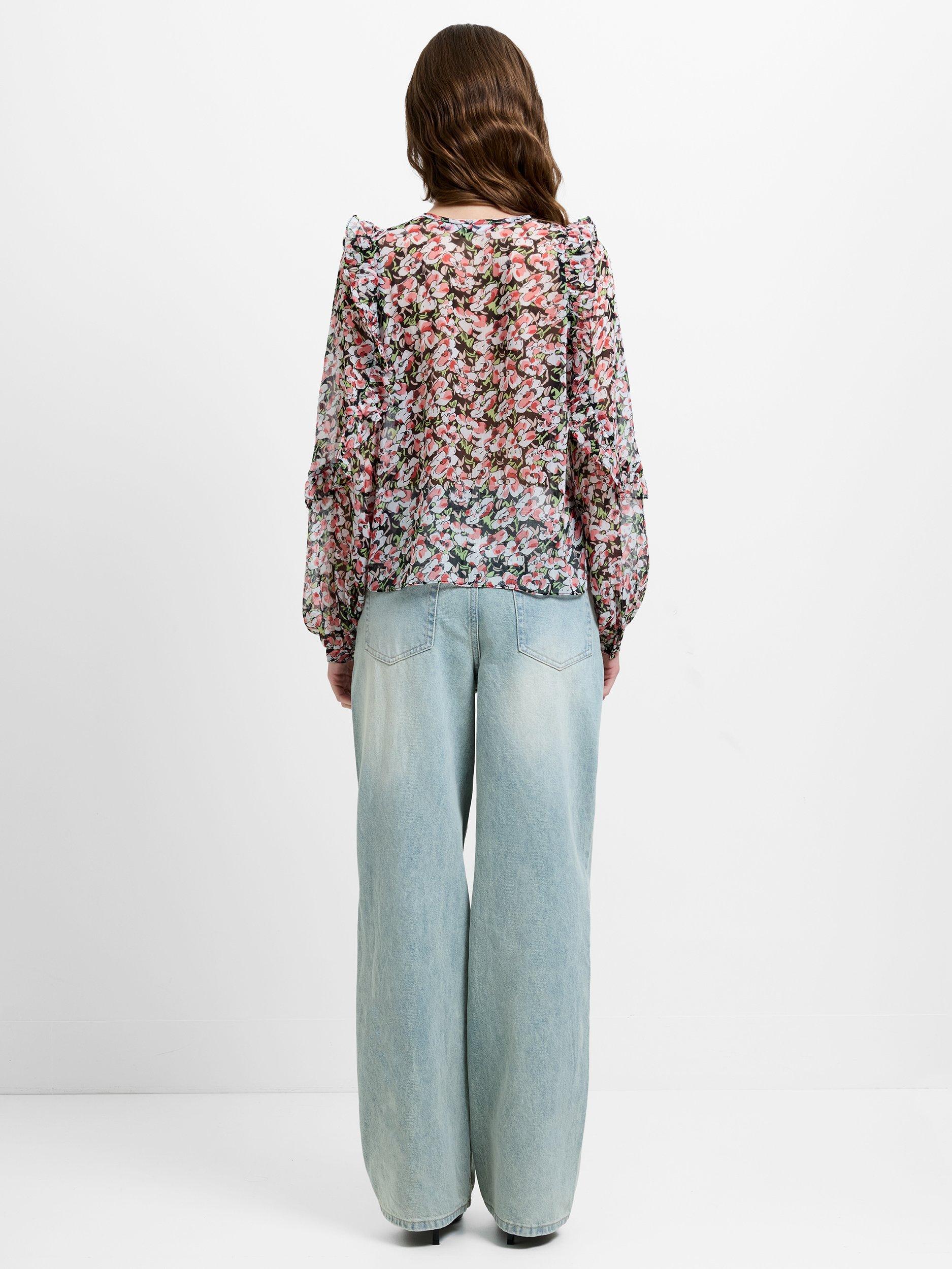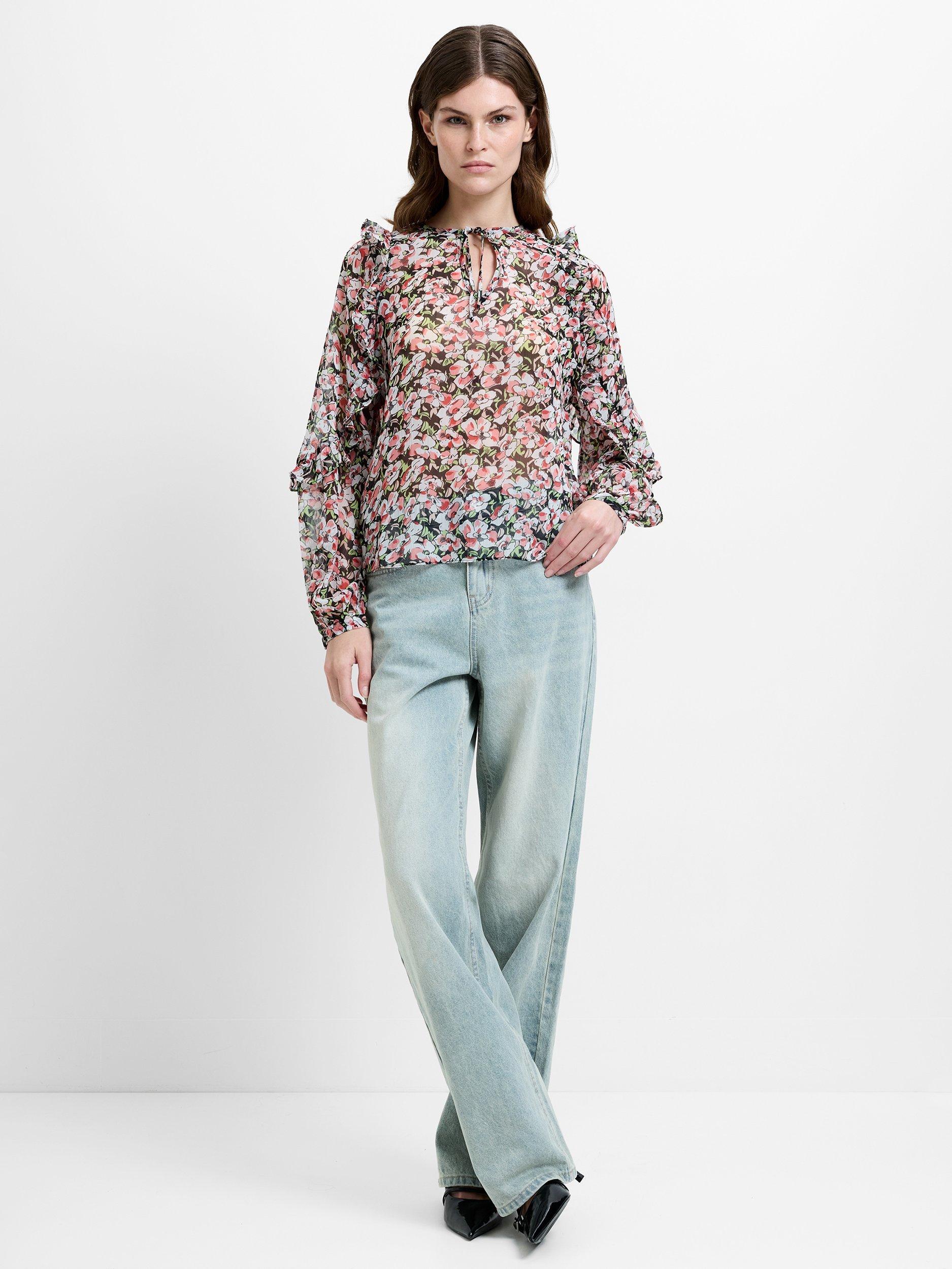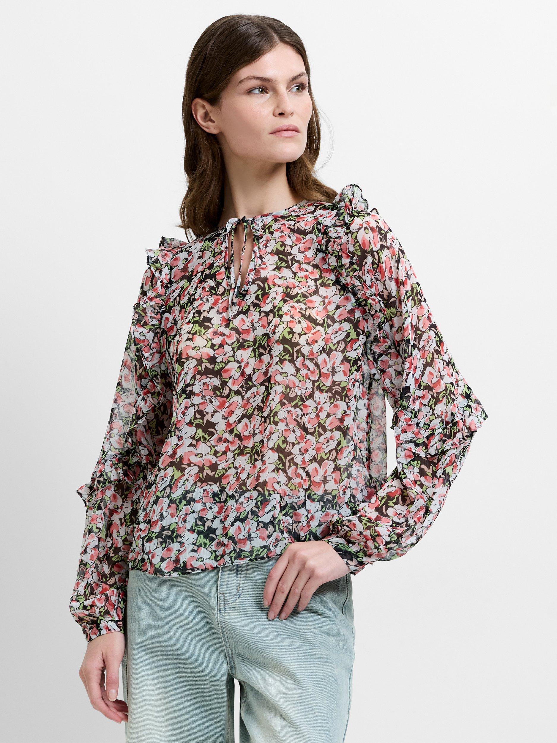 Ruffles done right. The Molly Emina Ruffle Sleeve Top showcases a lightweight sheer finish with a romantic floral print and cascading ruffle sleeve details.