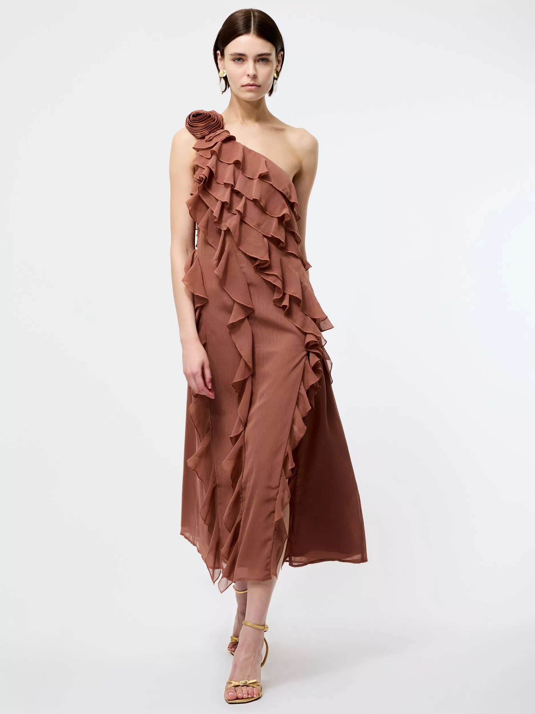Unleash your inner goddess with the irresistibly romantic Oskar Georgette Ruffle Midi Dress. This dreamy summer dress presents cascading ruffles which flow from its shoulder to hem whilst a floral rosette adds further femininity to its one shouldered silhouette. Its soft hue brings a modern twist to timeless elegance whilst playful layers give you a look that is as dynamic as you are. Create a showstopping entrance to summer soirees and events in this sweetly chic midi dress.