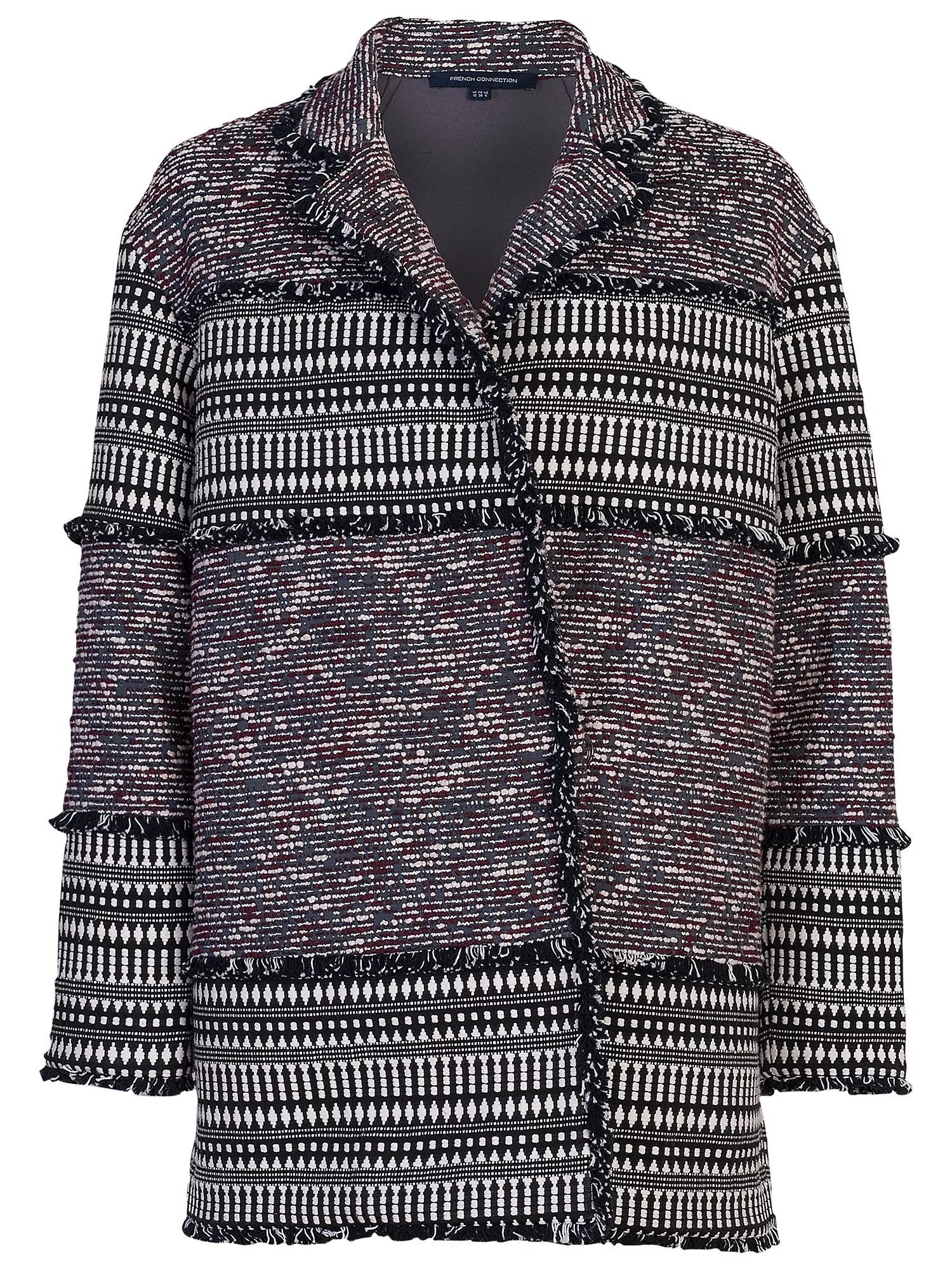 Designed with a tweedy pattern, the unfinished edges give this coat and interesting twist. Also featuring a collar neckline, no fastening and with long sleeves this coat is easy to layer over your outfit.
