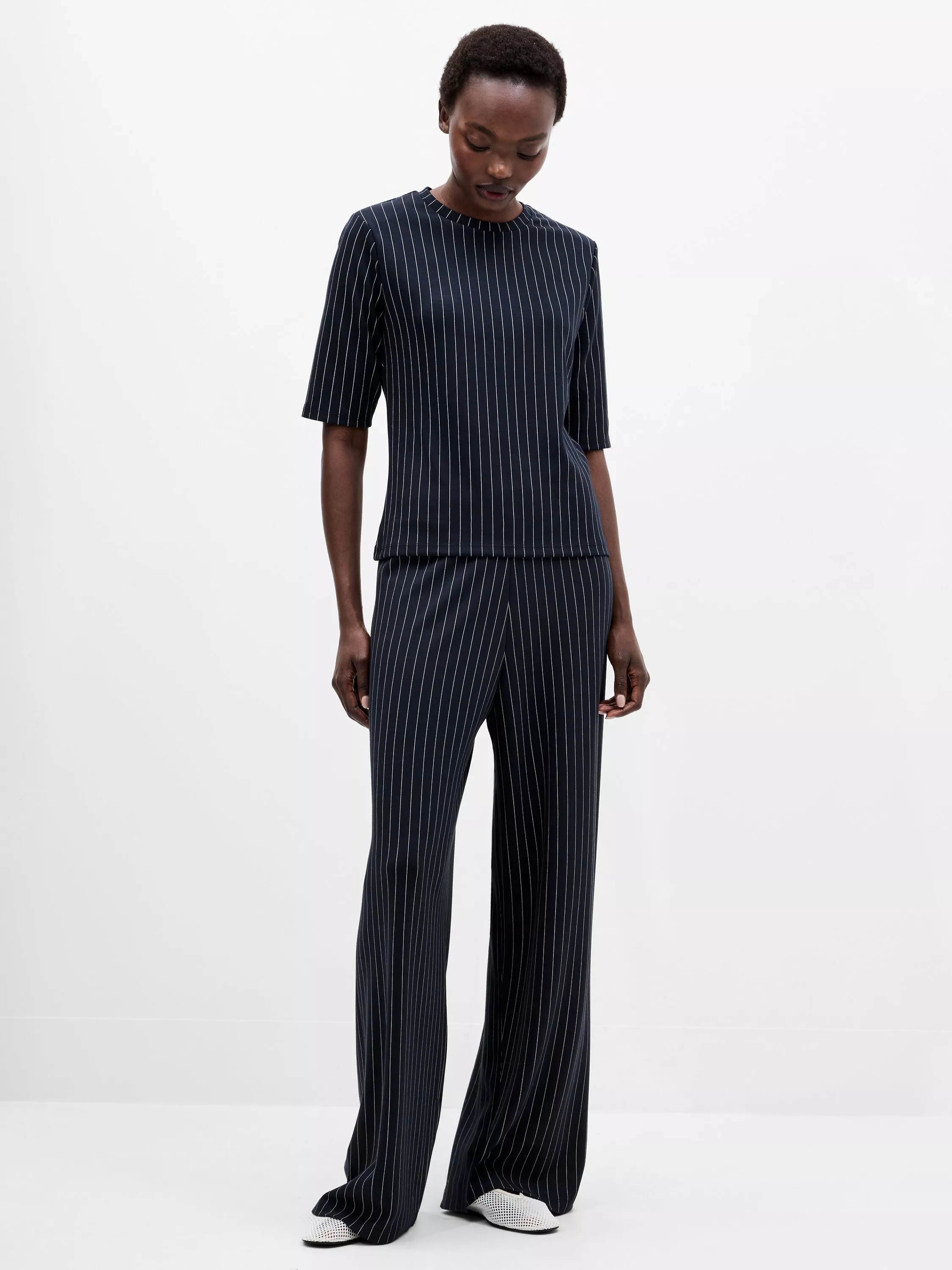 The Regina Jersey Pinstripe Shoulder Pad T-Shirt is a casually chic everyday piece. This soft t-shirt updates the traditional tee with a pinstripe print and mid-length sleeves enhanced by shoulder pads.