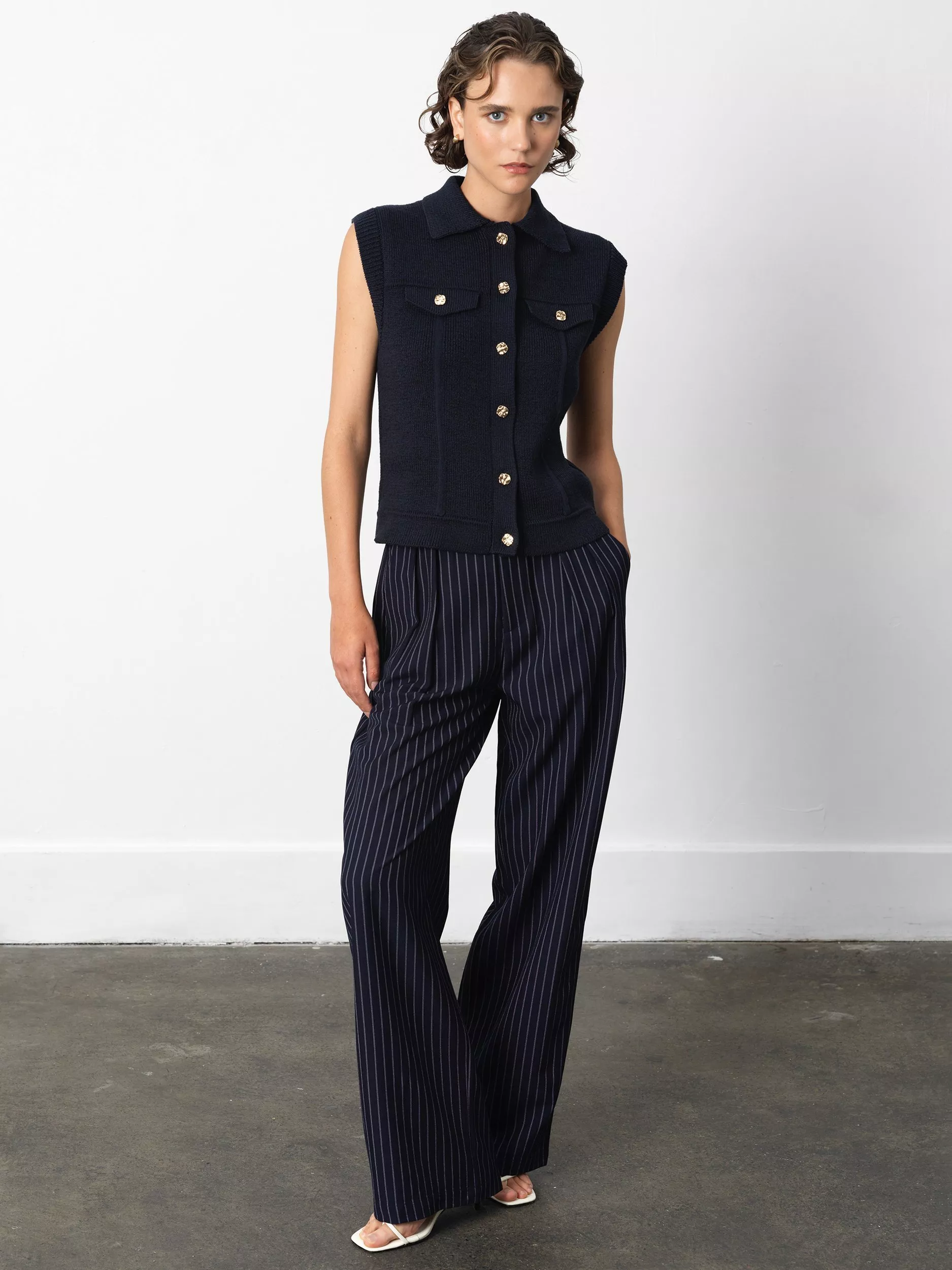 Power dressing meets chic styling with the Roland Knit Collared Gilet. This statement piece with a timeless edge presents a textured knit body with a structured collar and faux breast pockets, complemented by luxe gold tone buttons.
