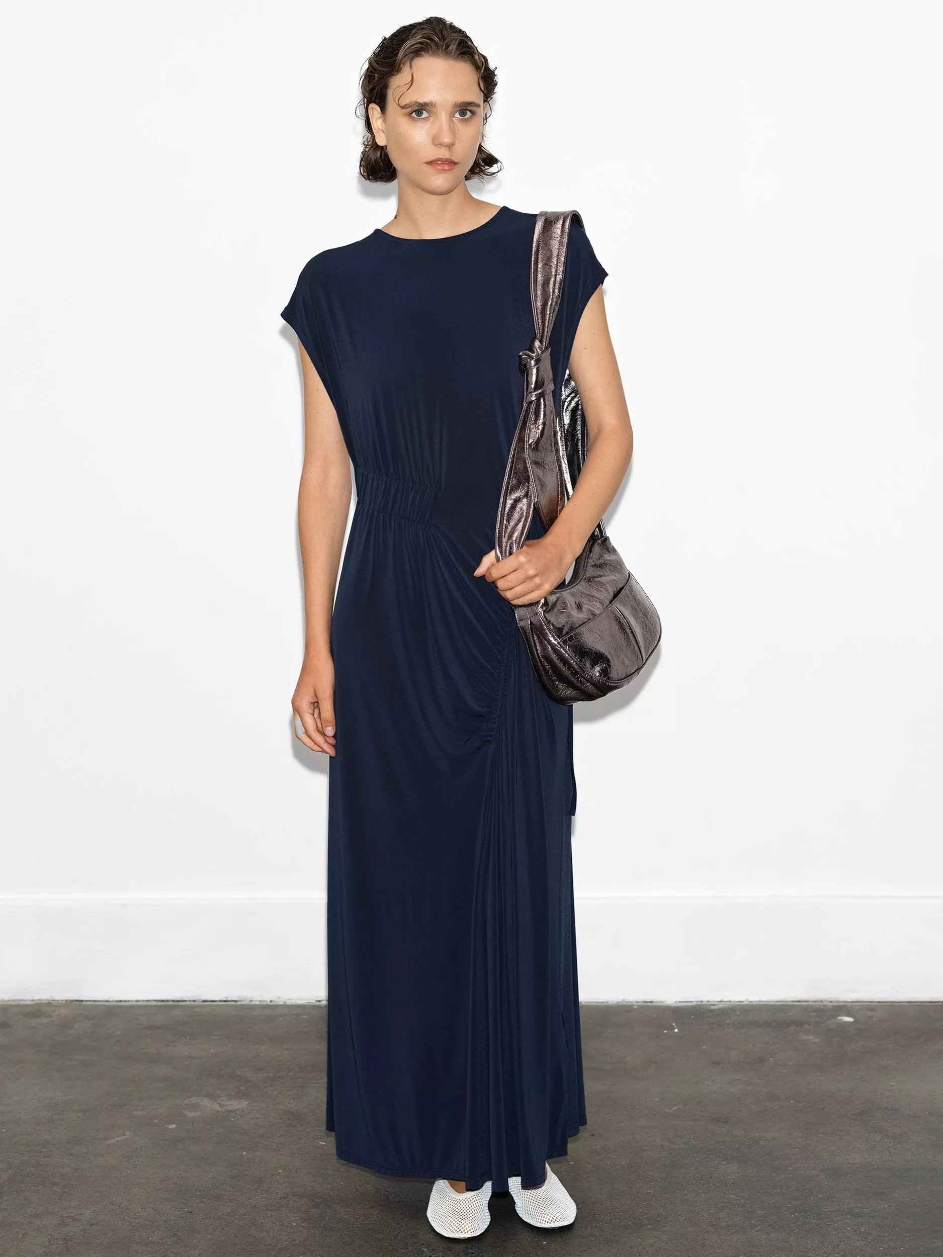 Relaxed meets refined. The Samira Jersey Gathered Maxi Dress features a draped silhouette with gathered ruching and adjustable side tie, for a flatteringly modern appearance.