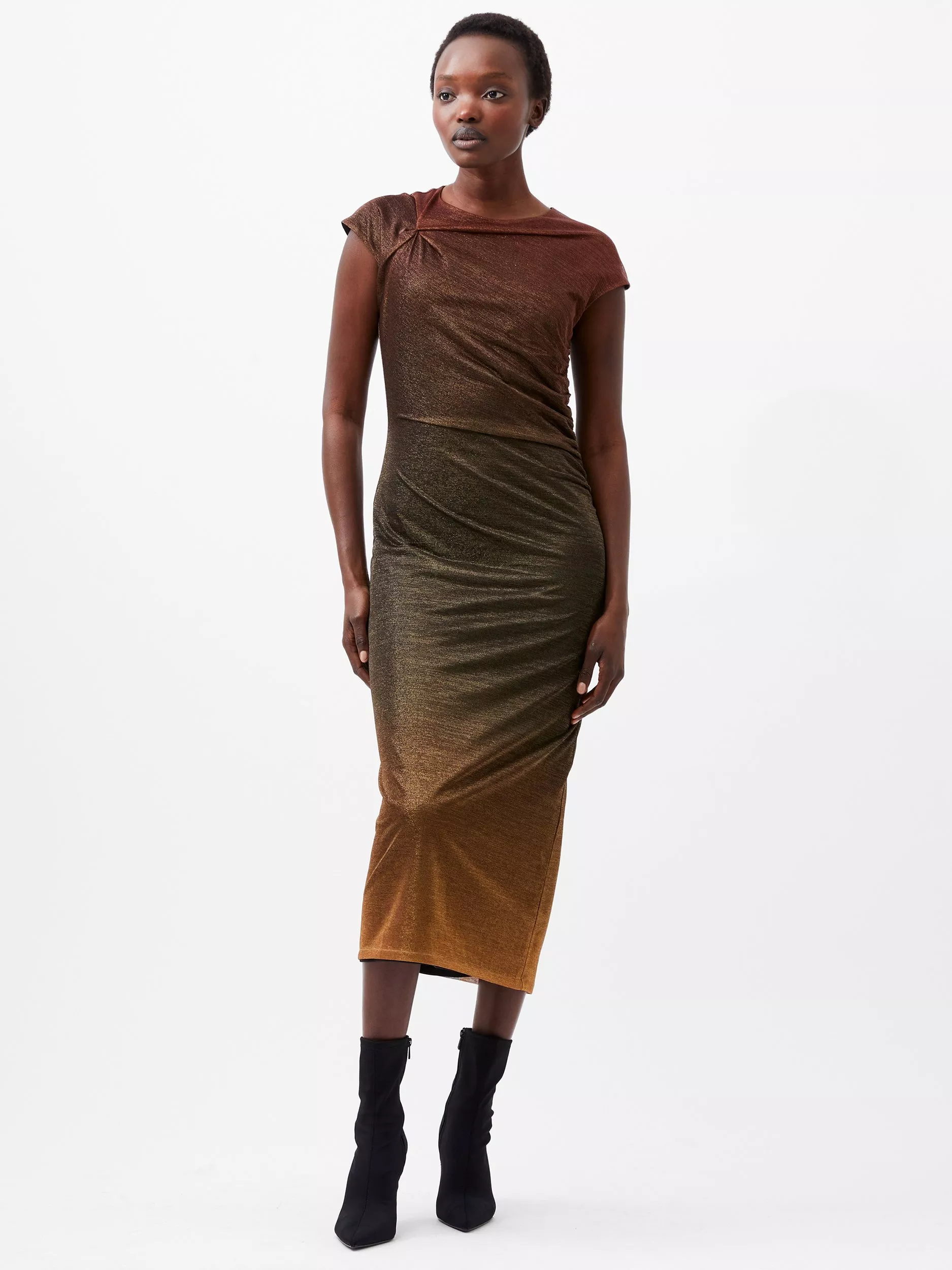French Connection's Sela Midi Dress is a metallic must-have for party season. This sparkling midi dress is ready to make a glistening entrance with its sophisticated silhouette starring in shimmering fabric. Framed by cap sleeves and a round neckline, this frock flaunts a shortened lining alongside flattering ruched side and shoulder twist details for a fashion-forward and complimentary figure.