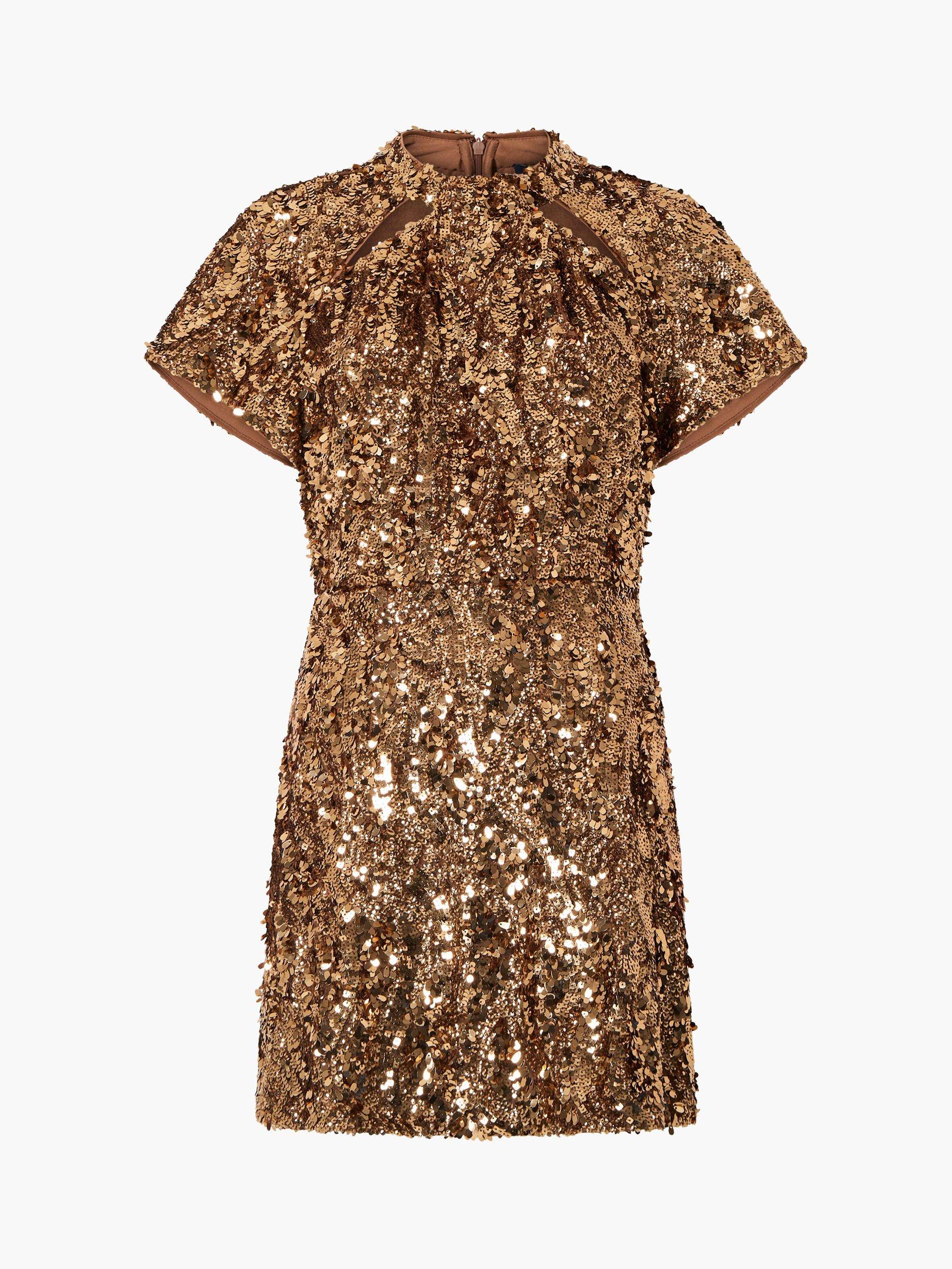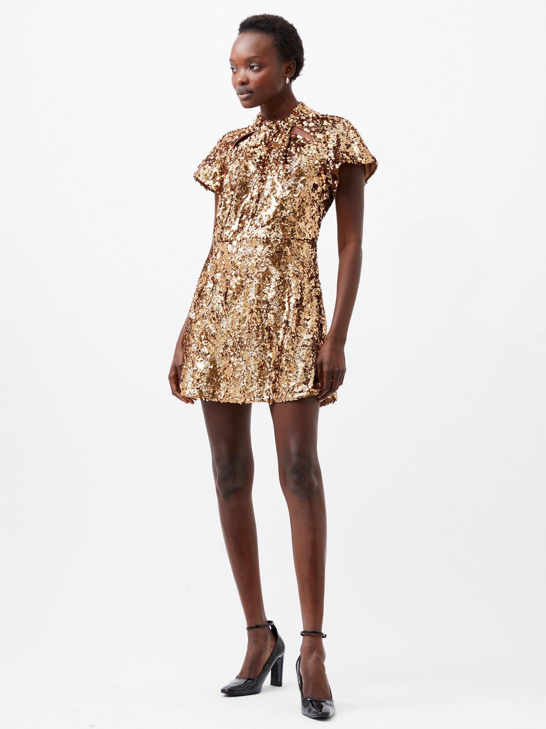 French Connection's Sequin Mesh Mini Dress adds the Midas touch to your wardrobe. This sparkling party dress is set to catch the light and cue compliments at every angle with sparkling sequins across a short sleeved silhouette. This playful sequin dress stars in the must-have metallic shade of the season, whilst a pair of keyhole cut outs offer a flirty finishing touch.