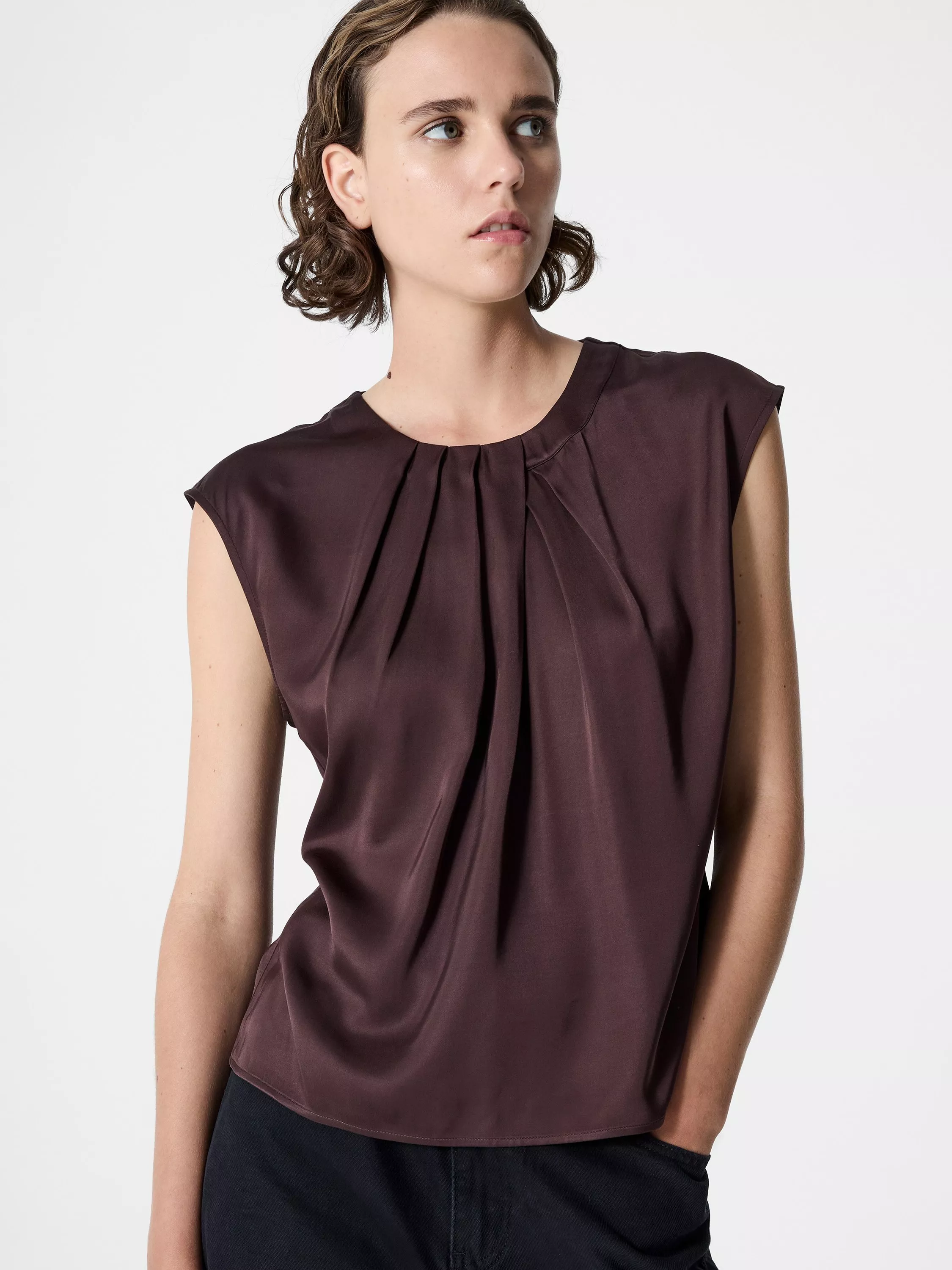 Effortless elegance meets subtle drama in the Sera Satin Pleated Sleeveless Blouse. This blouse exudes refinement with every movement with its sleeveless silhouette featuring delicate pleats and a fluid, silky drape.