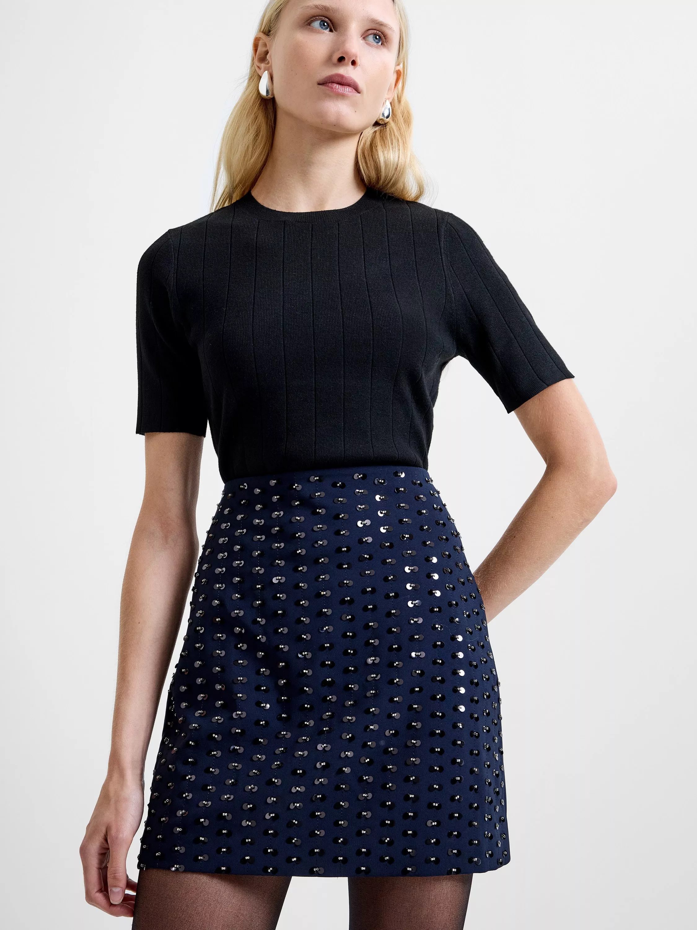 Short, sharp and ready to shine. The Sherry Embellished Mini Skirt presents a clean A-line cut with front glossy faceted embellishment for a standout sculptural look.