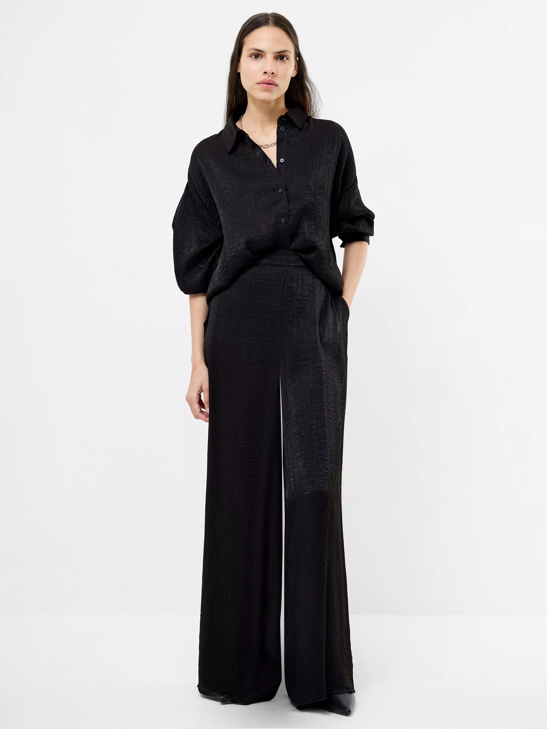 The Terry Crinkle Wide Leg Trousers bring confidence to every step. These high-waisted trousers star in a fluid crinkled fabric, presenting a wide leg silhouette hosted by an elasticated waist and equipped with side pockets.