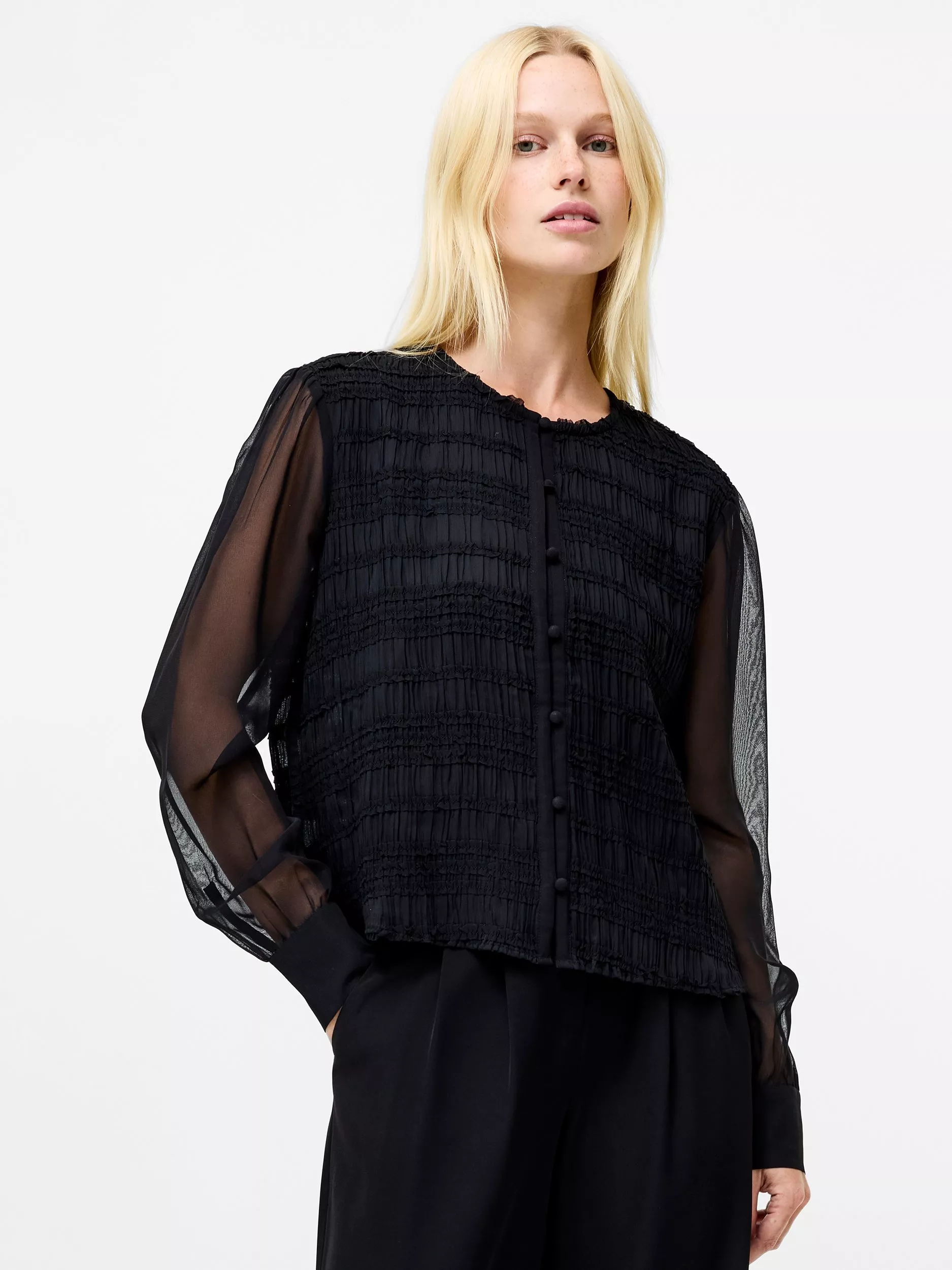 Texture meets transparency. The Canary Pleated Long Sleeve Shirt features a semi-sheer sleeve design and softly structured bodice with all-over puckered pleats, finished with fabric-covered buttons for a refinished finishing touch.