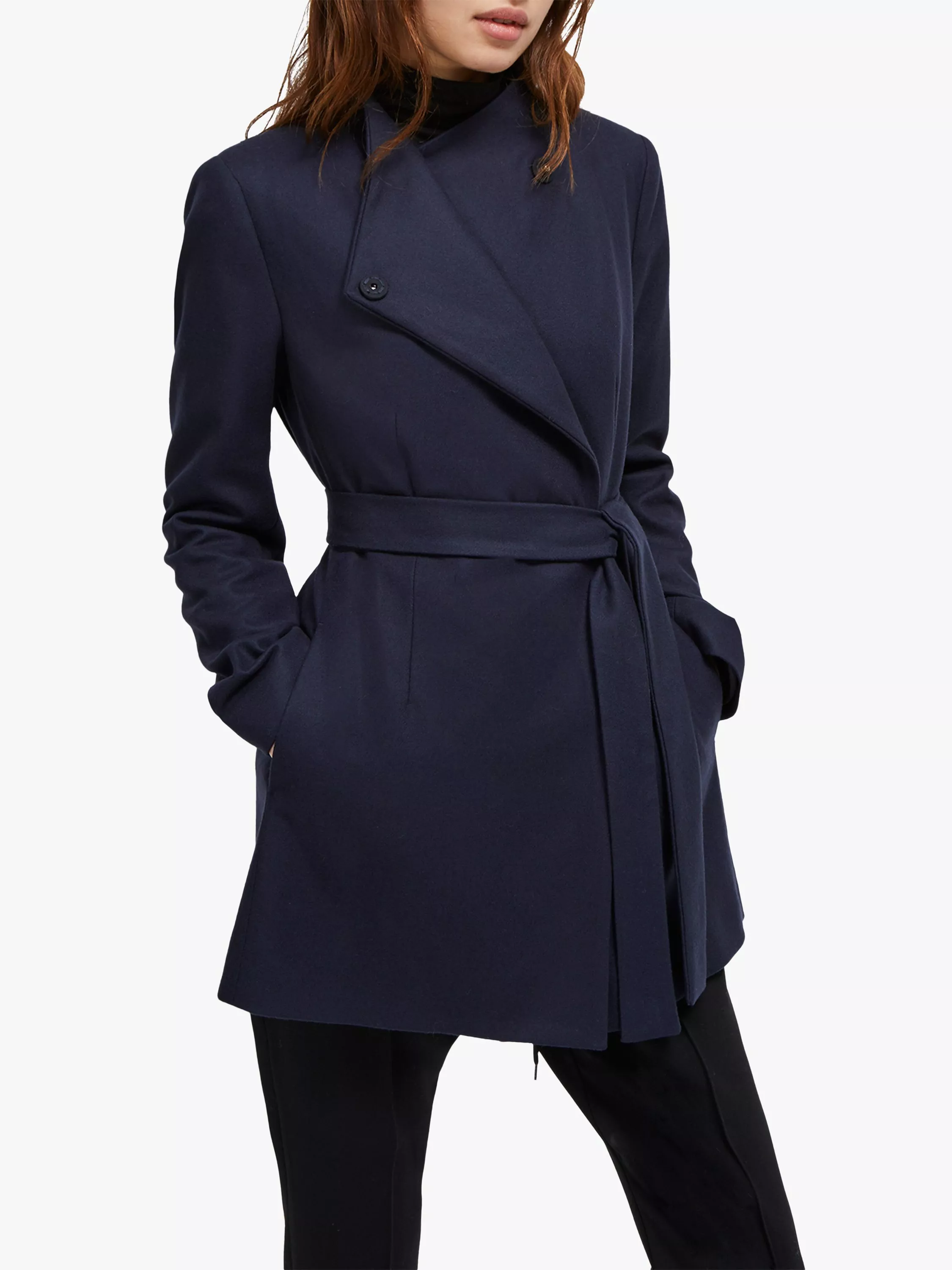 Crafted from wool-blend fabrication with a hint of cashmere for added luxury and softness, this coat from French Connection combines easy layering with staple style. Designed with a crossover neckline and a self-tie waist belt for a defined silhouette, wear with casual and formal ensembles for a polished look and enveloping warmth.