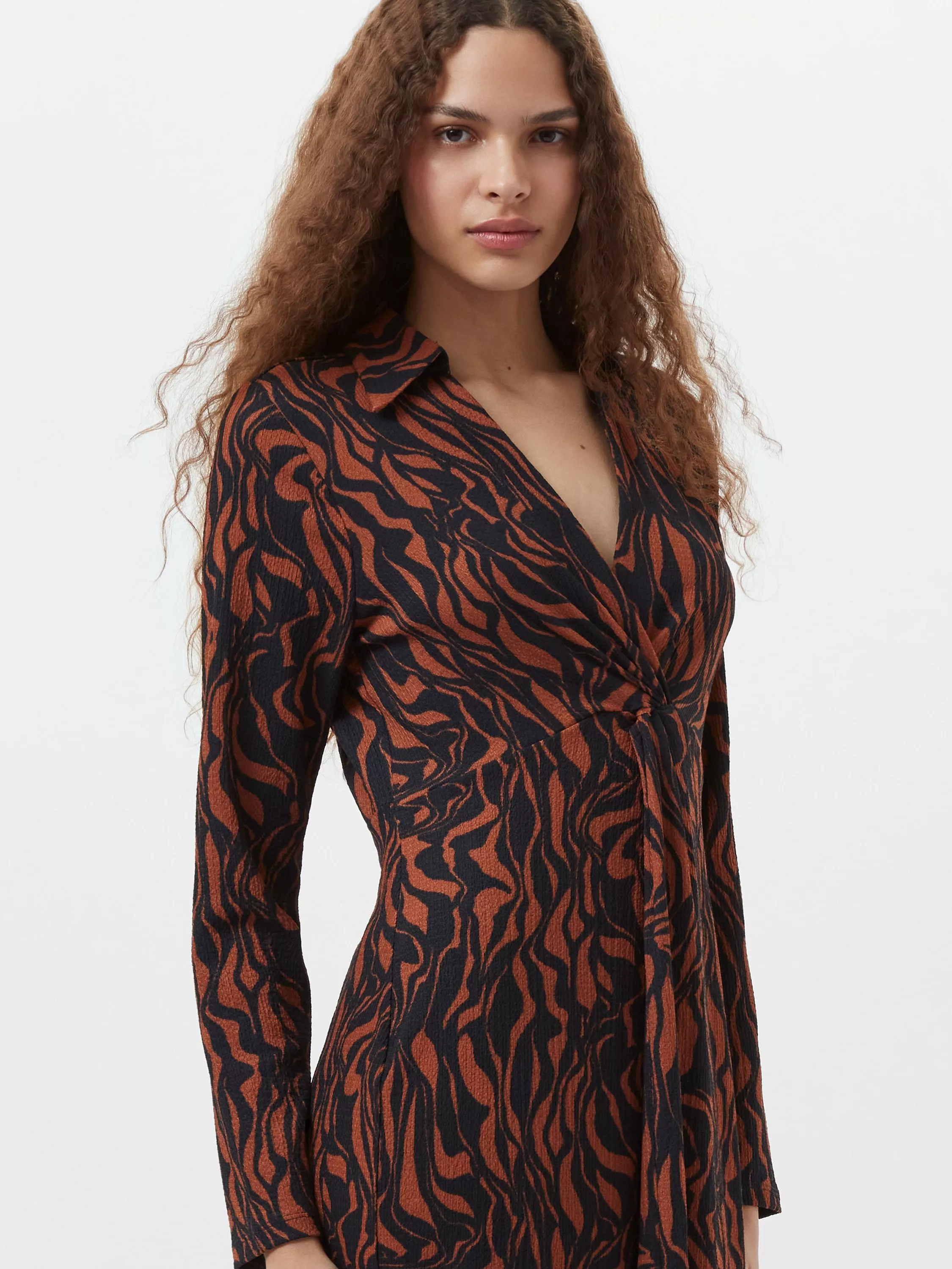 The rich tones of the Zaria Textured Midi Dress has us reaching for it on repeat. This sophisticated midi dress presents an abstract pattern across a textured body framed by long sleeves and a wrapover v neckline whilst featuring a pointed collar and empire waist.