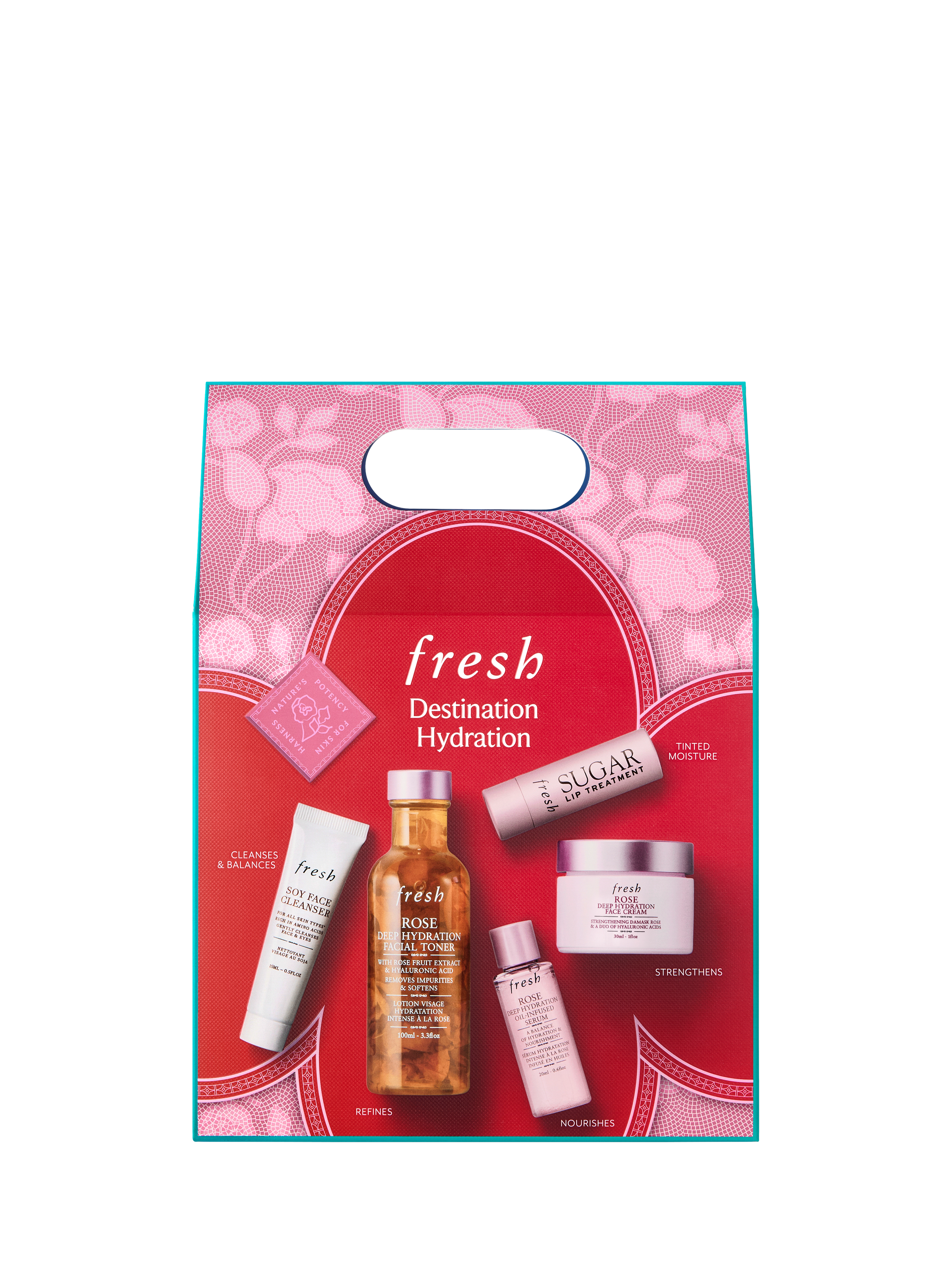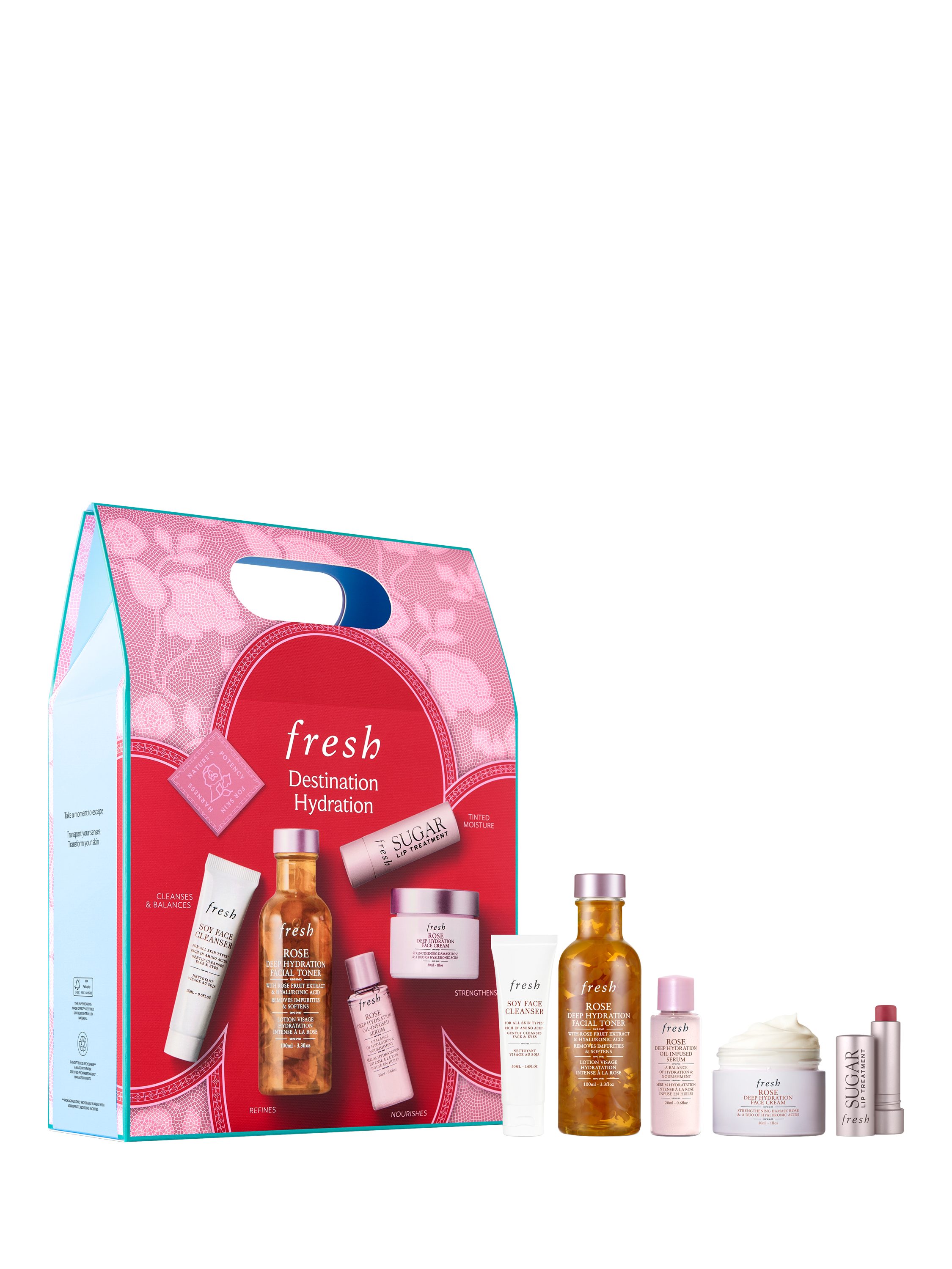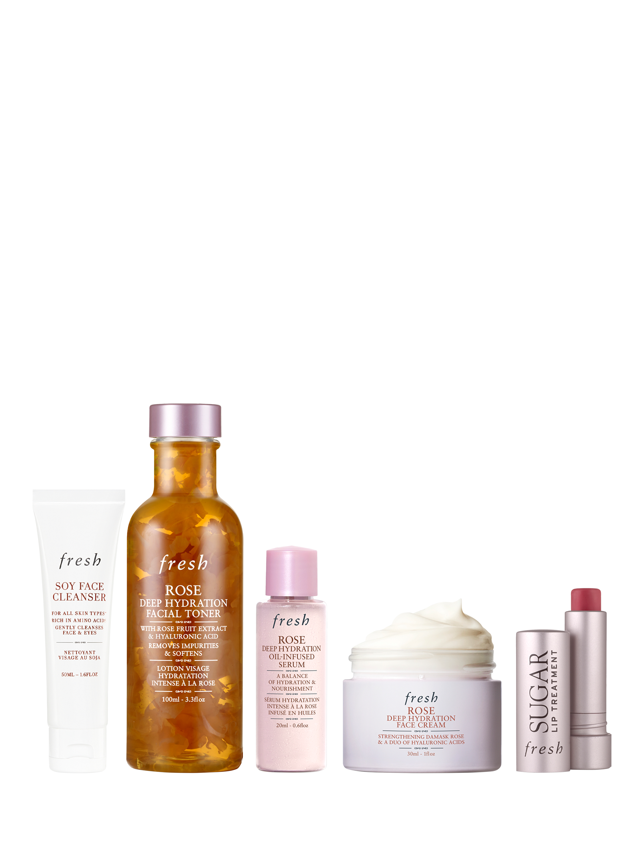 Embrace dewy hydration with this 5-piece set that includes exclusive set sizes of Soy Face Cleanser, Rose Serum & Rose Face Cream, travel-size Rose Toner, and full-size Sugar Lip Treatment in Rosé.