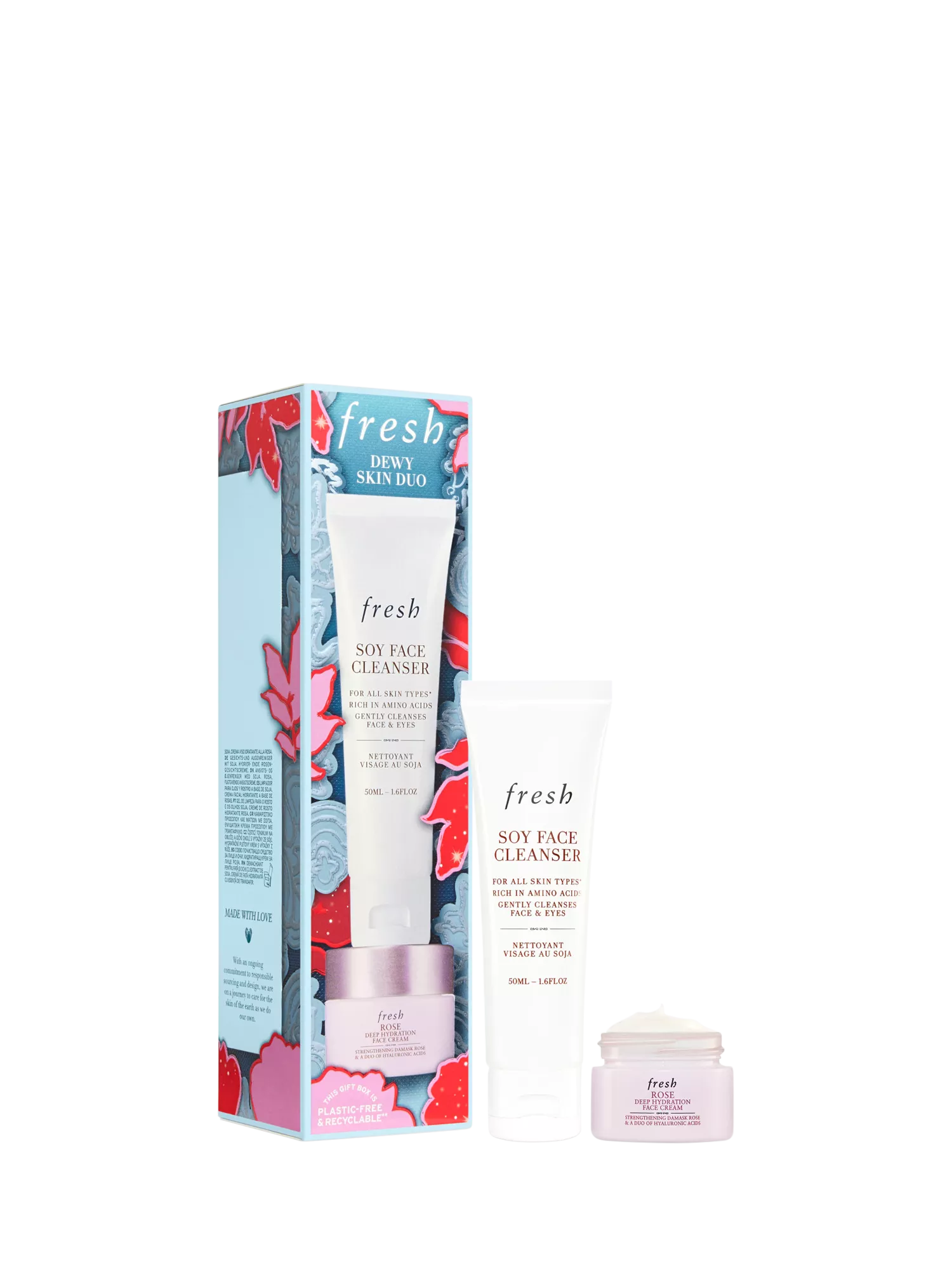 The fresh skin besties duo features everyday hydration essentials. Start with the best-selling, pH-balanced Soy Face Wash to gently cleanse and calm visible redness. Then smooth on Rose Face Cream to strengthen skin's barrier and deeply hydrate for dewy skin that's plumped with moisture.