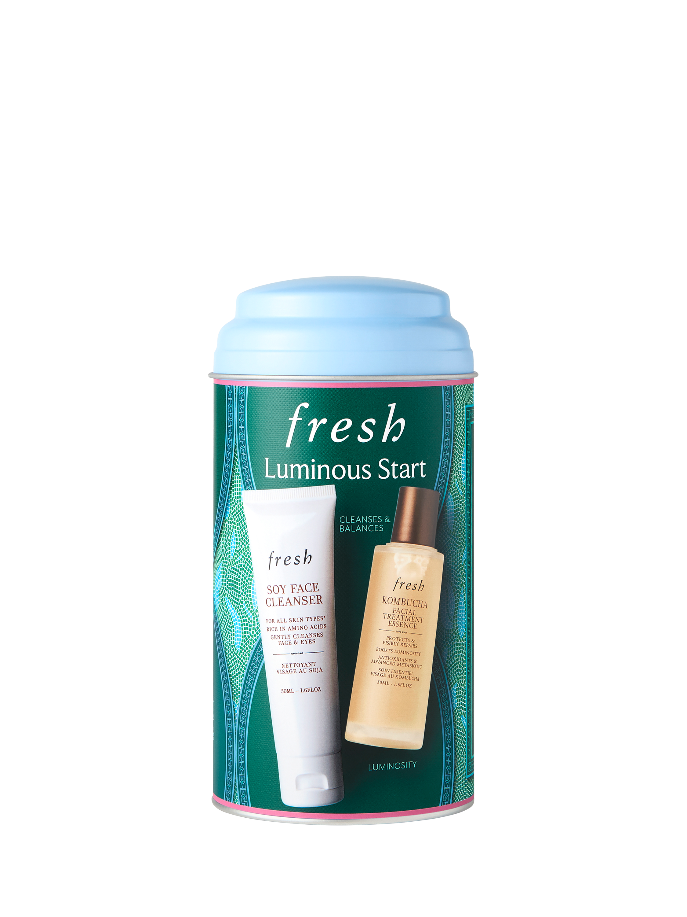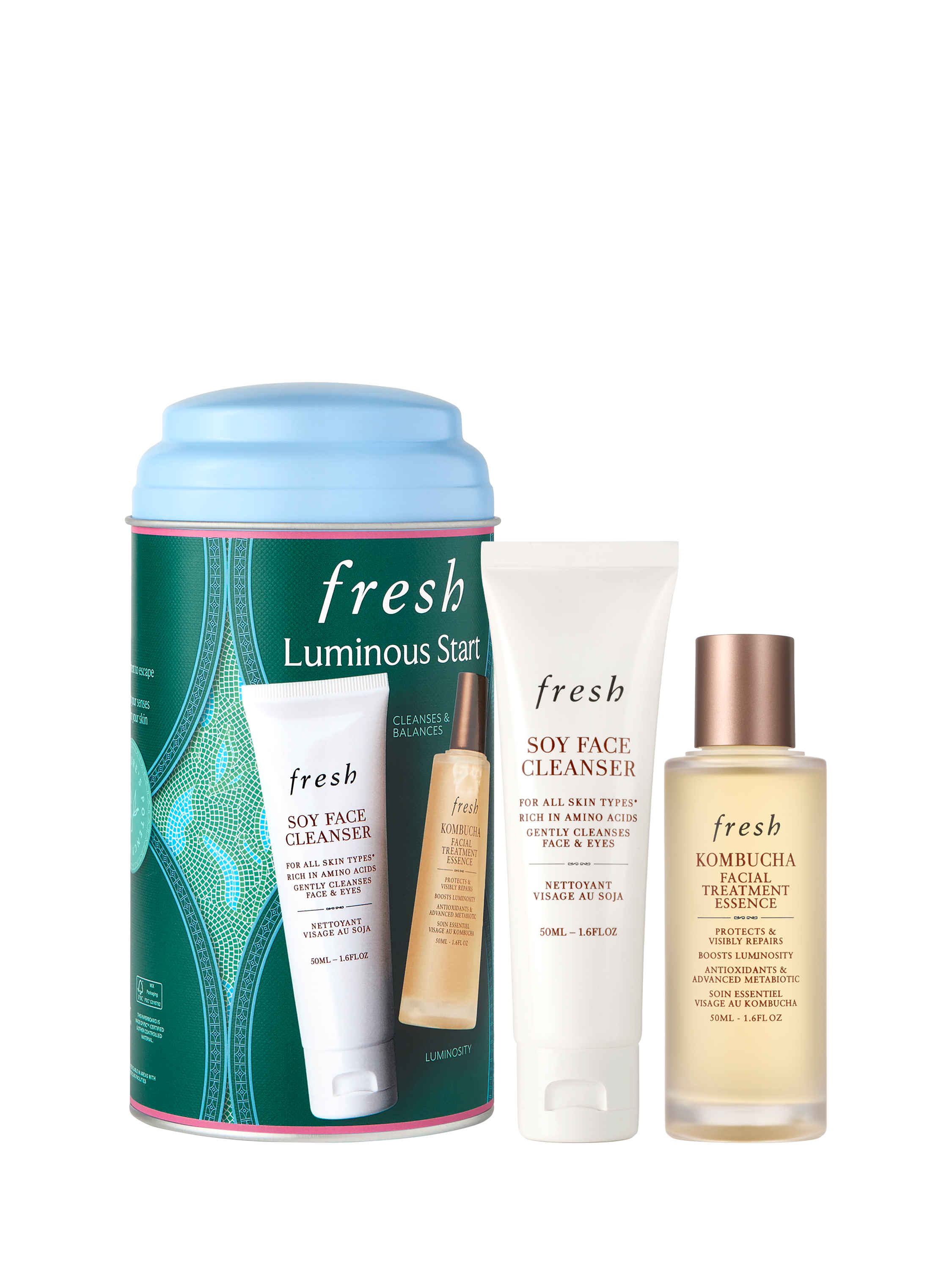 This skincare set features essentials for clean, luminous skin. Soy Face Cleanser removes makeup and SPF and boosts hydration, and antioxidant Kombucha Essence protects and visibly repairs to boost luminosity.