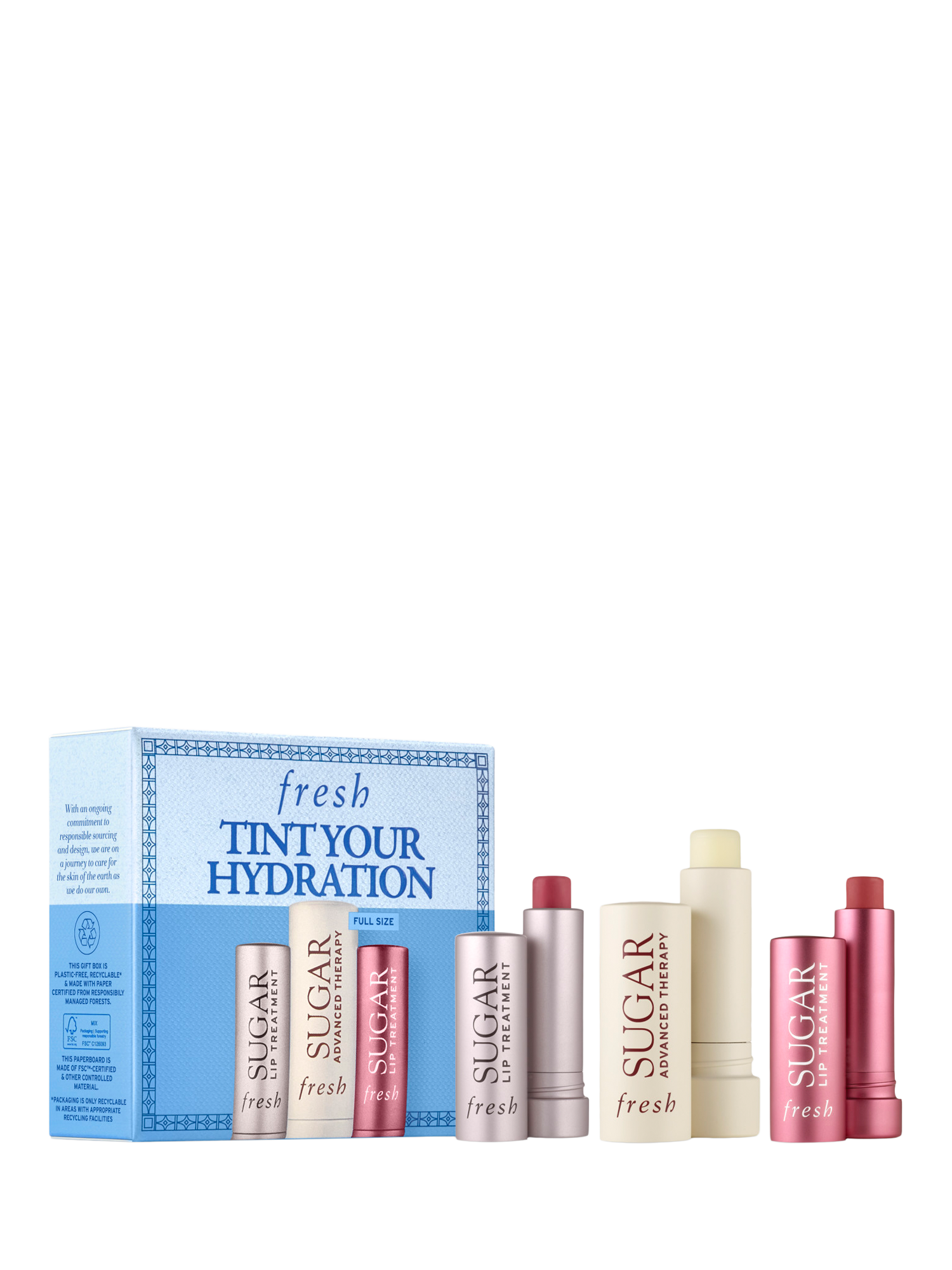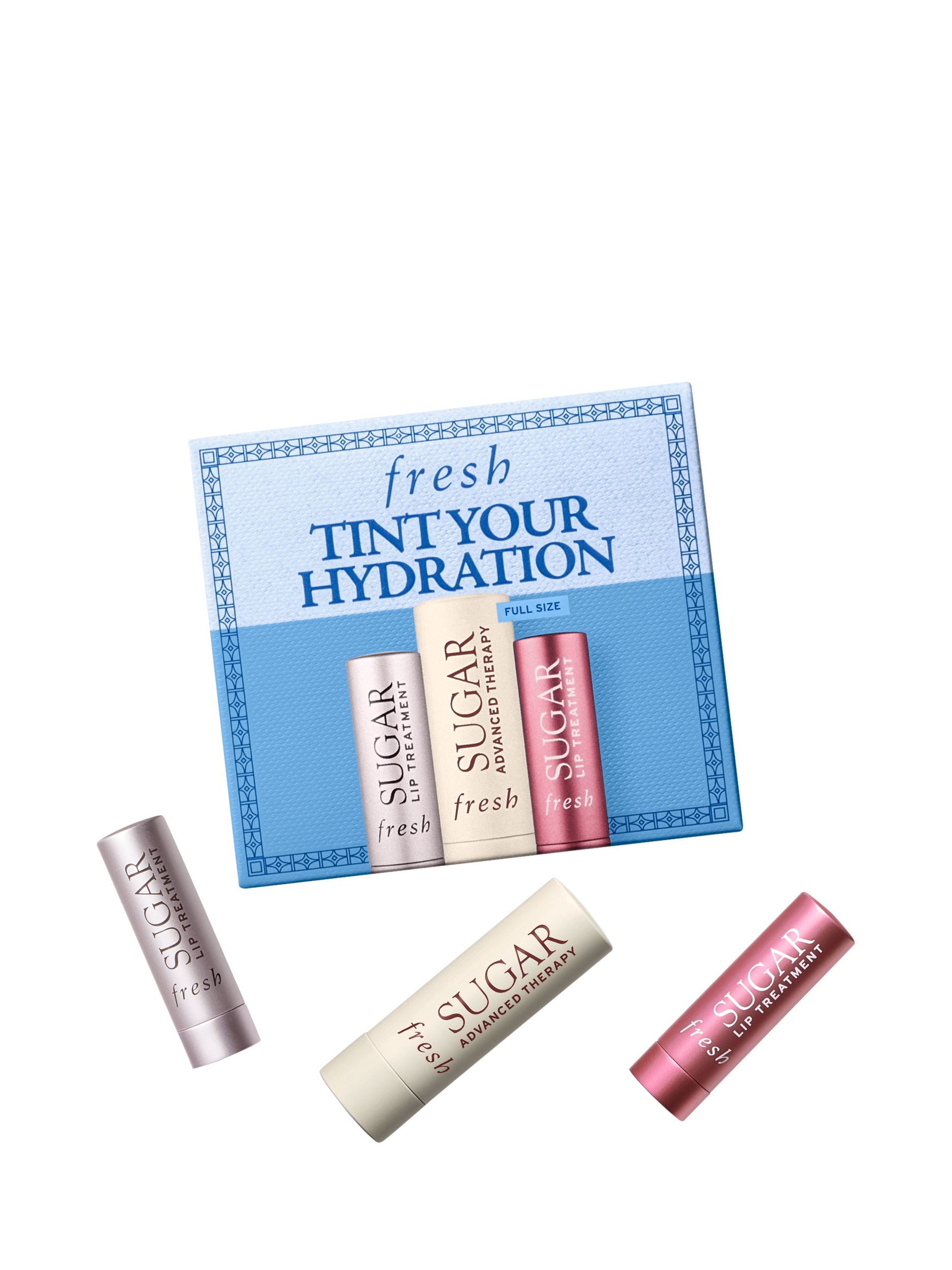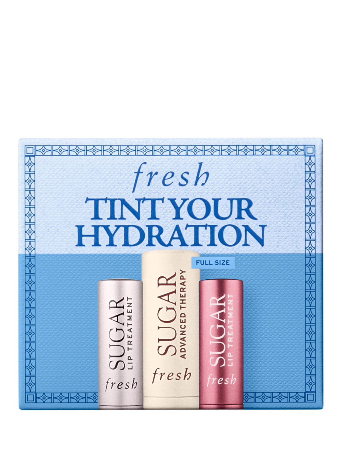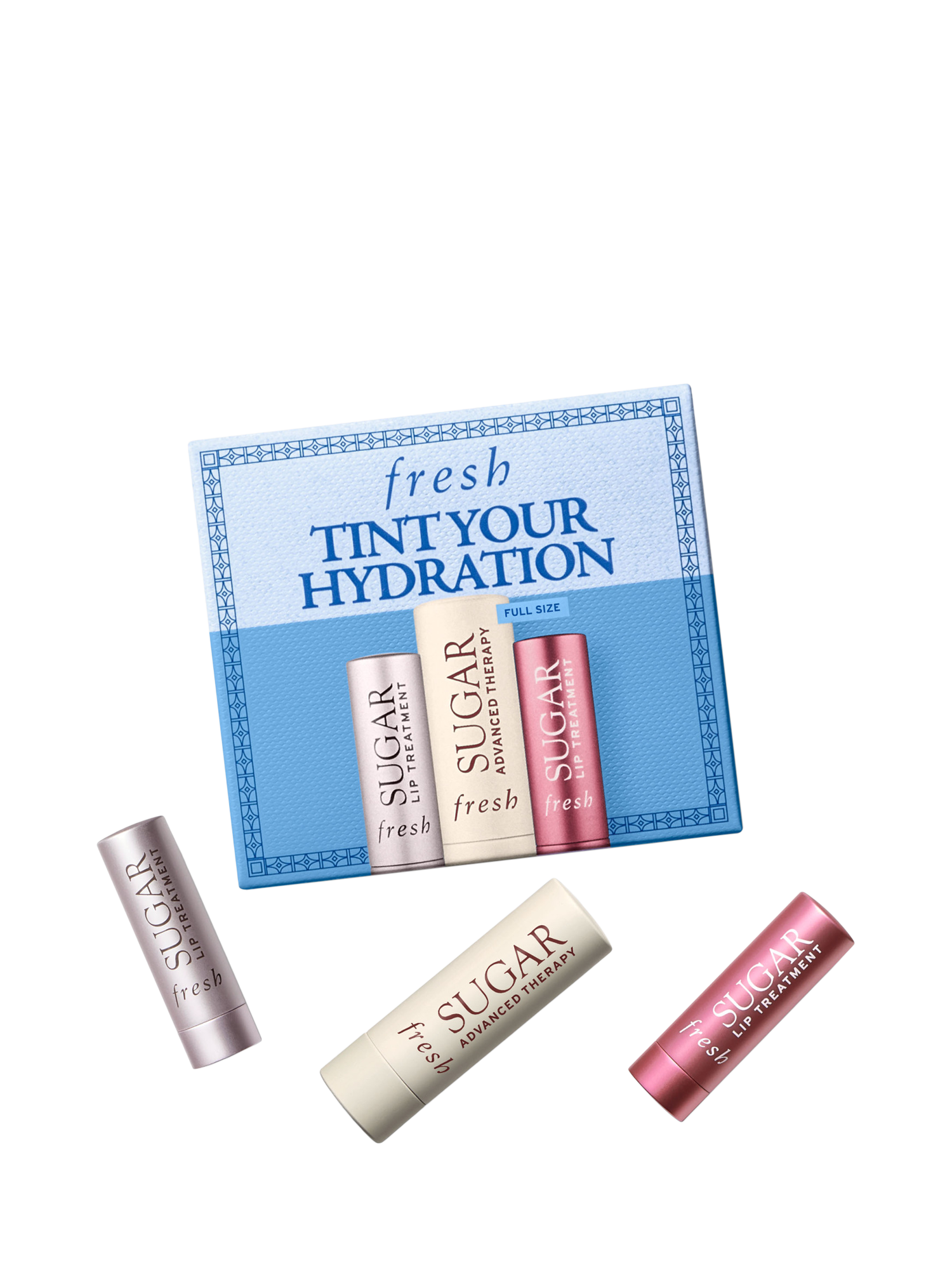 The Tint Your Hydration set is perfect for delivering buildable colour and all-day moisture. Visibly repair extra dry lips with our best-selling Sugar Advanced Therapy Treatment. Swipe on Sugar Rosé for a rosy glow or Bloom for a pink chrysanthemum tint.