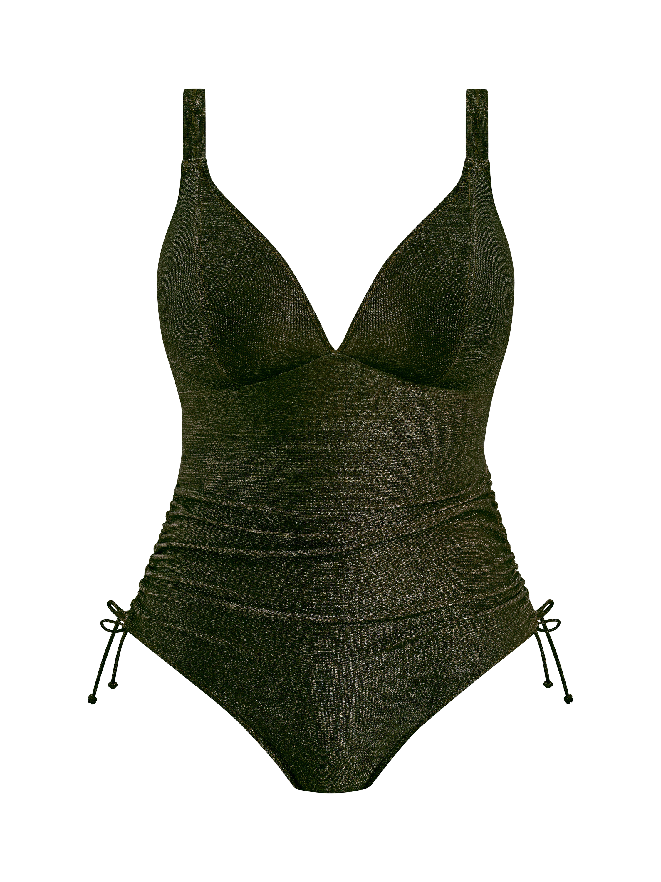 Crafted from metallic gold yarns to create a subtle shimmer, this non-wired swimsuit features a low plunging neckline, wing and clasp with a low scoop back, powernet lined cups for shaping and support and a scoop leg line for flattering coverage. Gathered side seam offers adjustability, and convertible straps allow this style to be worn over the shoulders or cross back.