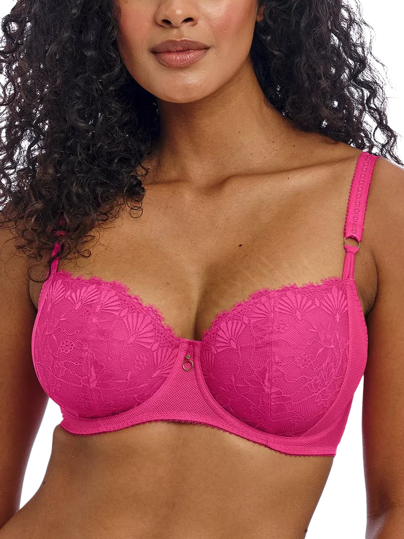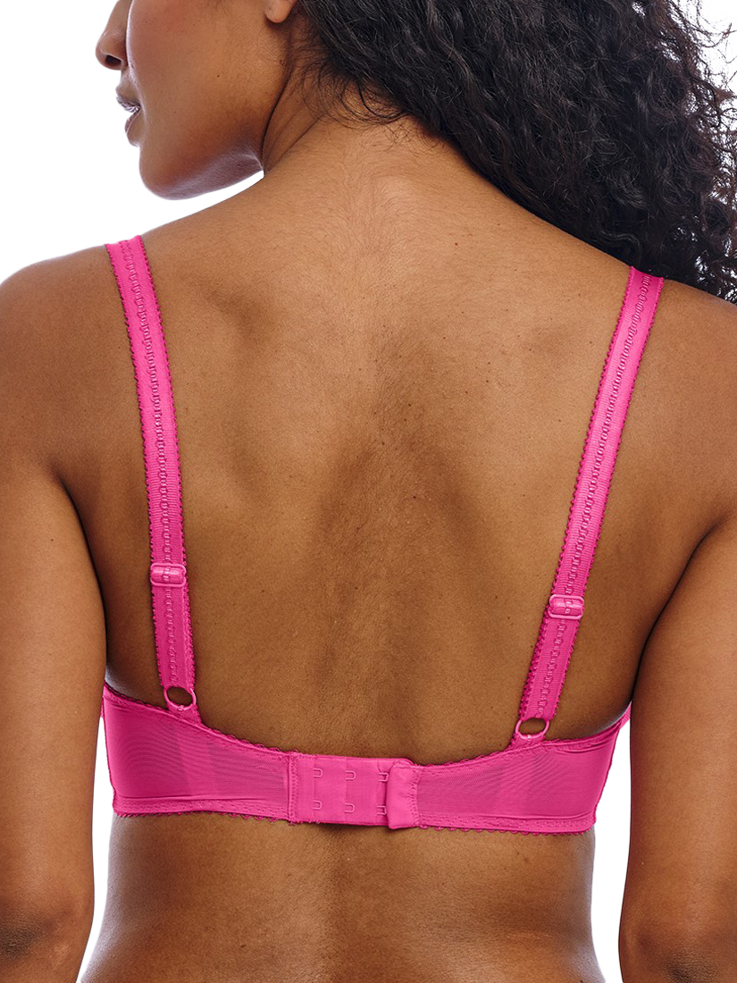 The Balcony Bra has a mid-coverage wire, designed to give a rounded uplift and fully lined cups for great shape and support. Fixed fully adjustable straps prevent strap slippage and a metallic ring and rouleau detailing at the apex complete the look.
