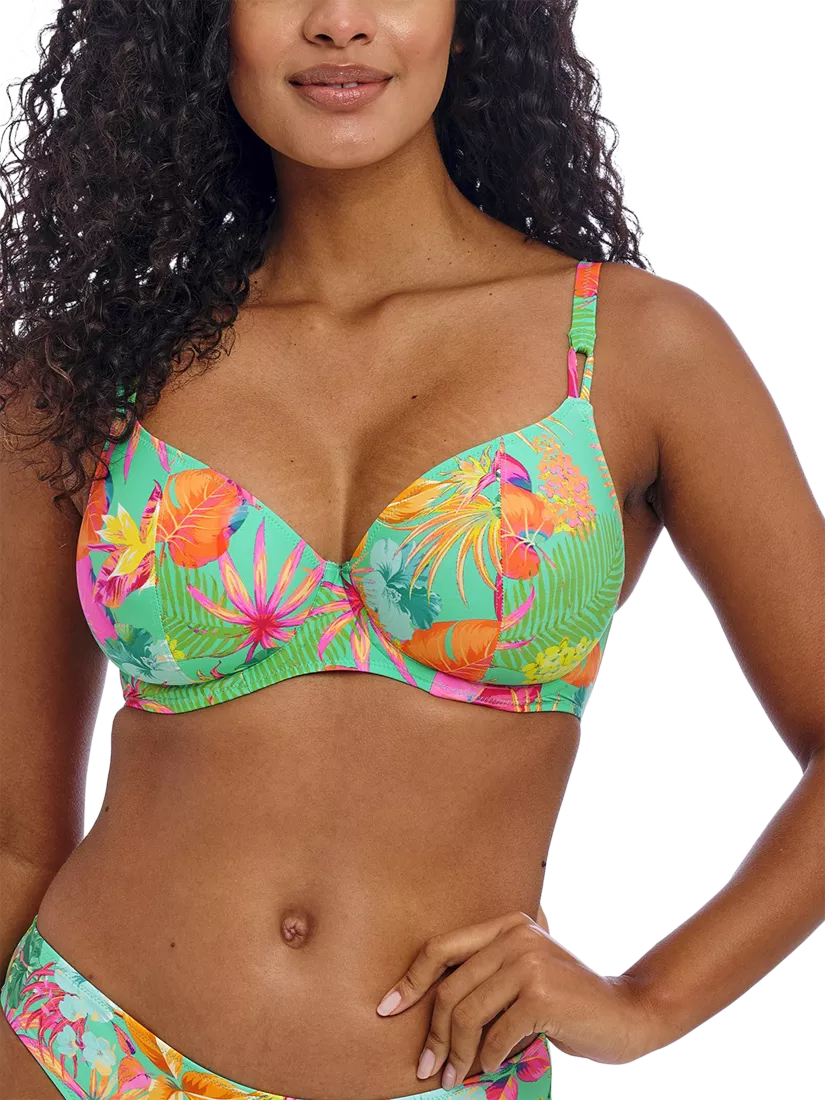 Hot pinks meet vibrant oranges and mangoes on a luscious jade ground for the perfect tropical fusion. The Plunge Bikini Top features a sexy low plunging neckline for less coverage, underwired lined cups for shape and support and fixed fully adjustable shoulder straps with front loop detail.