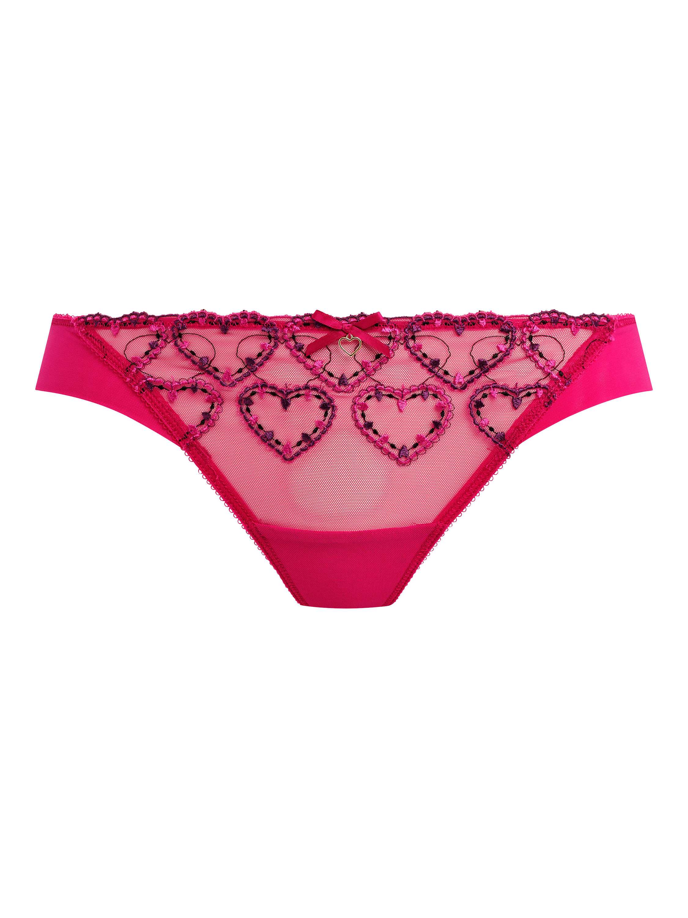 The Brazilian brief features a double layer mesh back and sides with folded leg edge for smooth finish and minimal VPL, the gold coloured heart charm and satin bow at centre front complete the look.