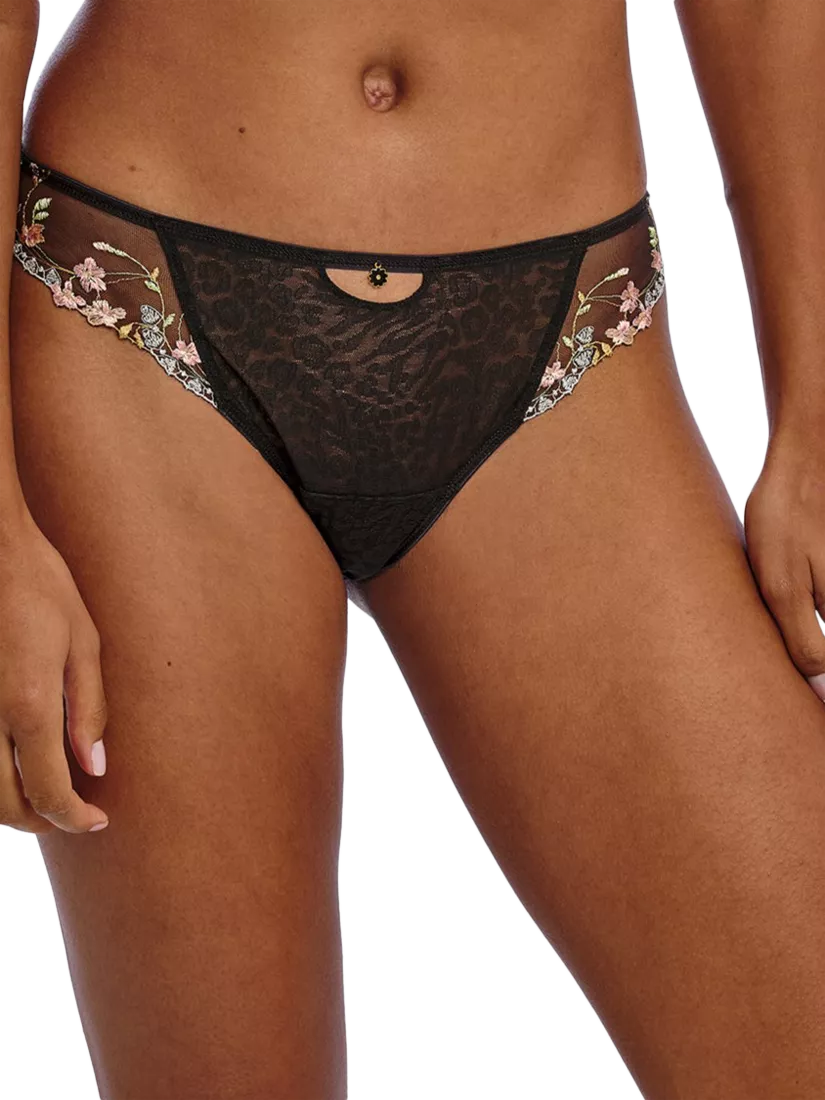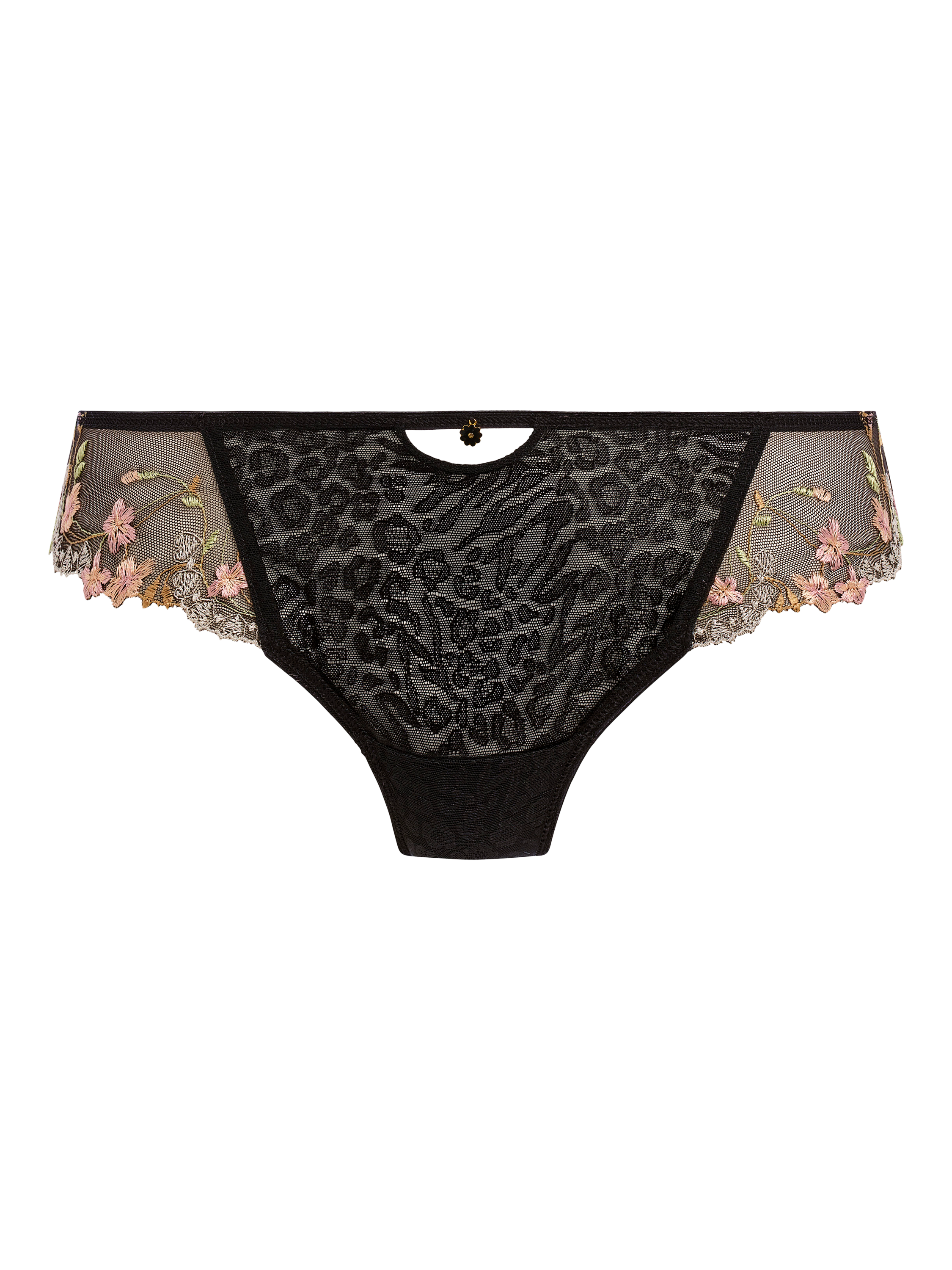Love-Haze pairs a multicoloured floral and Lurex metallic heart embroidery with a gorgeous animal patterned stretch lace. The Brief features a keyhole detail at the centre front and a gather in the back seam for shaping. The double layer mesh back with folded leg edge offers a smooth finish for minimal visible pant line and a floral enamel charm at the centre front completes the look.
