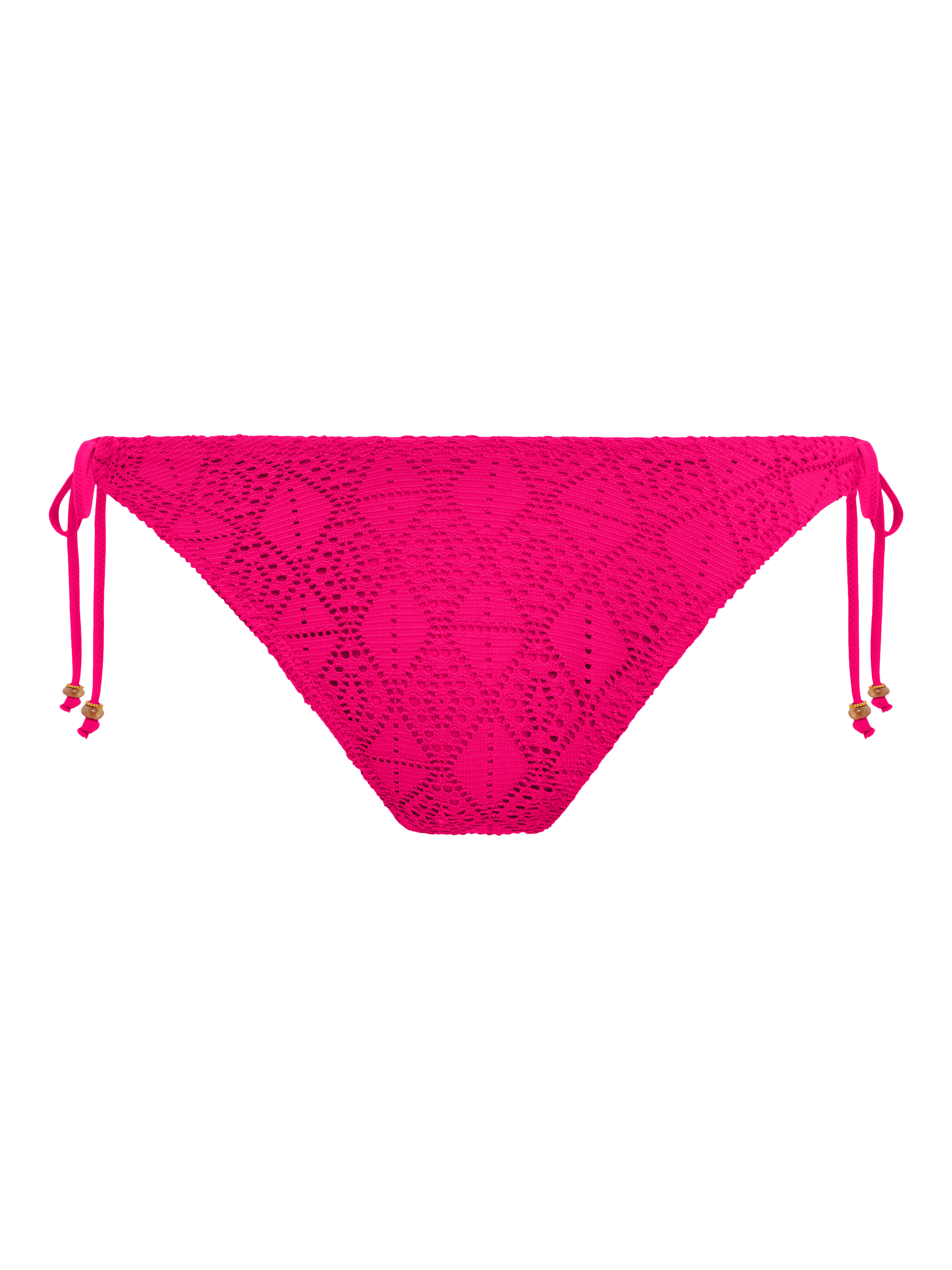 The High Leg Bikini Brief sits high on the hips and has a higher scoop leg line for reduced coverage. It also has narrow, adjustable sides and plastic bead and decorative metal trims on the end of the ties.