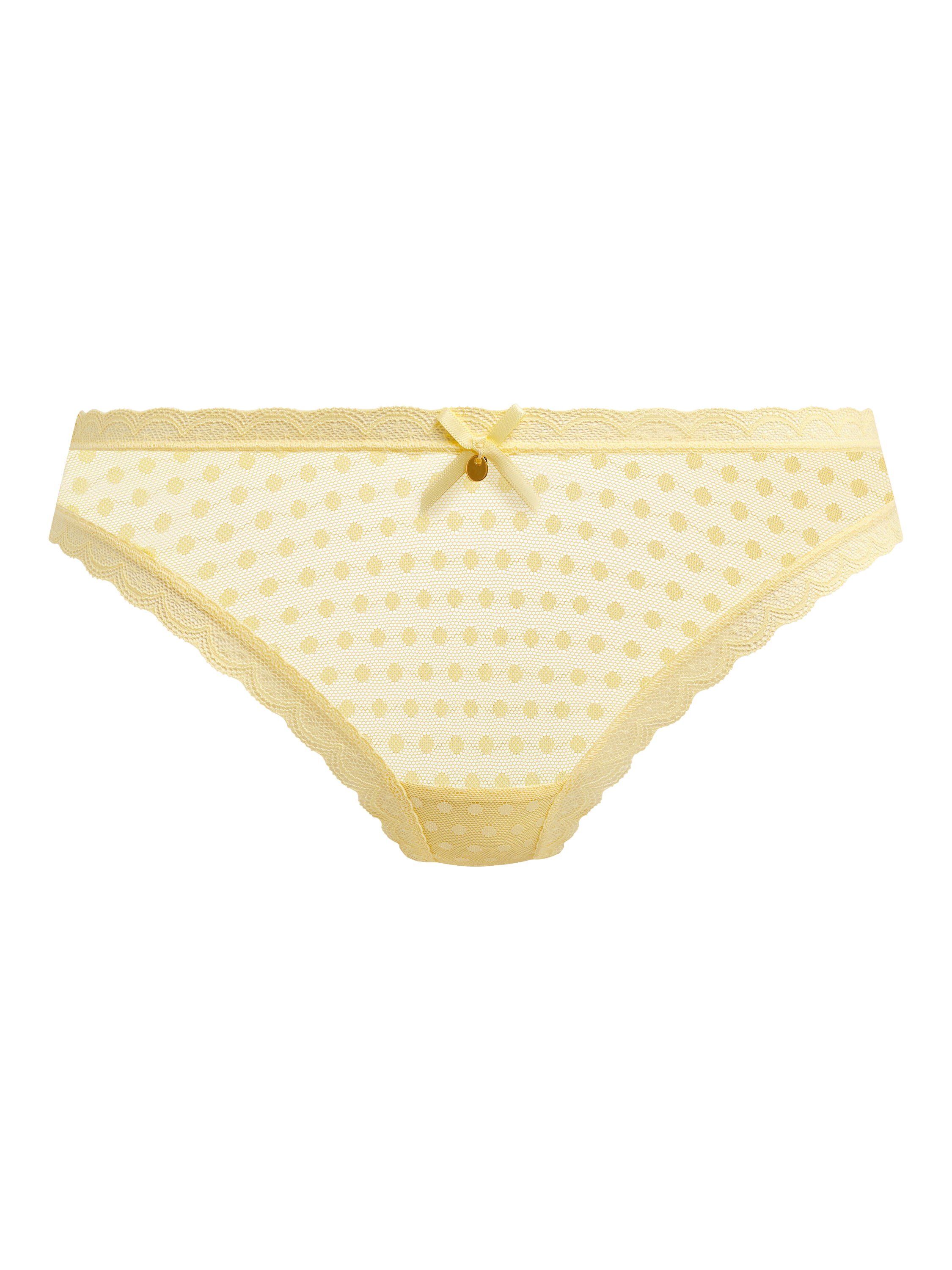 Spot-Light is an all-lace collection from Freya featuring a spot mesh design paired with a delicate lace trim. The brief features stretch lace trim at the waist and legs. A satin ribbon bow with gold coloured disc charm at the centre front completes the look.