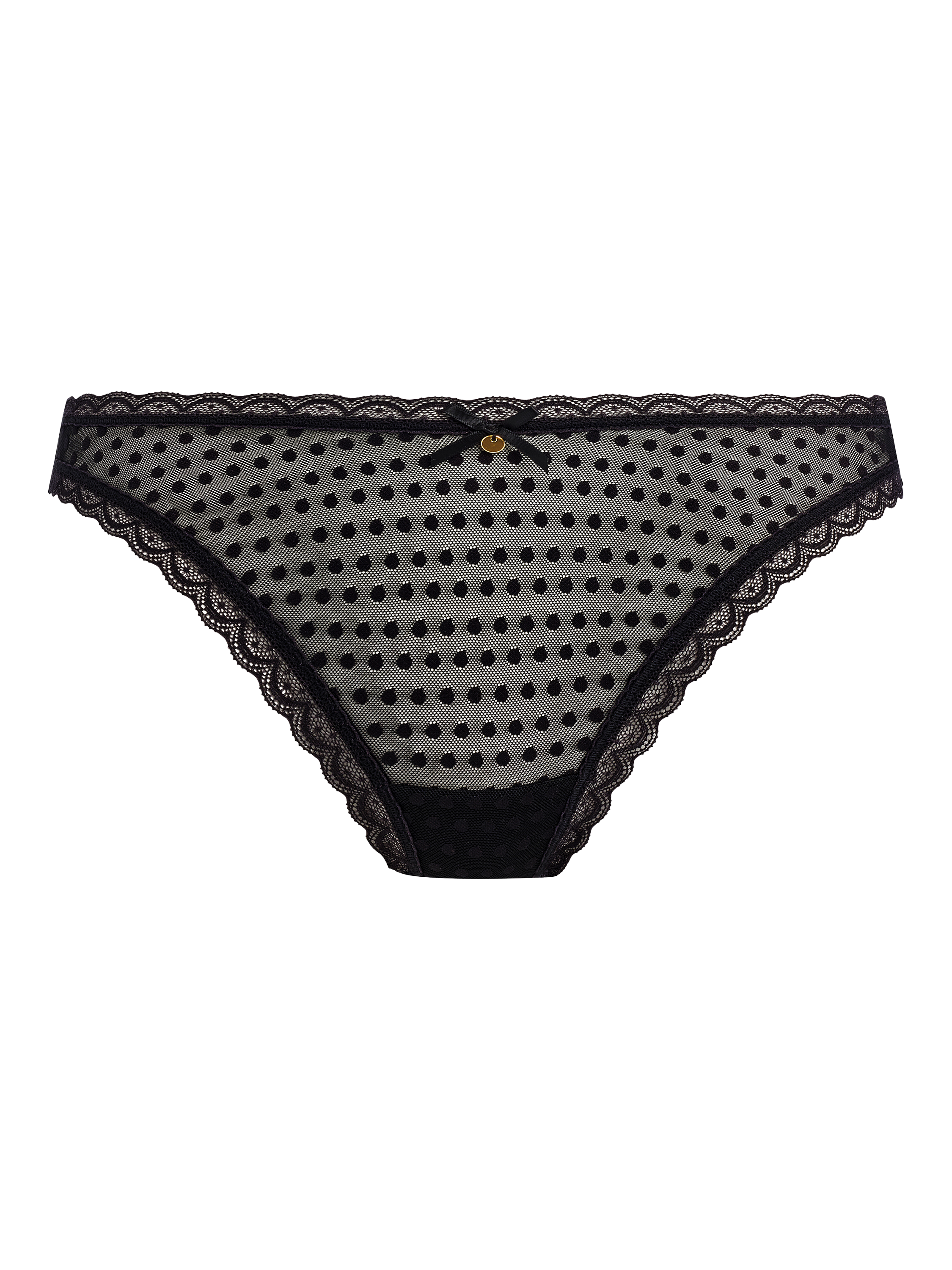 Freya's new all-lace collection features a spot mesh design paired with a delicate lace trim. The high leg brief sits high on the hips and features stretch lace trim at the waist and legs. Satin ribbon bow with gold coloured disc charm at the centre front completes the look.