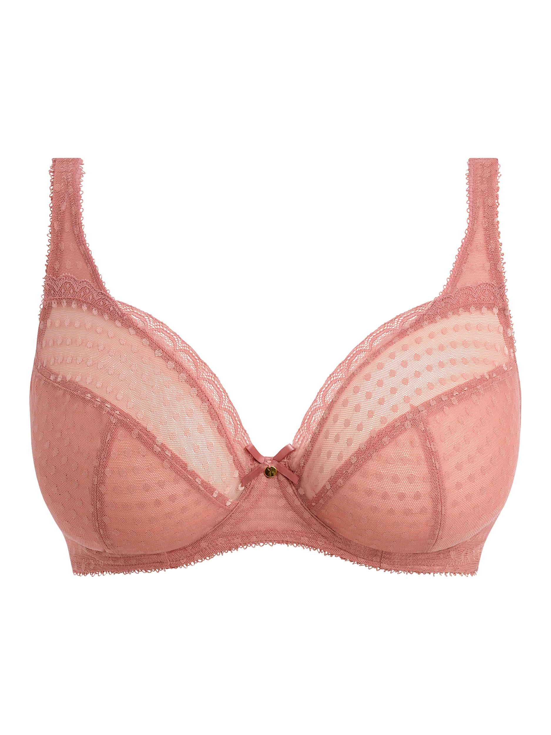 Freya's all-lace collection features a spot mesh design paired with a delicate lace trim. This underwired bra features a new plunge shape with lower wire at centre front, flattering neckline for a beautiful shape and fixed, fully adjustable straps to prevent strap slippage. Satin ribbon bow with gold coloured disc charm at the centre front completes the look. 2-hook fastening on all sizes.