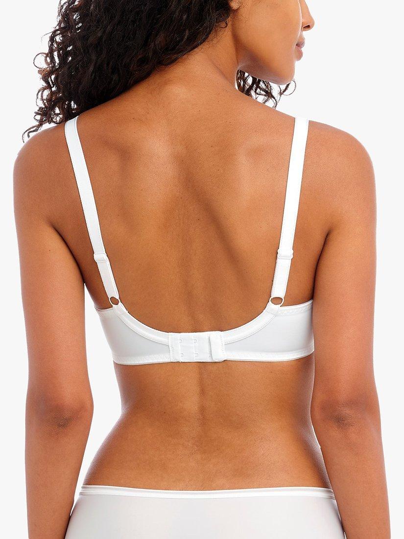 Four part cups are crafted from a luxurious semi sheer fabric to give a delicate feeling on the skin. Side support panels on the cups offer forward projection, while soft stretch elastics at neck edge allow for a secure fit.