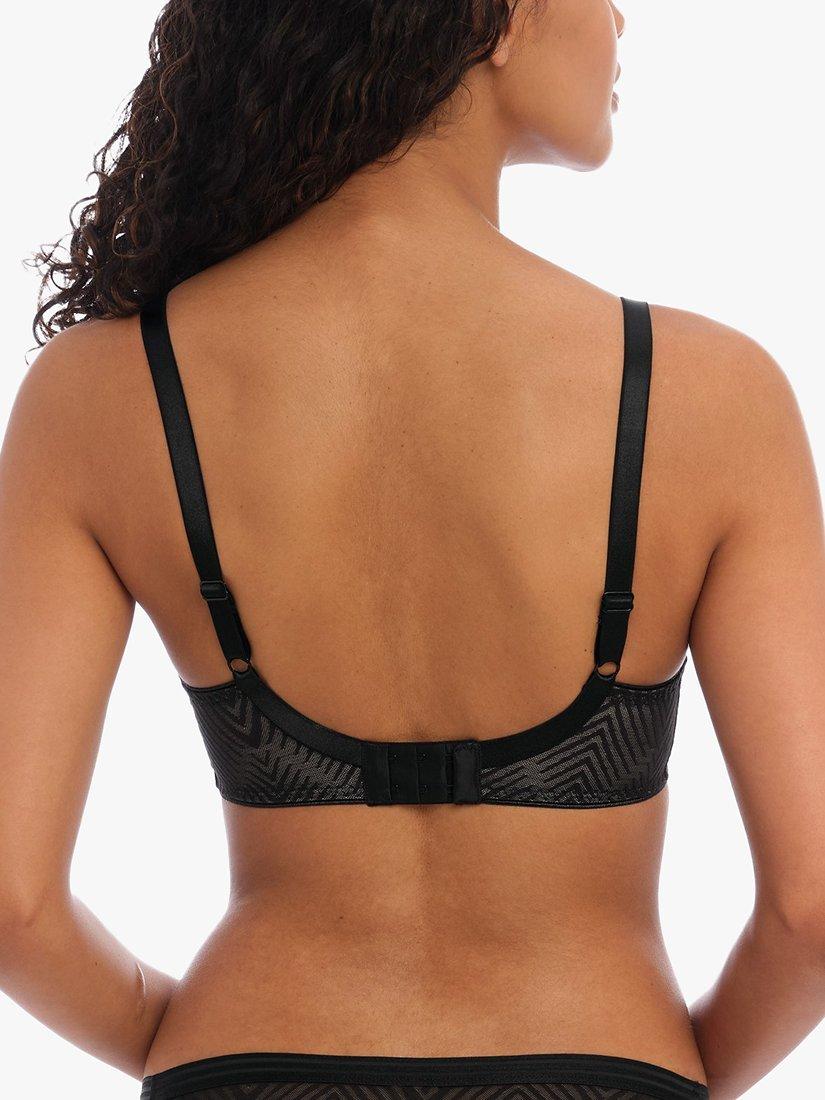 The plunge frame is made from a rigid semi-sheer net for a lighter look without loss of support and the stretch geo-lace outer cup creates the high apex and gives forward projection. Fully adjustable straps prevent strap slippage.