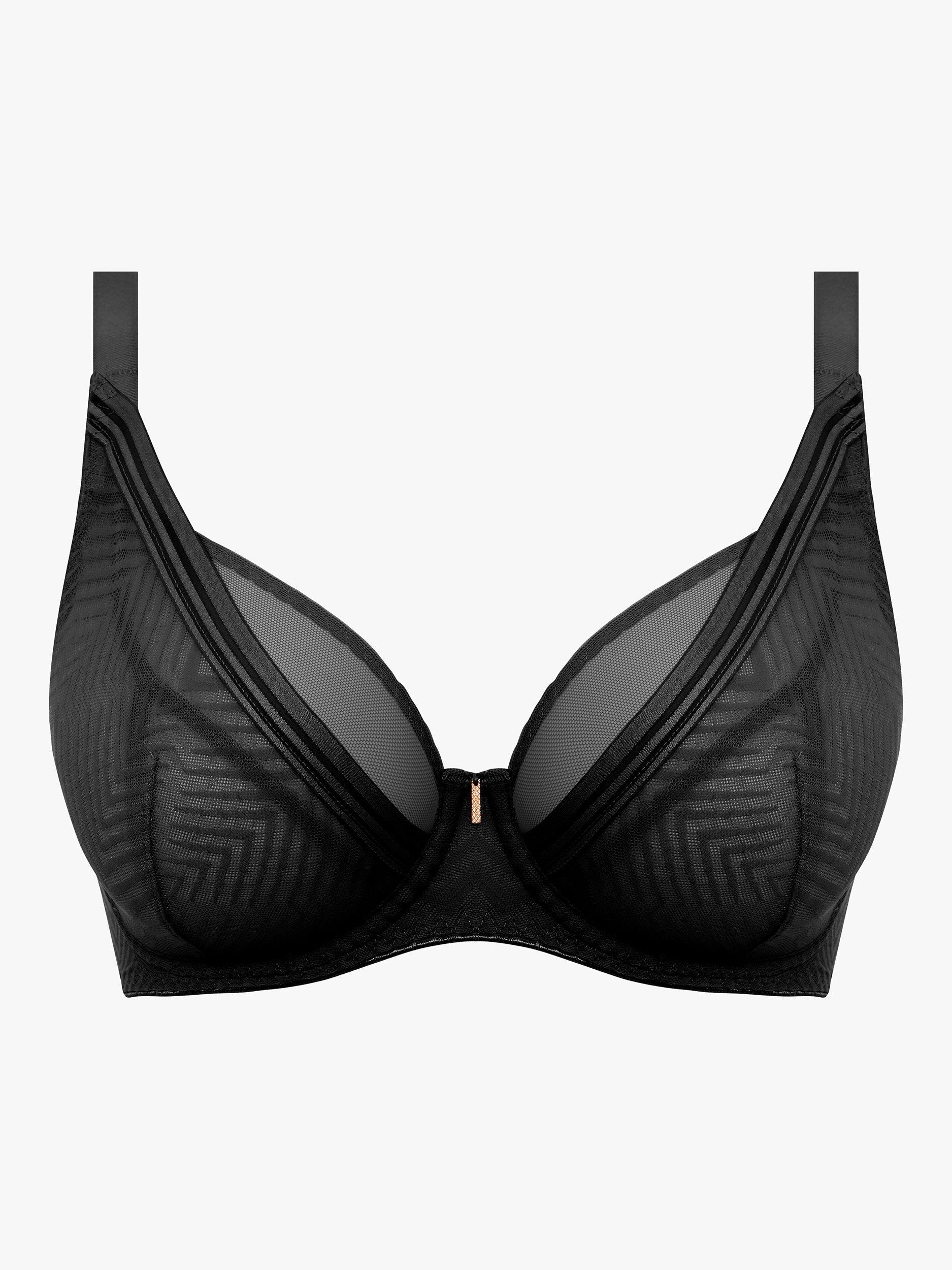 Tailored features contemporary styling with a geometric mesh lace overlay, teamed with either a tonal or contrast base. The underwired high apex plunge bra has a flattering low neckline with a rose gold bar trim detail at the centre front and flat shadow striped elastic along the neck edge.