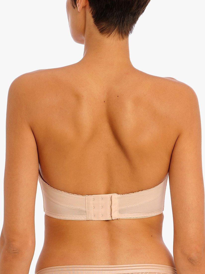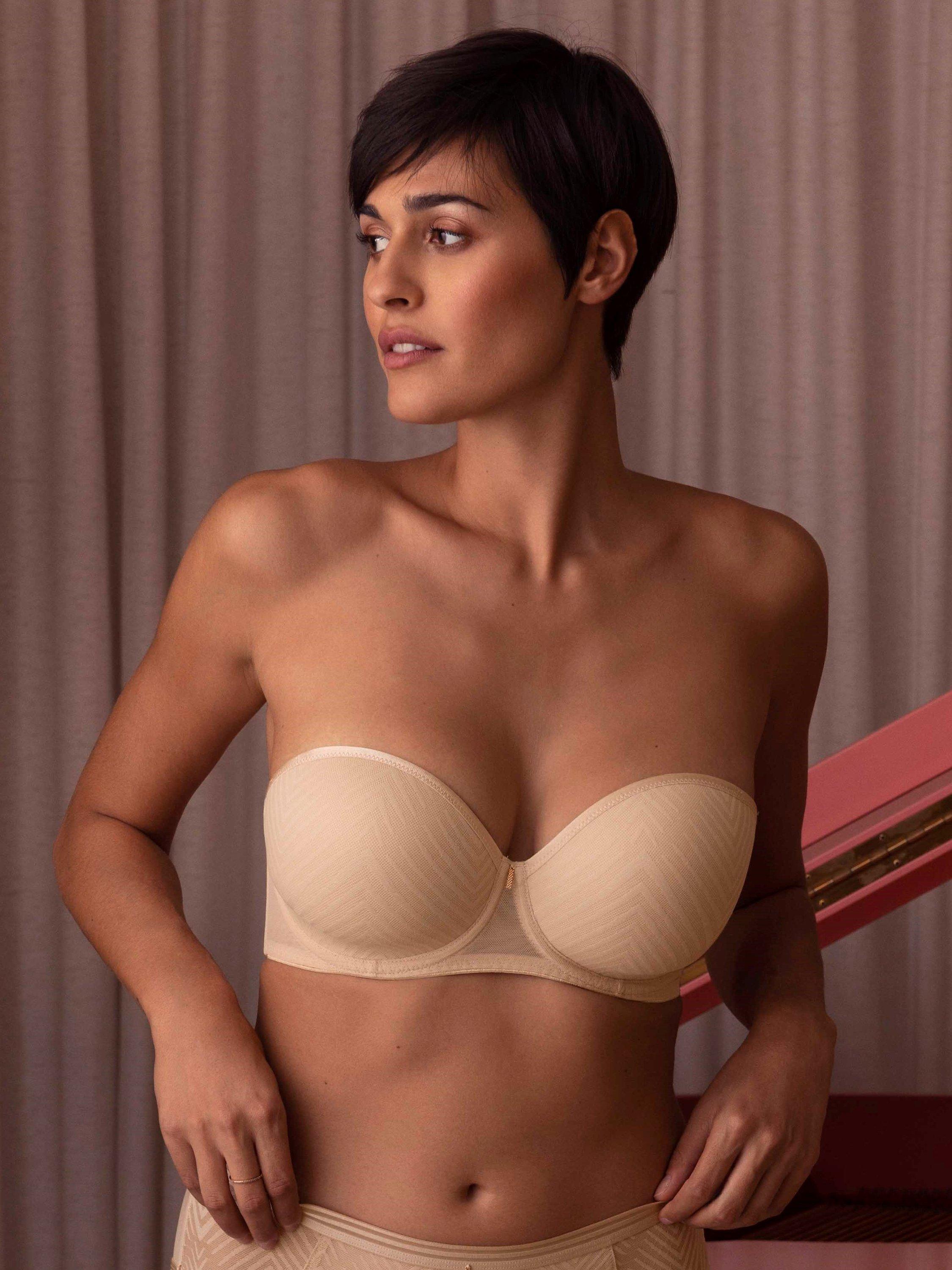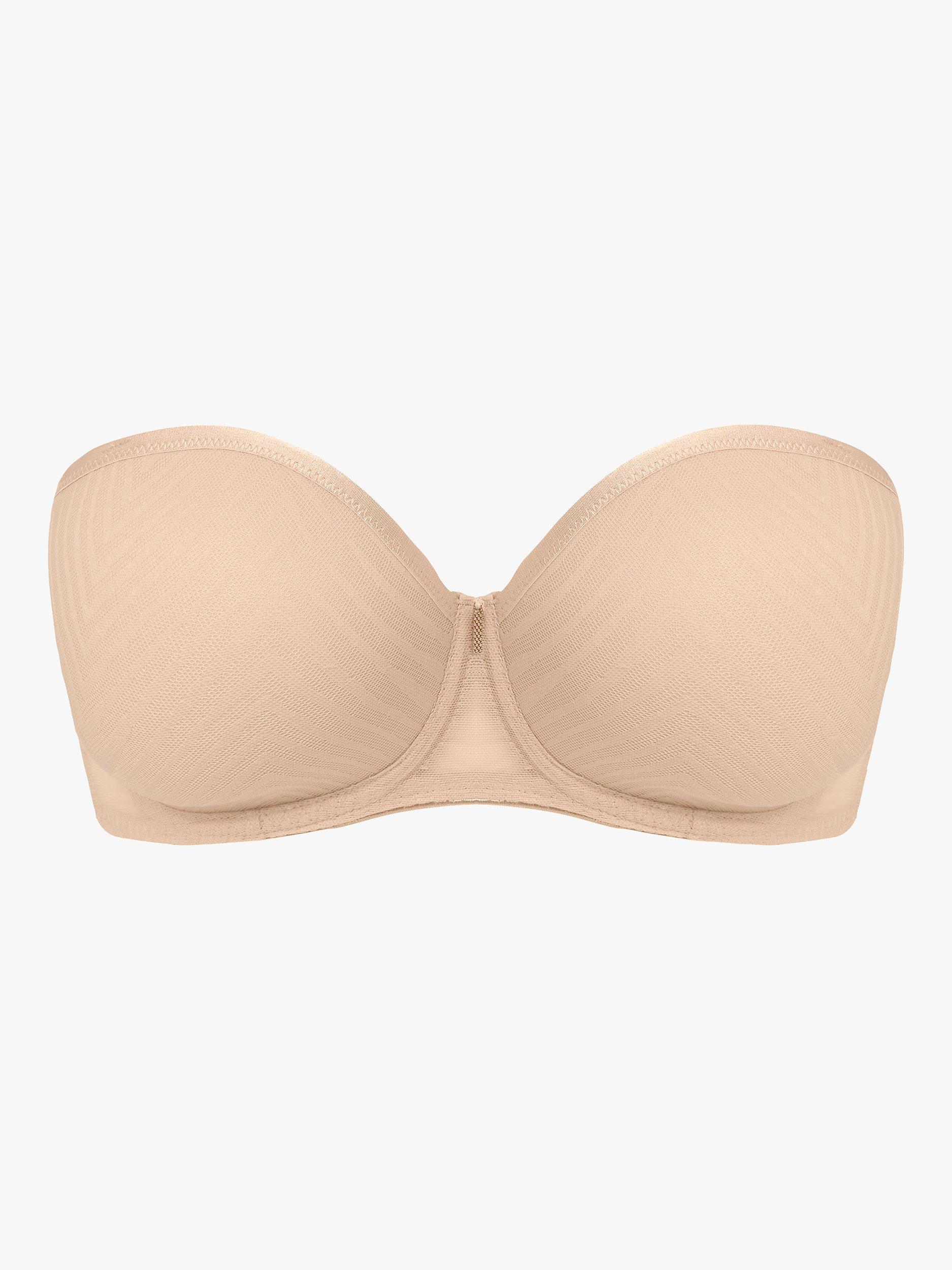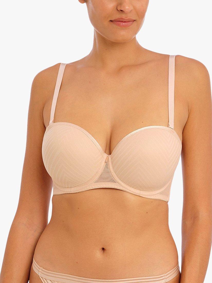 Tailored features contemporary styling with a geometric mesh lace overlay, teamed with either a tonal or contrast base and a pretty rose gold bar trim at the centre front. Based on Freya's Cameo range, the underwired strapless bra has moulded cups for a smooth, rounded silhouette and the stretch geo-lace overlay features a flat finish for no show under clothing.