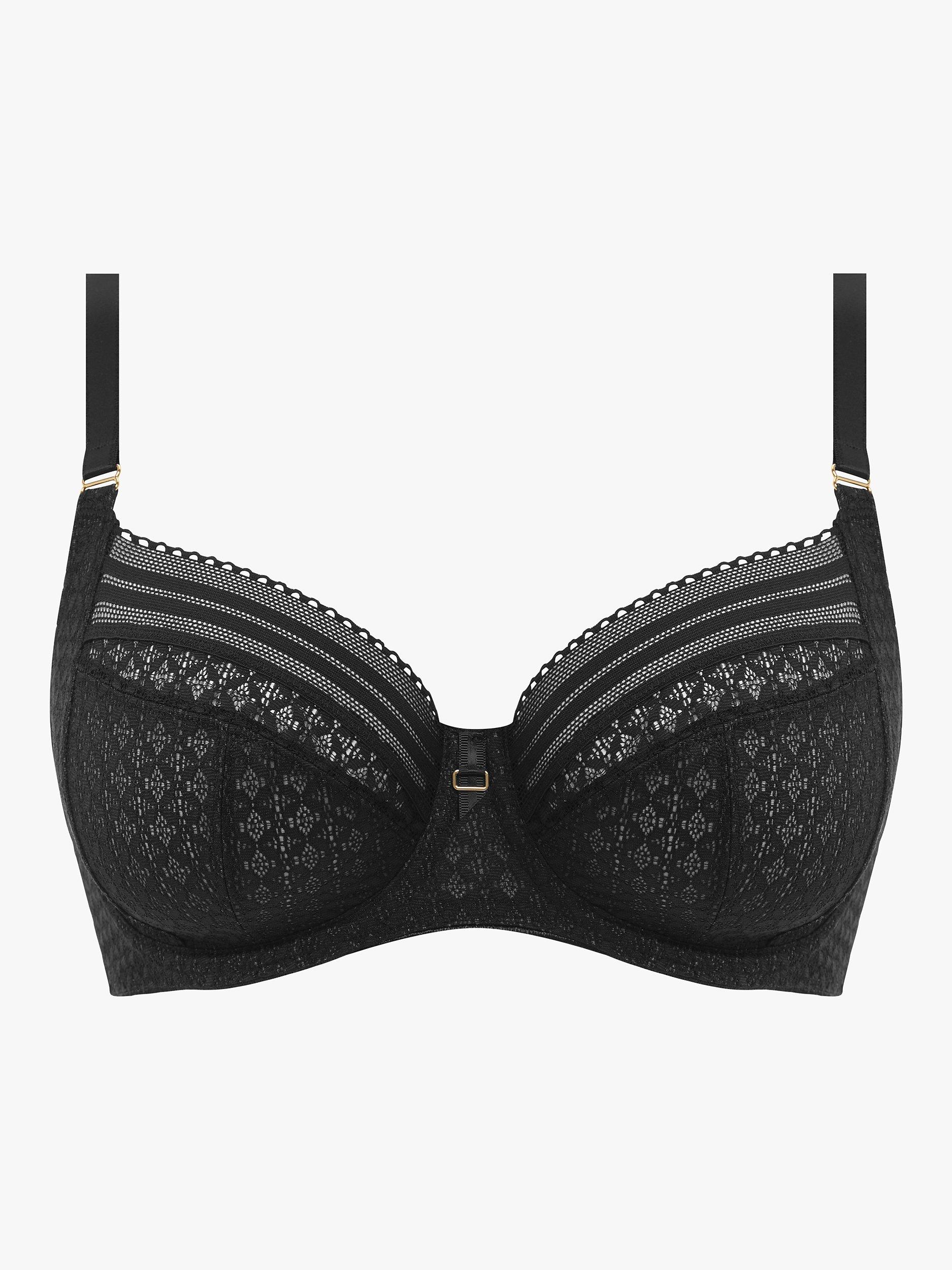 Made from a soft handle geometric lace, this bra from Freya features four-piece cups with side support for great uplift and forward projection. With wide decorative stretch elastic at the neck edge, laminated side cups and power net wing provide additional support with fully adjustable straps for the perfect fit.