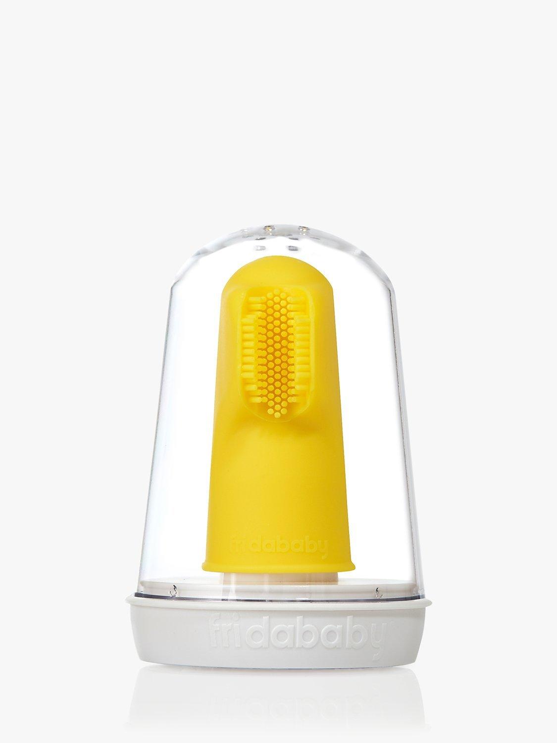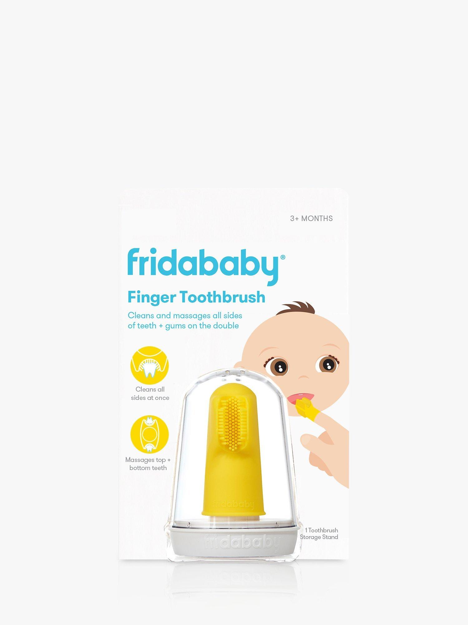 Smile! Frida's triple-angled brush head cleans and massages all sides of baby's teeth and gums at once. Plus, the double-sided brush tackles top and bottom at the same time for a full-service cleaning in record time while protecting your finger when baby clamps down. It also helps train and develop good oral hygiene habits for babies and infants. It's a handy must-have for baby's bathroom routine.