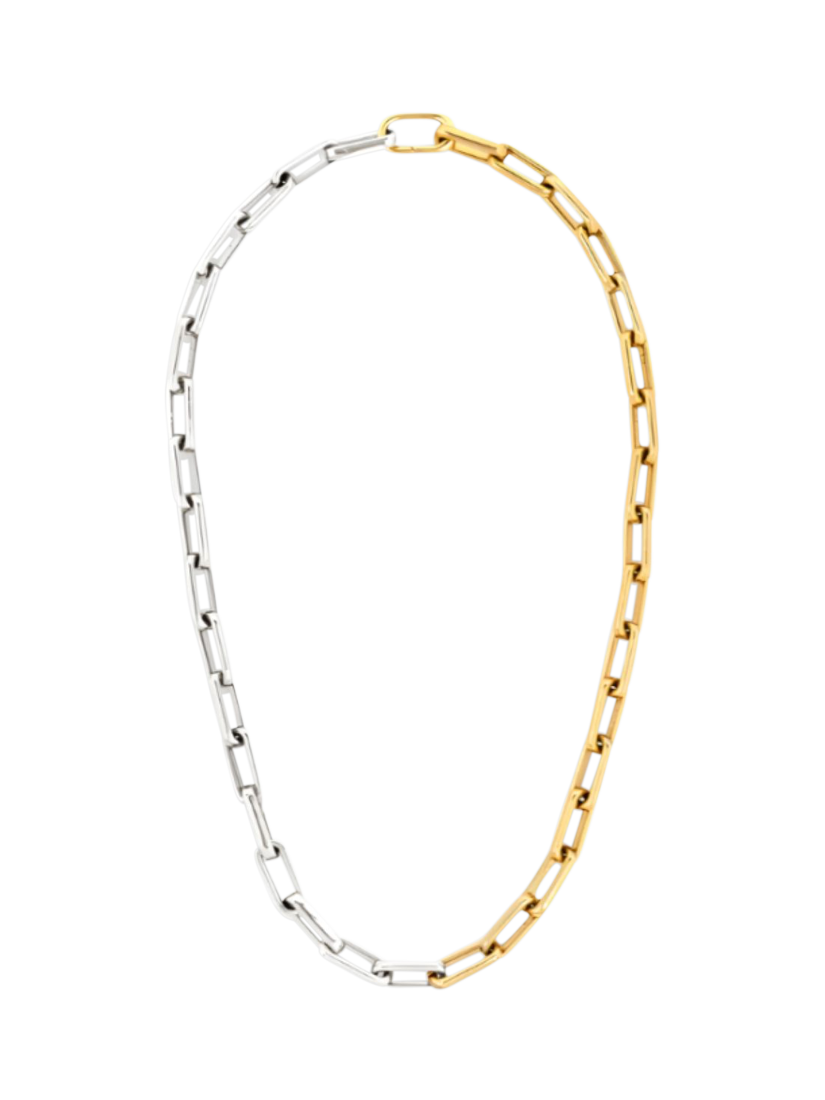 Crafted from gold and silver silver plating, the Mega Mixed Metal Necklace can be stacked, worn solo or adorned in your favourite charms for a statement look.