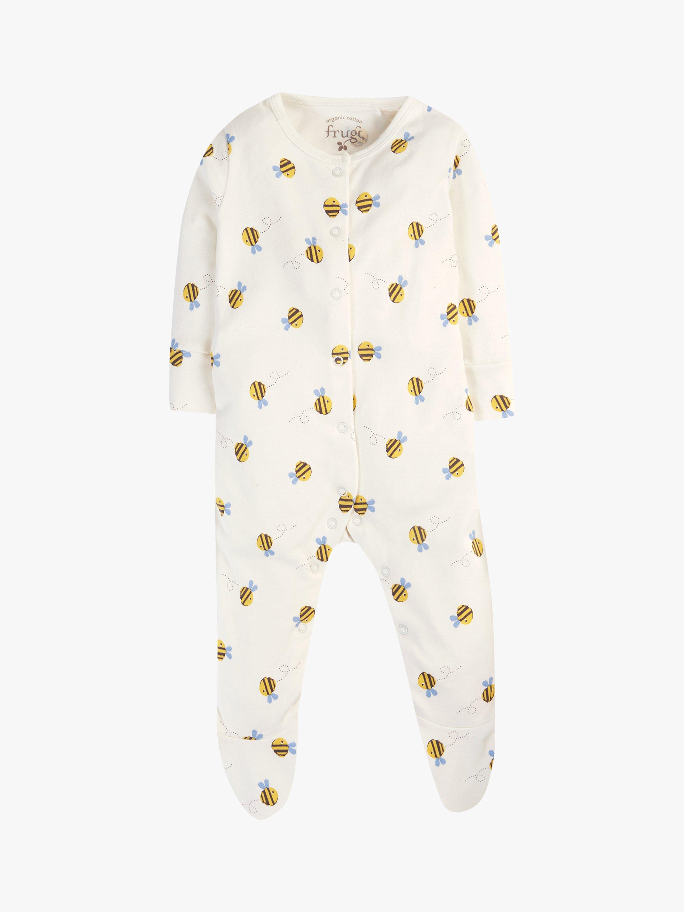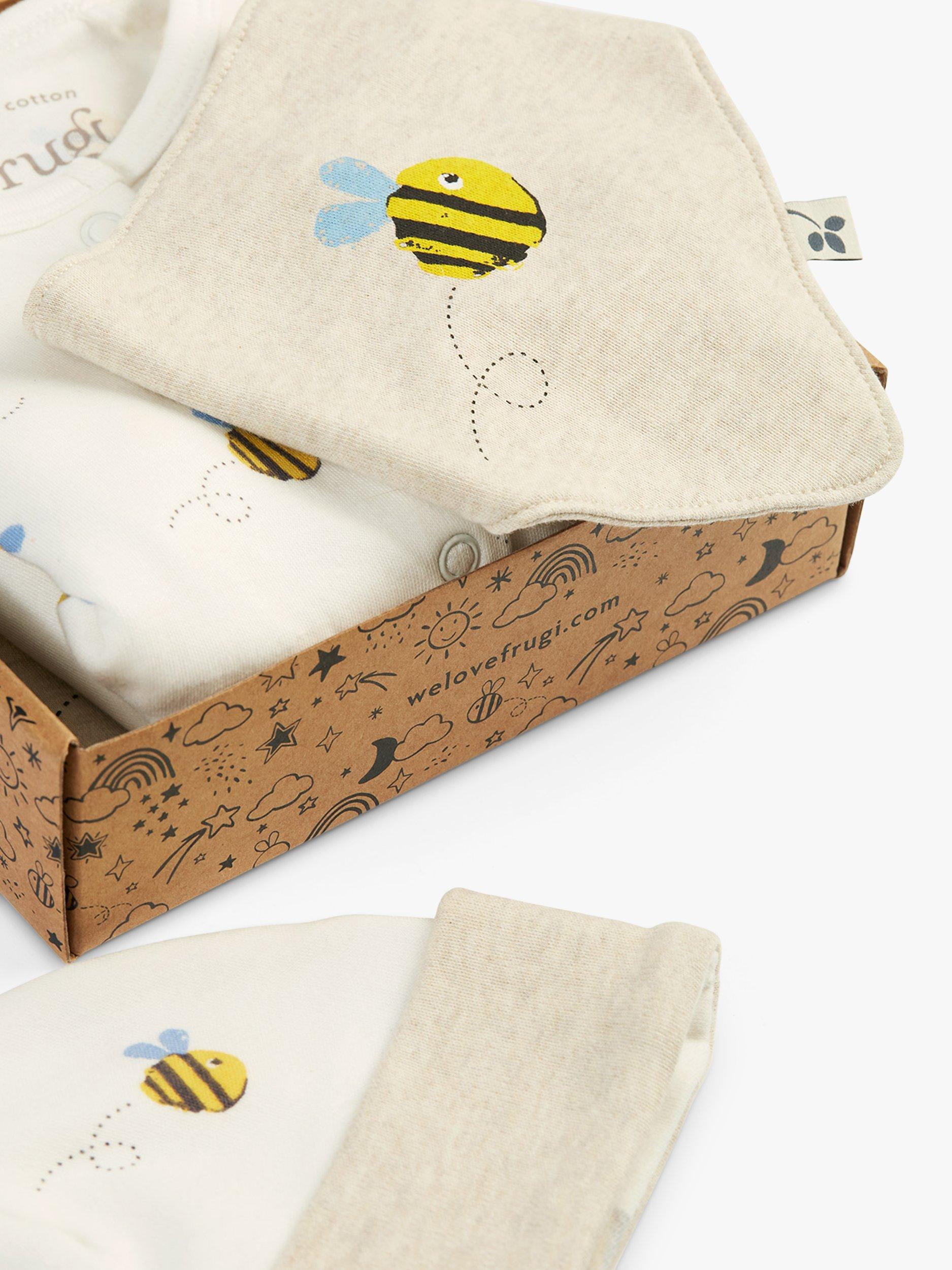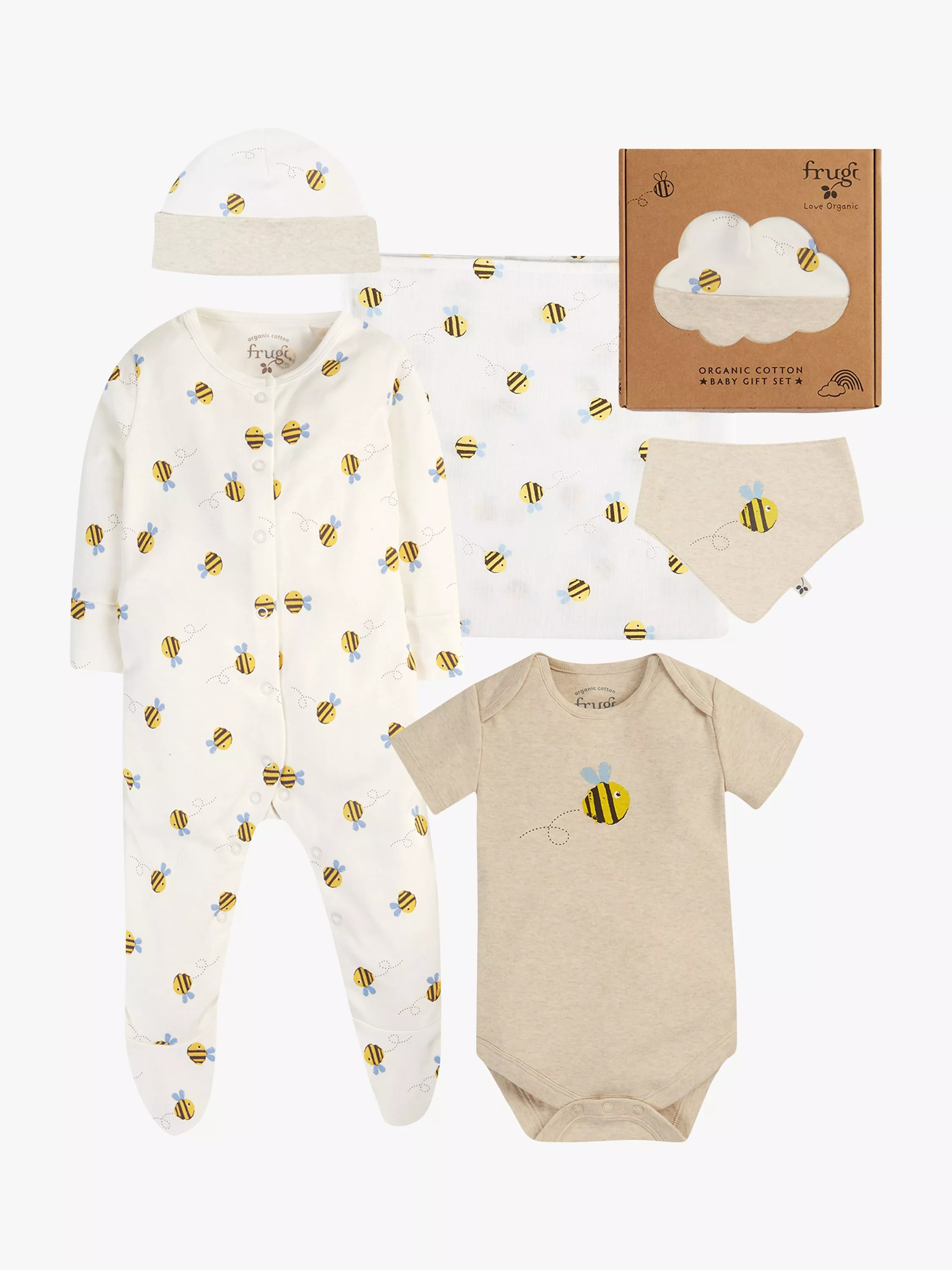 This organic cotton, six-piece baby gift set from Frugi includes a co-ordinating: bodysuit, babygrow, hat, muslin and dribble bib, presented in a gift box.