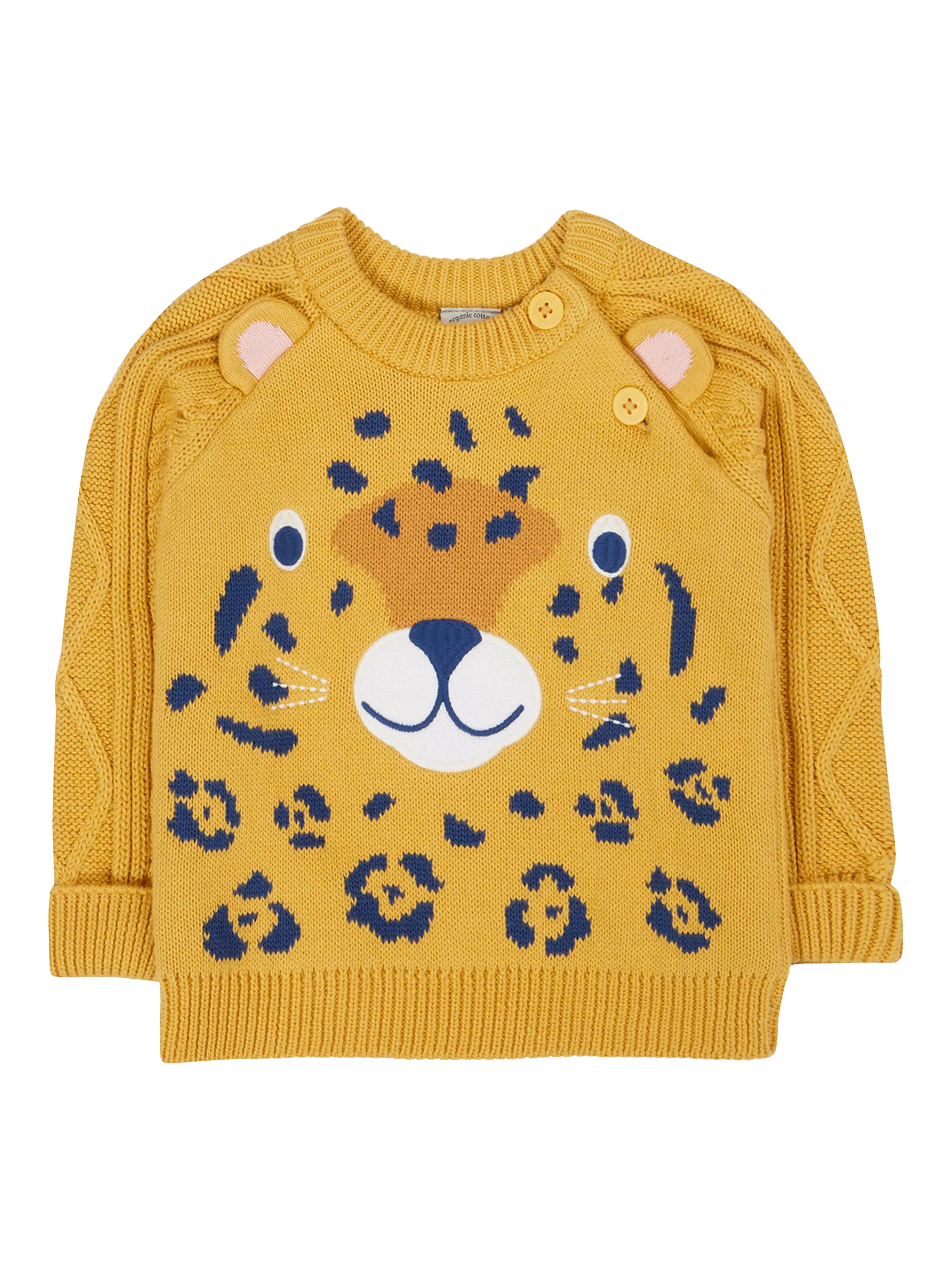 Soft jumper crafted from pure cotton, featuring a 3D ears leopard pattern and handy neck buttons for easy changing. Designed for cosy comfort and everyday adventure.