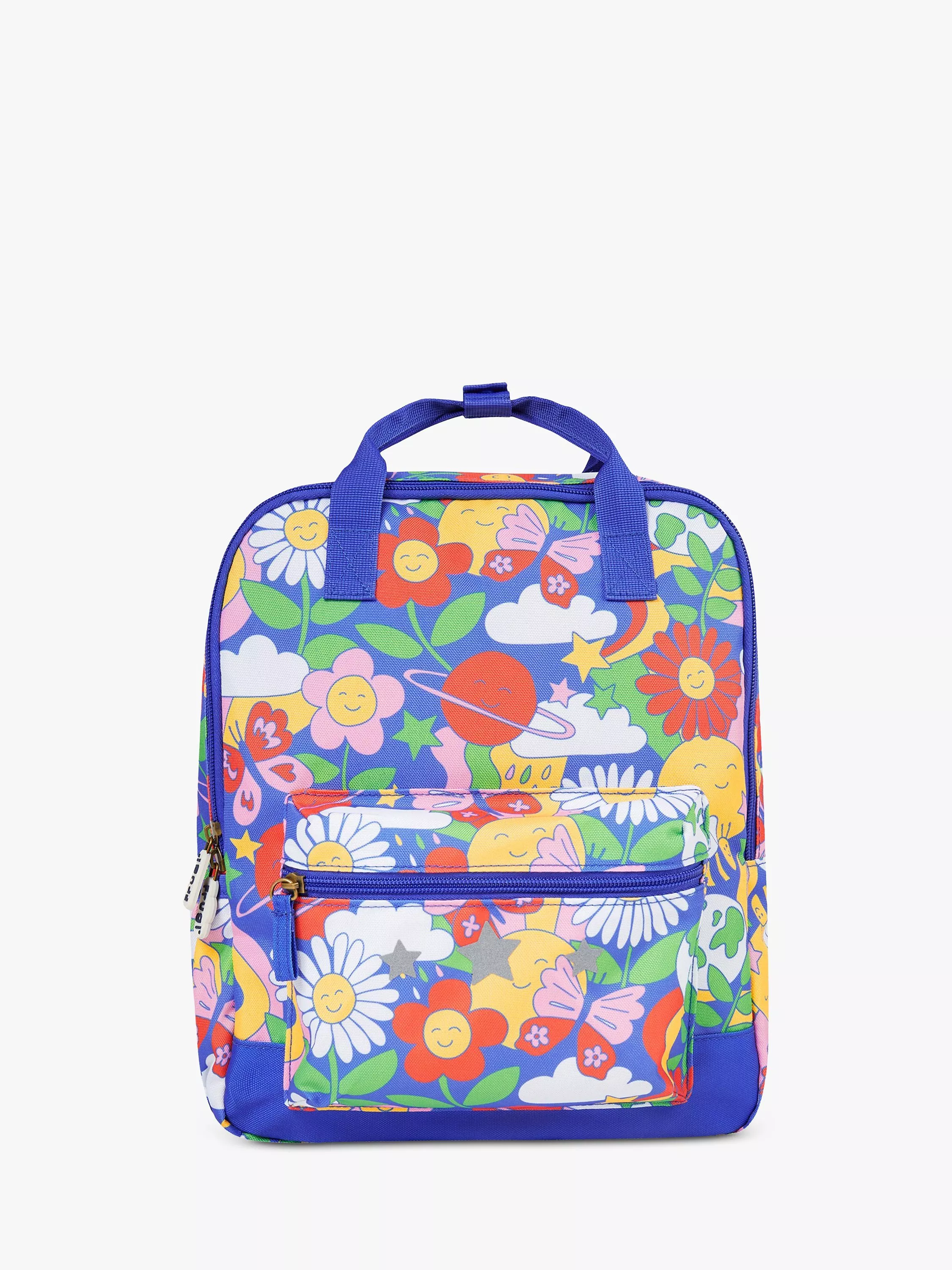 Made from recycled material, this backpack features reflective print details, elasticated side pockets which are the perfect fit for a water bottle, a zipped front pocket and a carry handle. The zip is shaped like a cloud and also comes with a cloud-shaped name badge and adjustable chest strap.