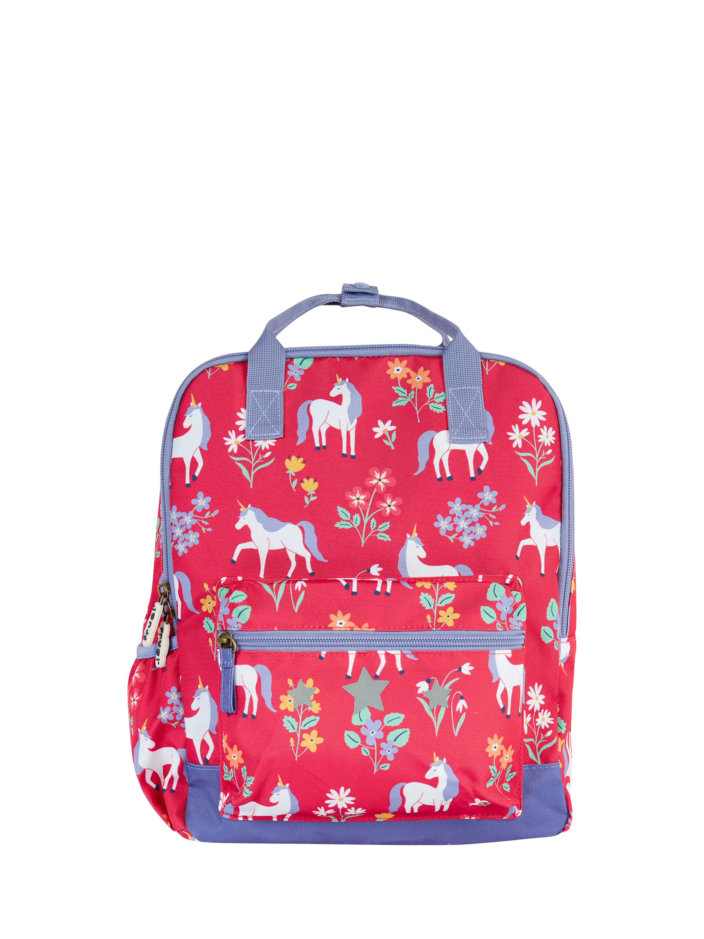 This Frugi backpack features reflective print details, elasticated side pockets, a zipped front pocket and carry handle. Details include lovely Frugi zip pulls shaped as a cloud, cloud-shaped name badge and adjustable chest strap. Fits an A4 folder.