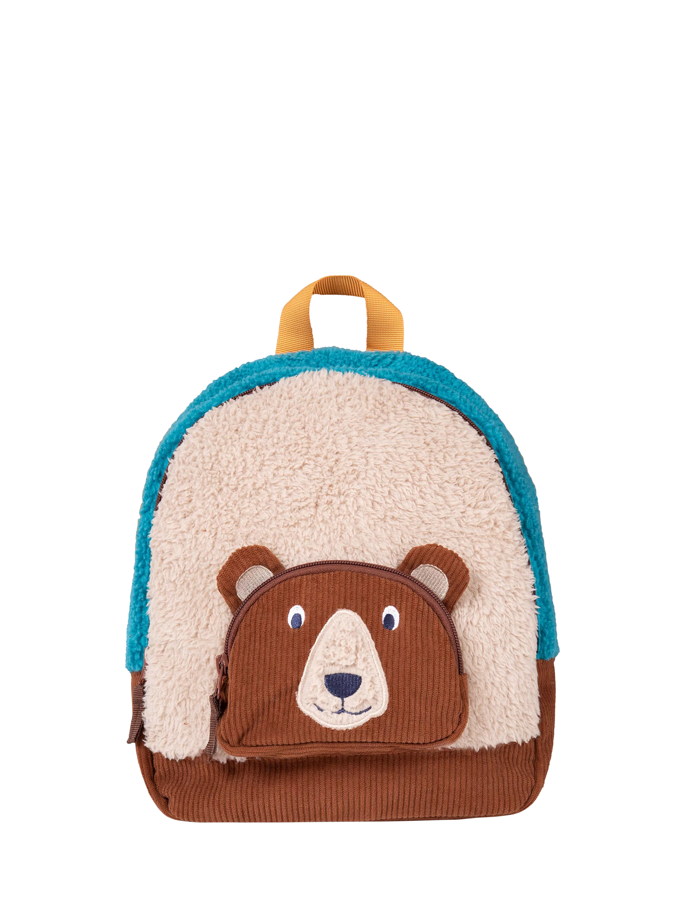 Ready for adventure, this fleece backpack from Frugi features a zipped front pocket, carry handle, cloud-shaped name badge and adjustable shoulder and chest straps. Designed in a wild bear motif.