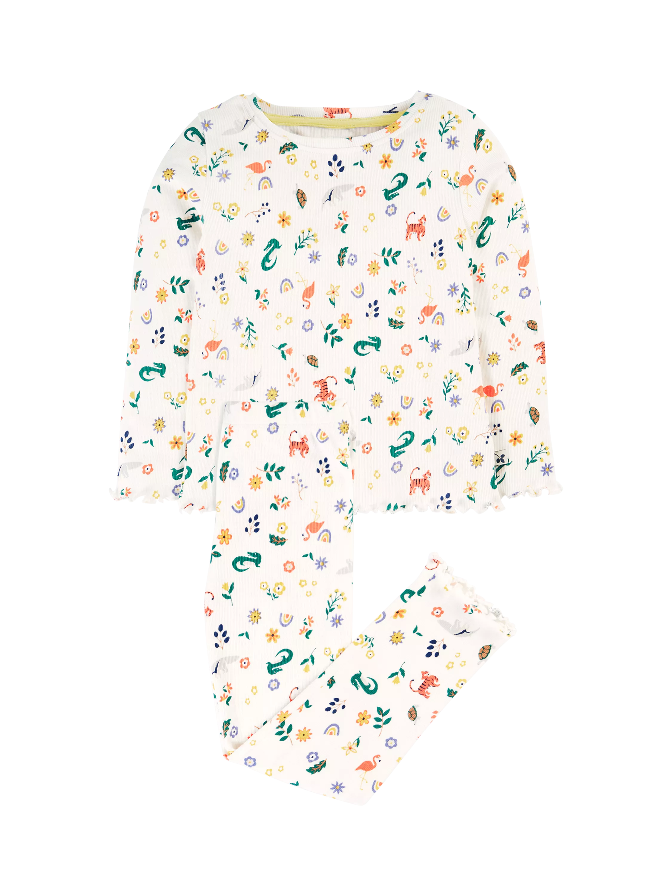 All over print stretch rib pyjamas with lettuce edging detail and fully elasticated waist.
