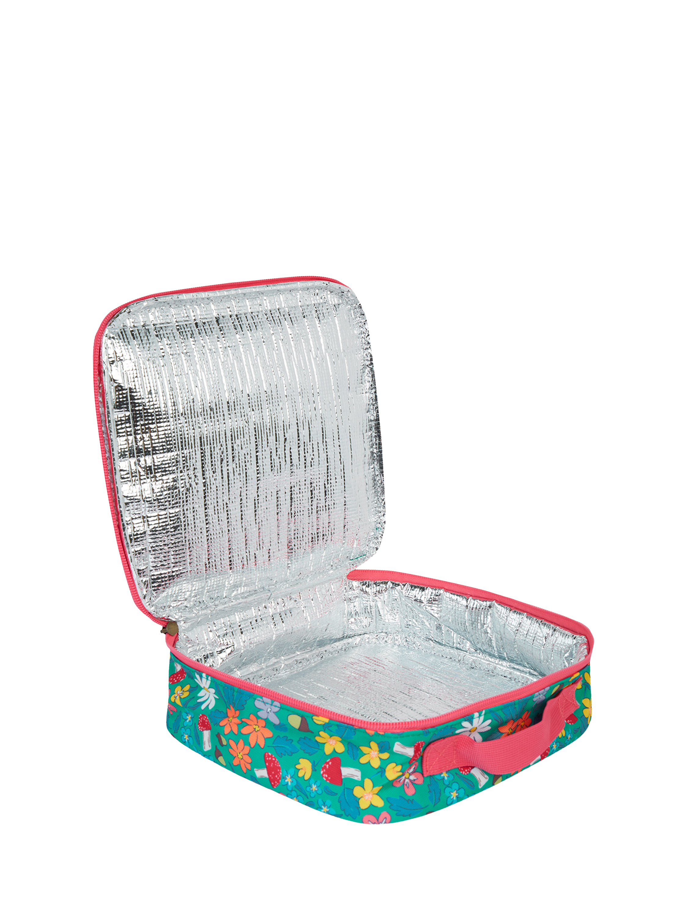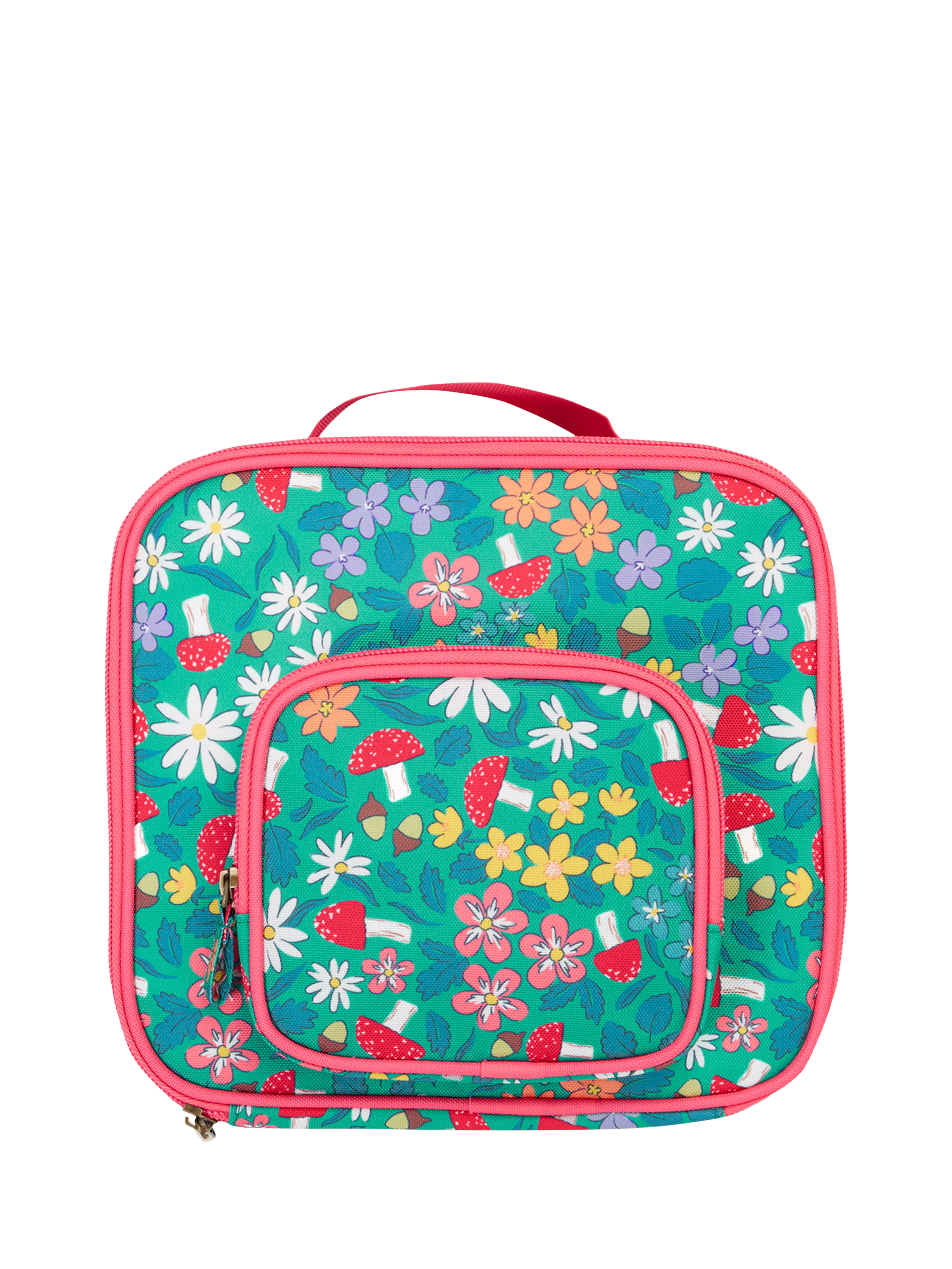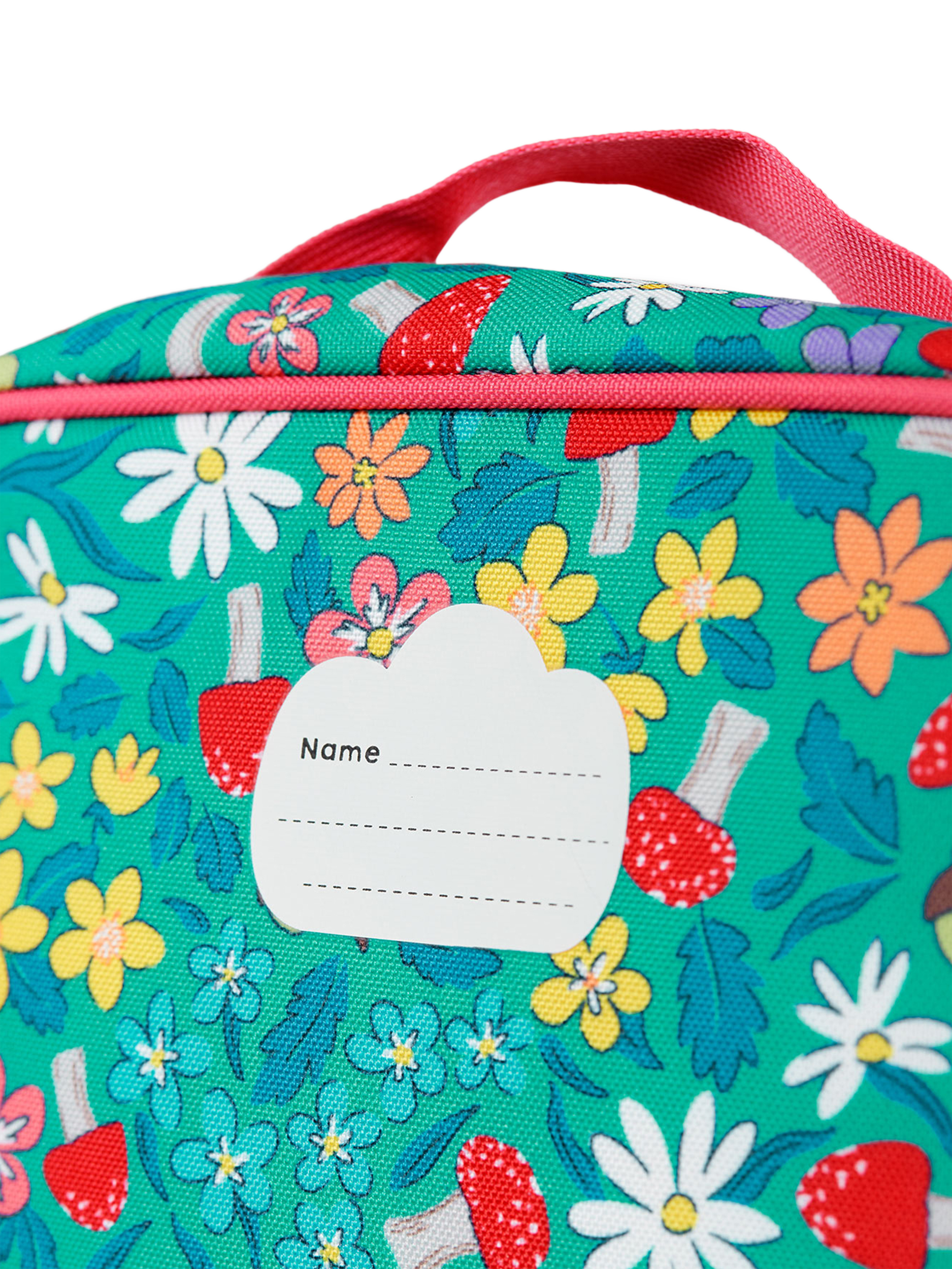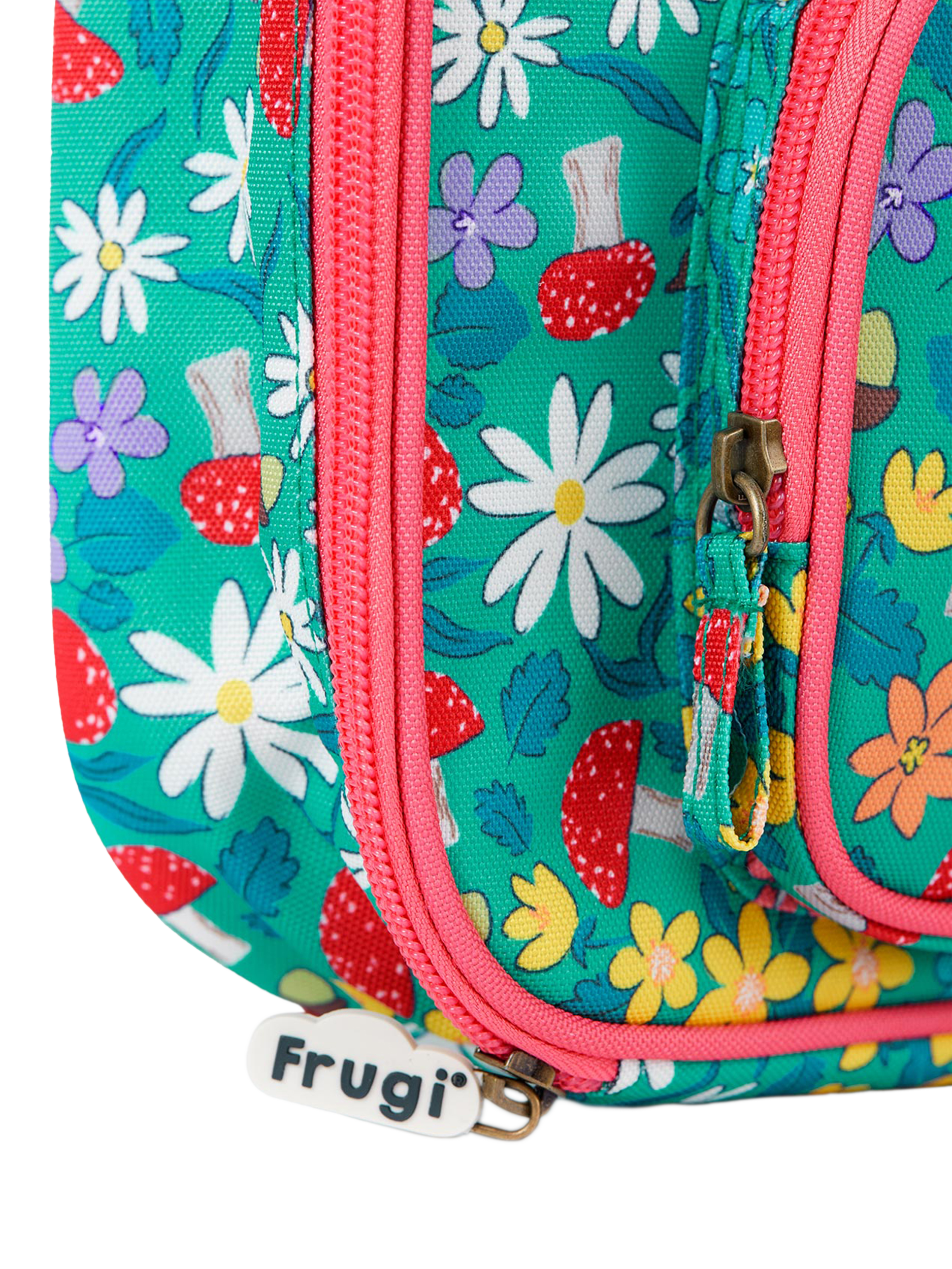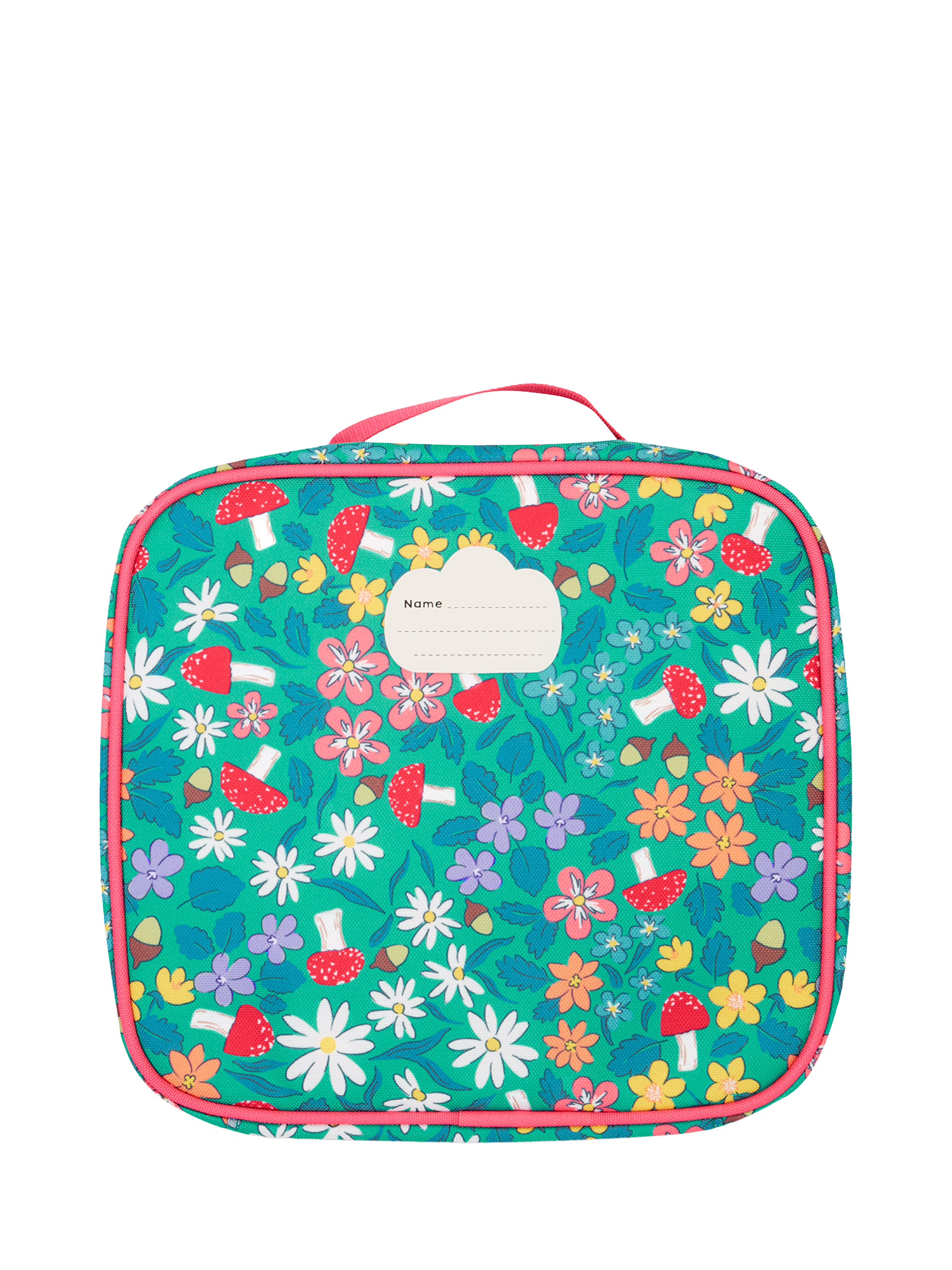 This Frugi lunch box features a zipped front pocket, carry handle, cloud shaped name badge. Designed with a woodland pattern.
