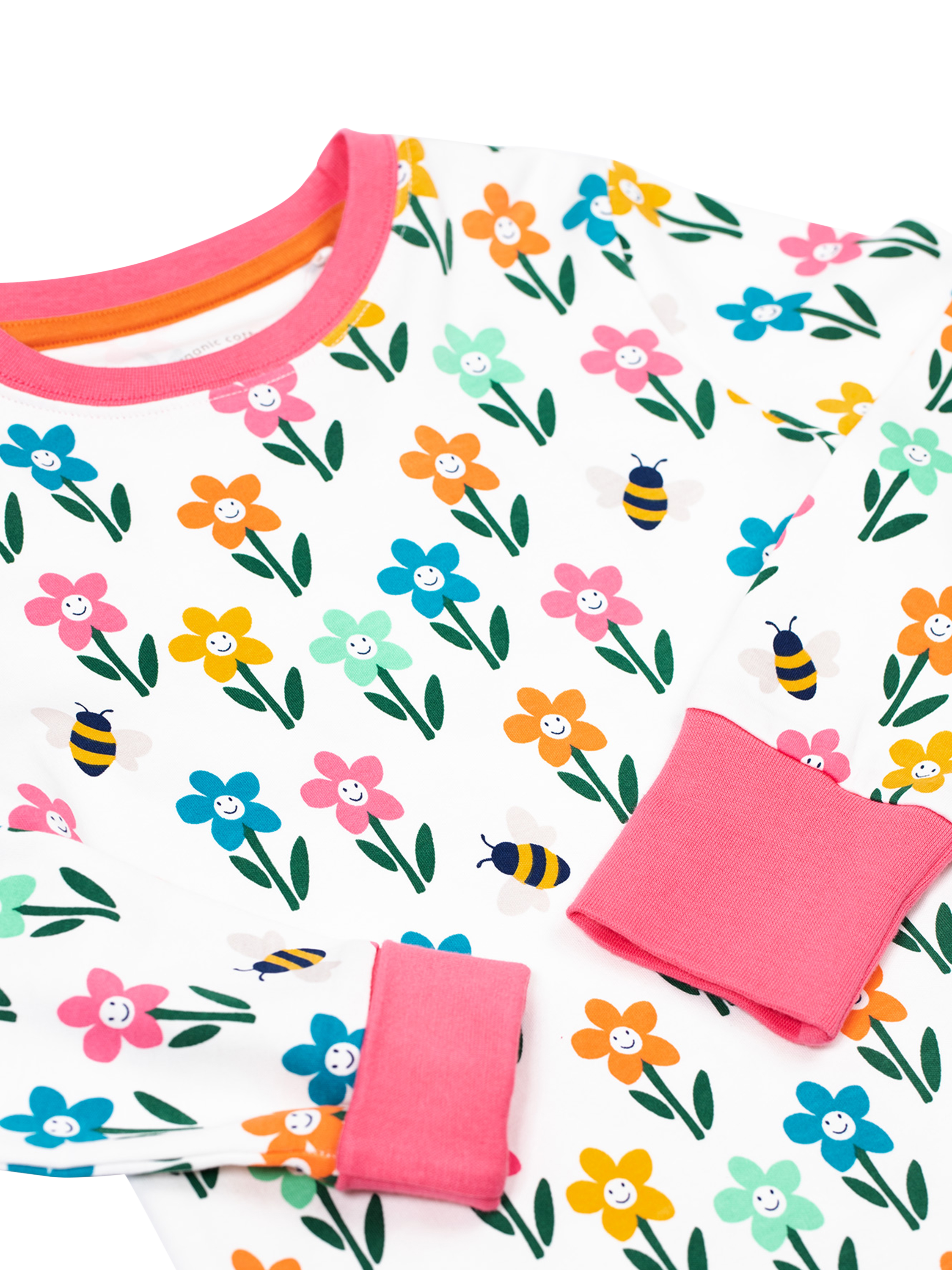 Soft organic cotton pyjamas designed for cosy nights, featuring lively floral patterns and practical long sleeves for comfort that encourages restful sleep and playful dreams.