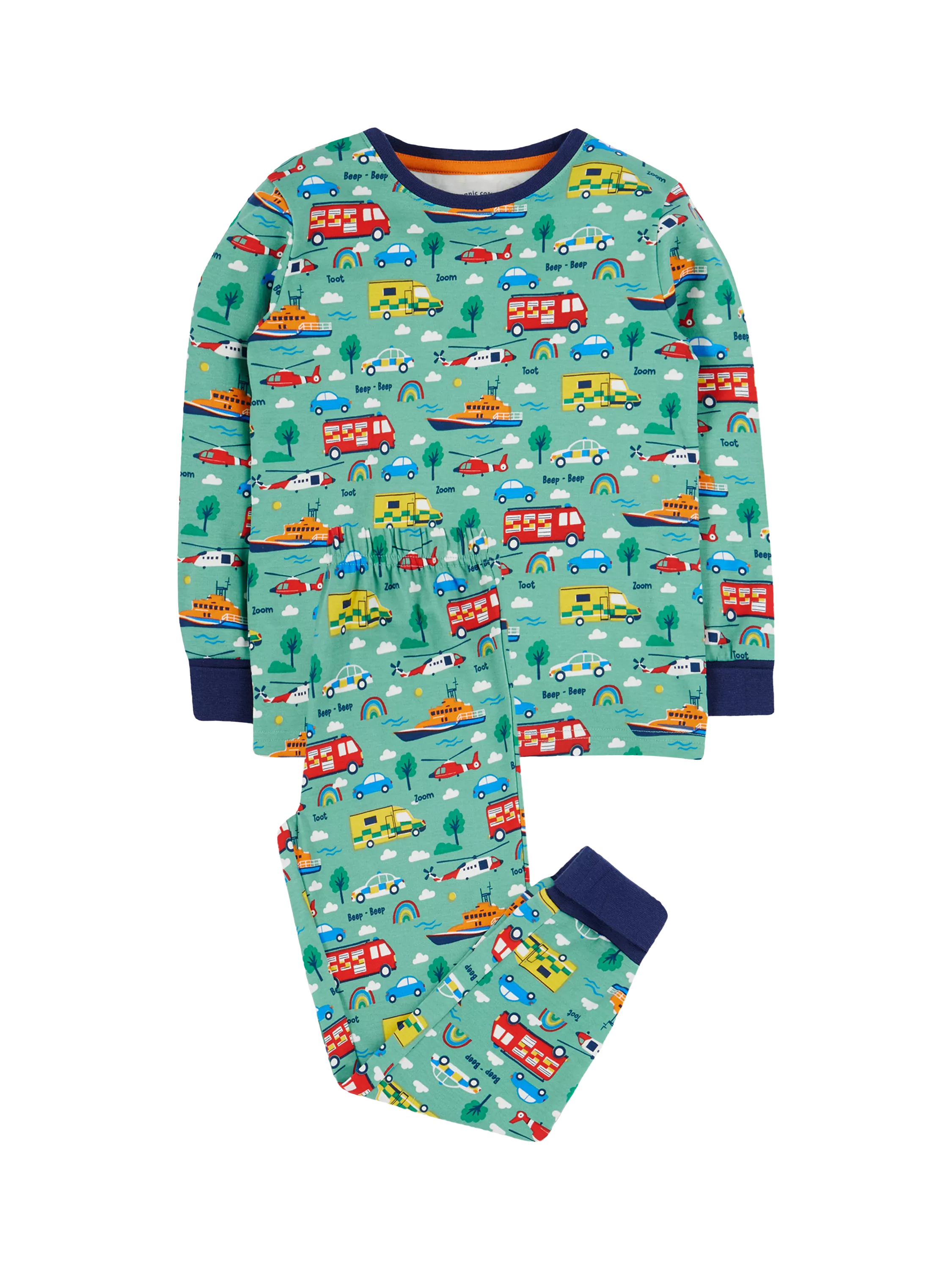 Two piece organic cotton pyjama set with a long sleeve, fully elasticated waist and all-over print.