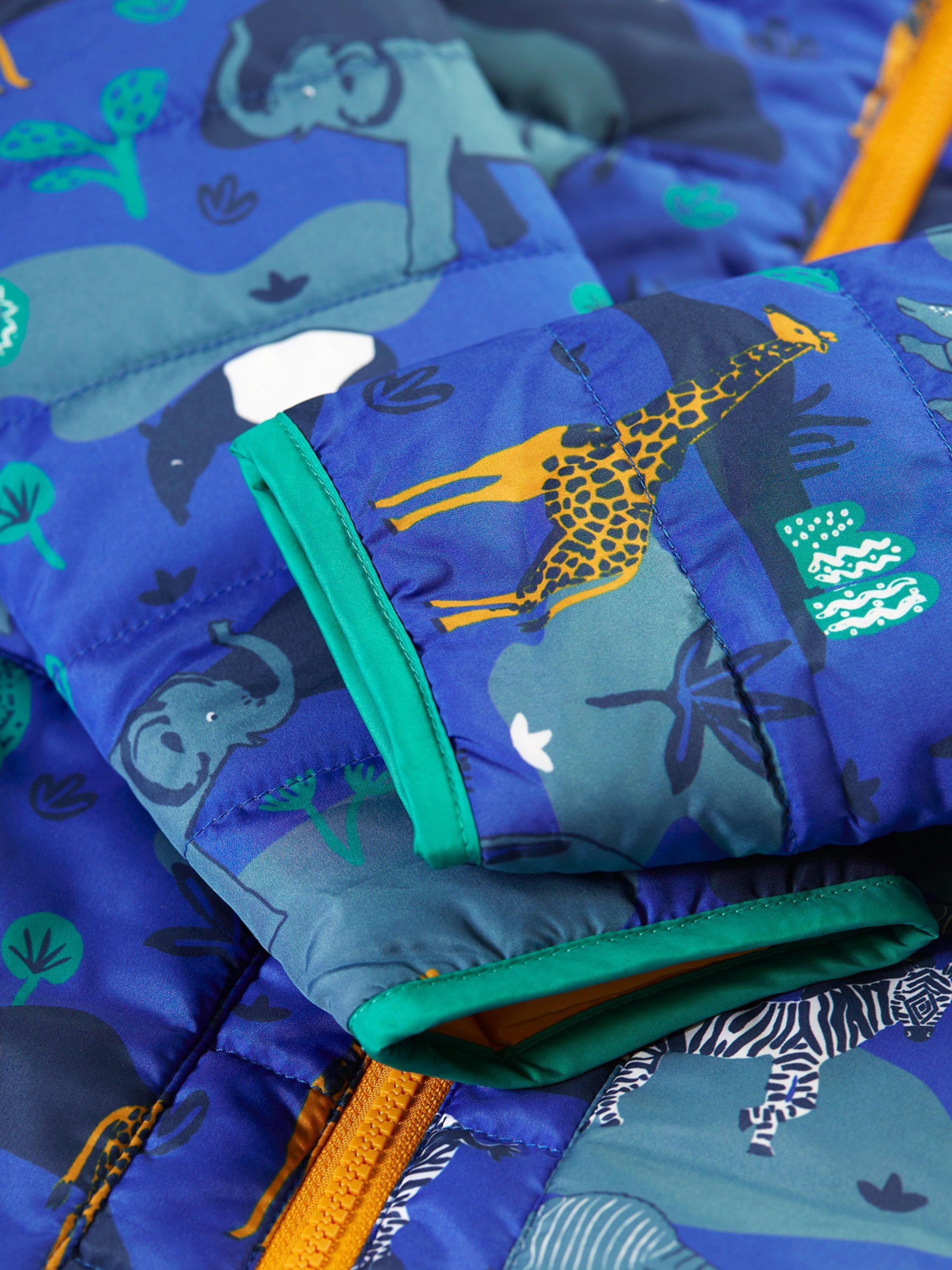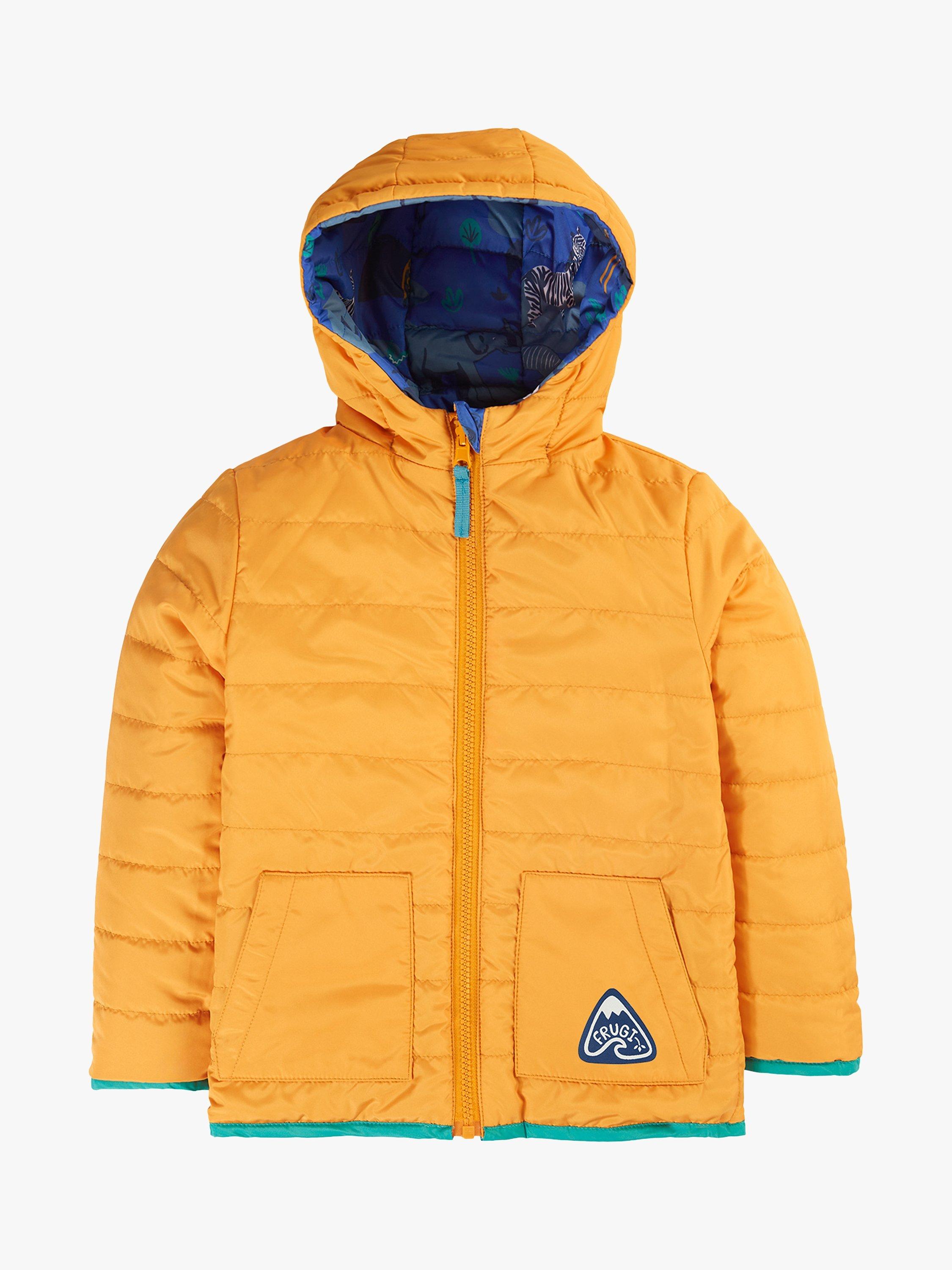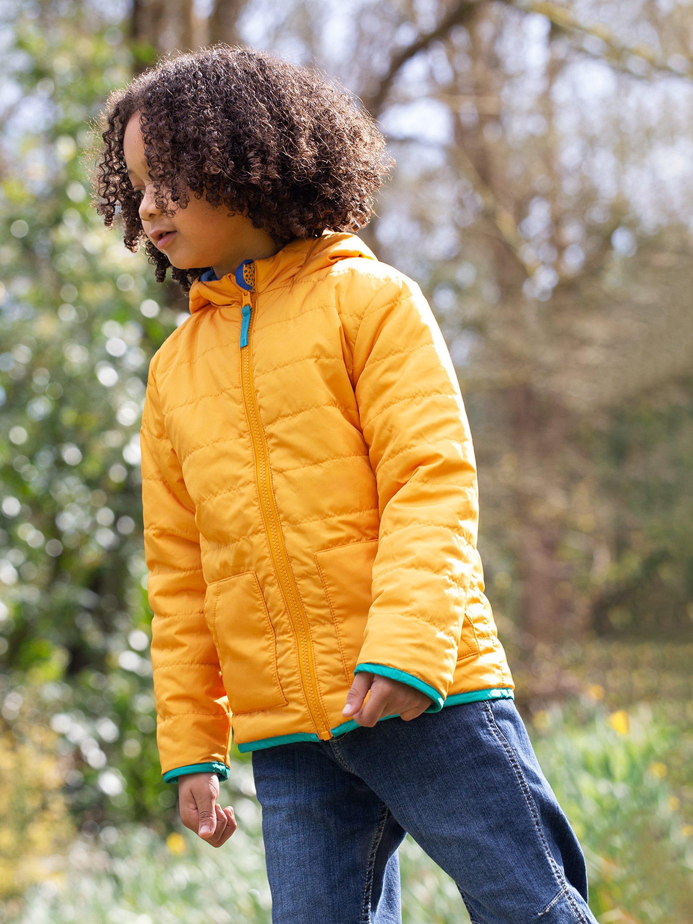 Reversible Toasty trail jacket. Cosy quilted hooded jacket that offers 2 looks in 1. Made from recycled plastic bottles features PFC free durable water repellent finish, 3 piece panel hood, pockets on both side of the jacket. Part of the Frugi circular Recycle Me! Range, this jacket can be recycled once it comes to the end of it's usable life.