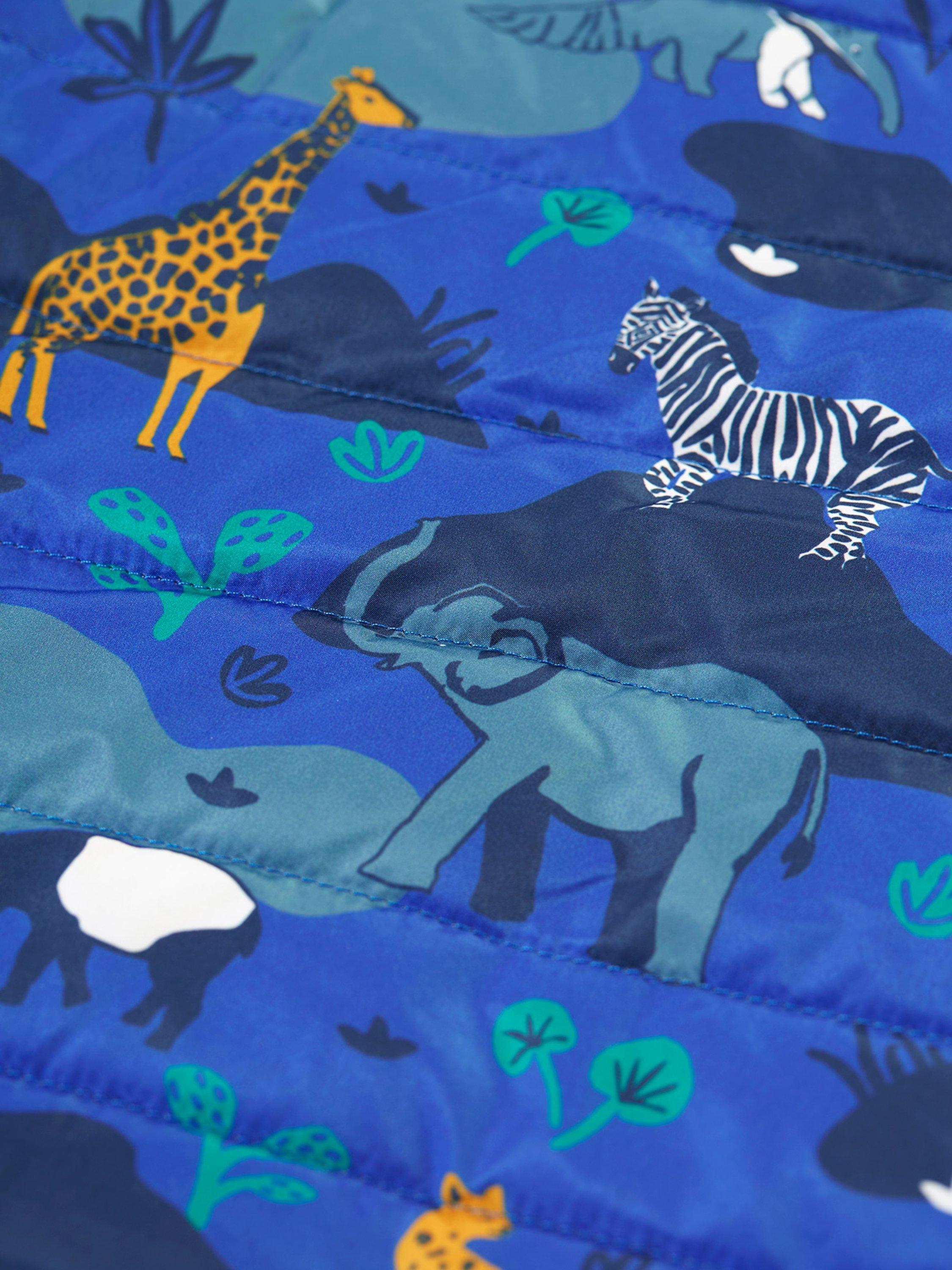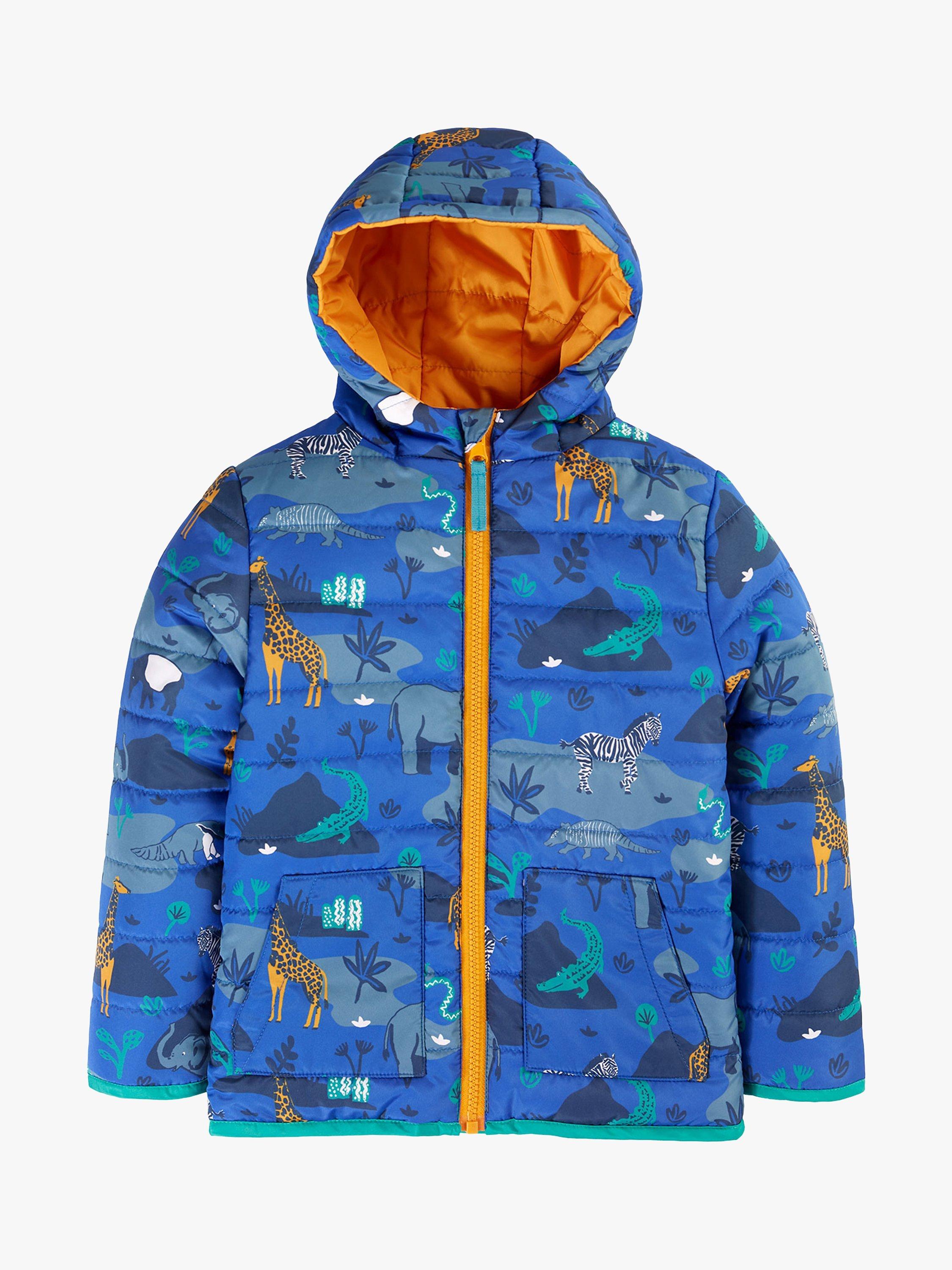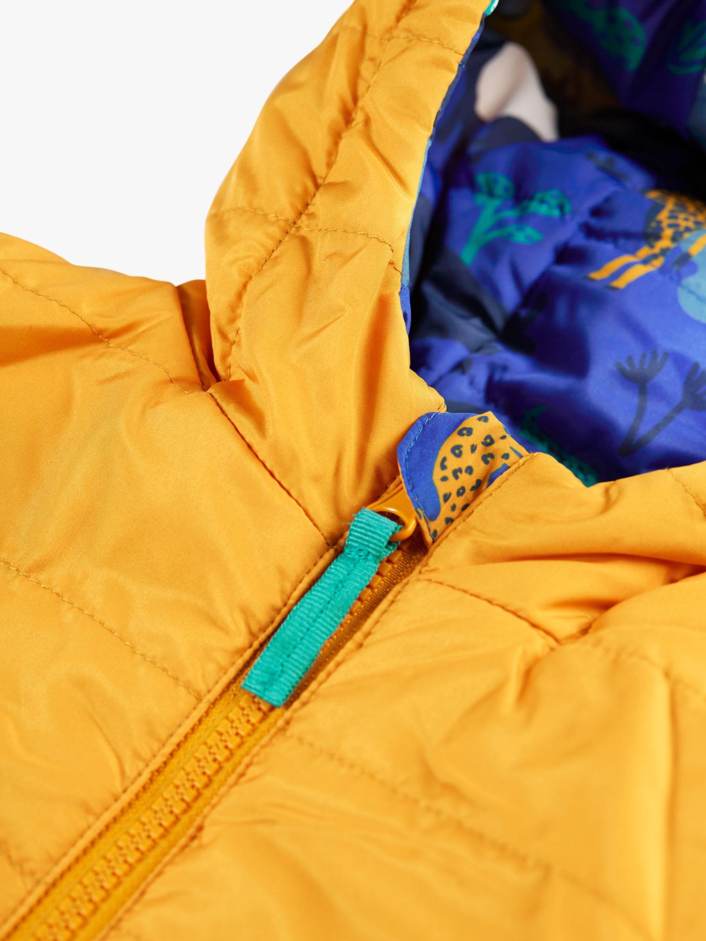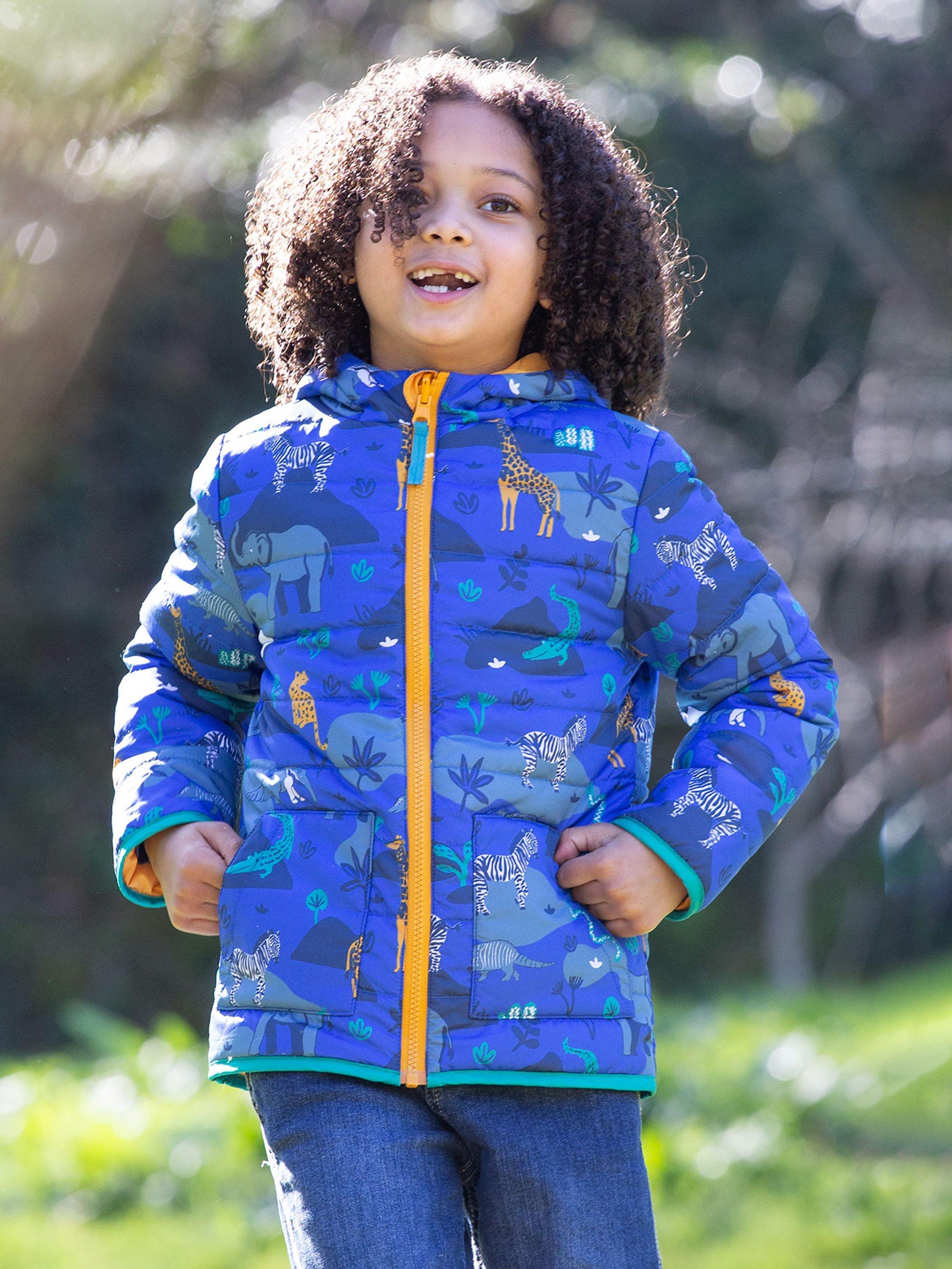 Reversible Toasty trail jacket. Cosy quilted hooded jacket that offers 2 looks in 1. Made from recycled plastic bottles features PFC free durable water repellent finish, 3 piece panel hood, pockets on both side of the jacket. Part of the Frugi circular Recycle Me! Range, this jacket can be recycled once it comes to the end of it's usable life.