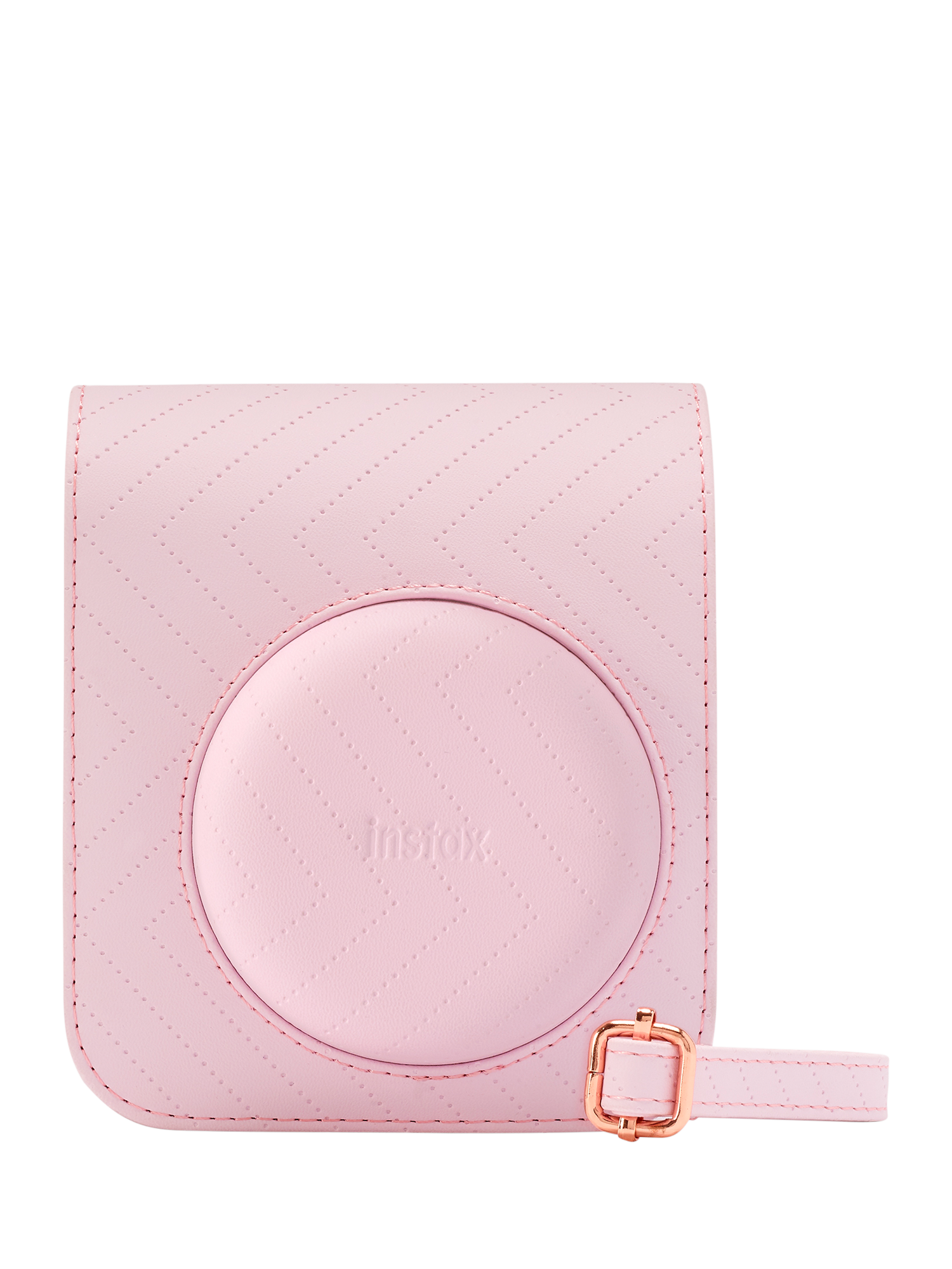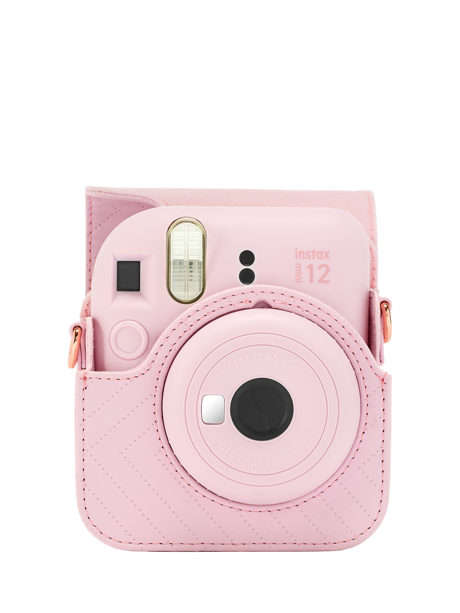 Bundle contains instax™ mini 12TM instant camera in Blossom Pink, colour matched case, 5 x Rose Gold heart shaped photo stands, 1 x 10 shot instax™ miniTM film, 1 x pack instax™ display stickers, 2 x AA batteries and user manual. Zig zag stitch colour matched case with a removable front cover and detachable and adjustable shoulder strap.
