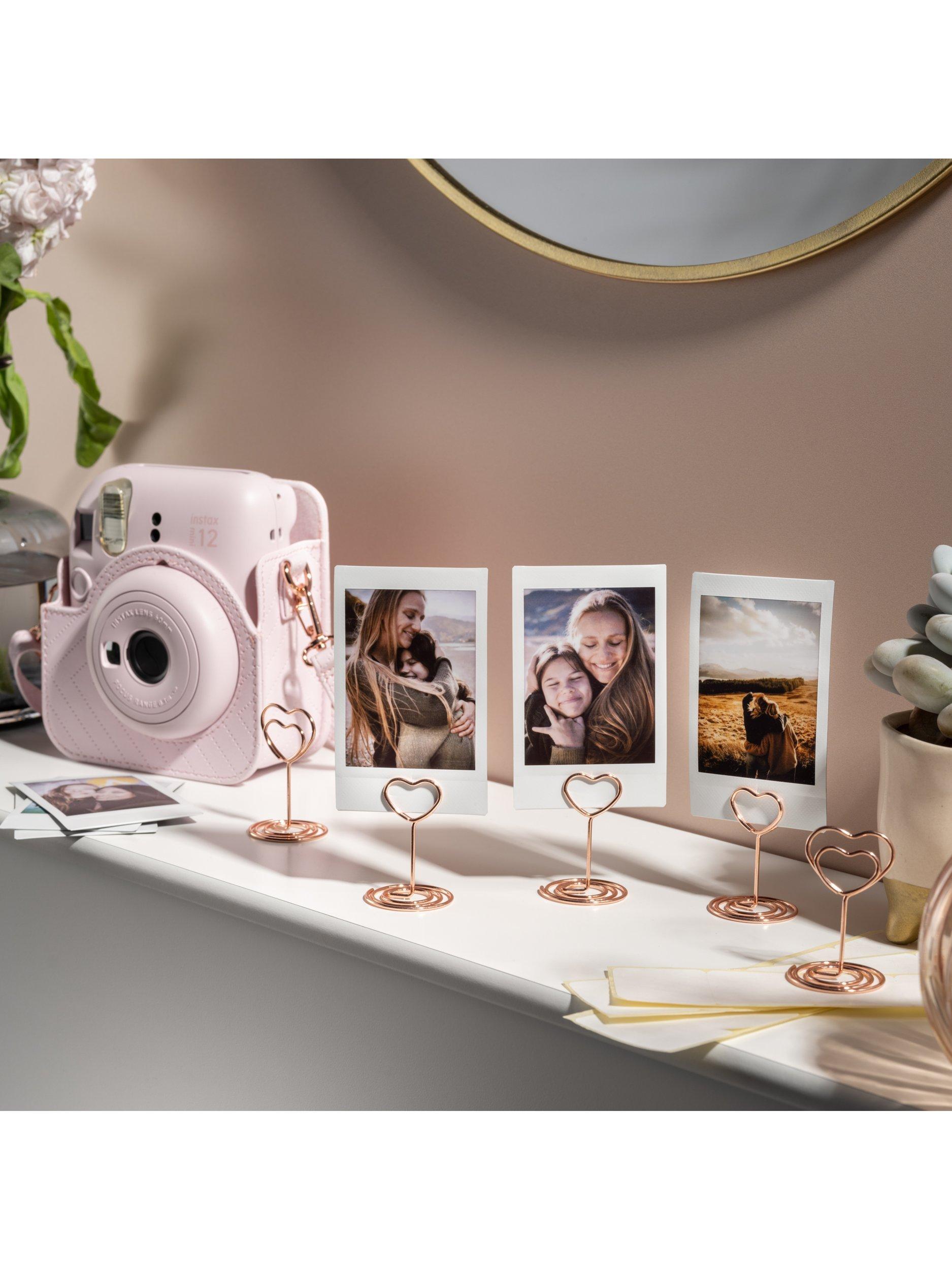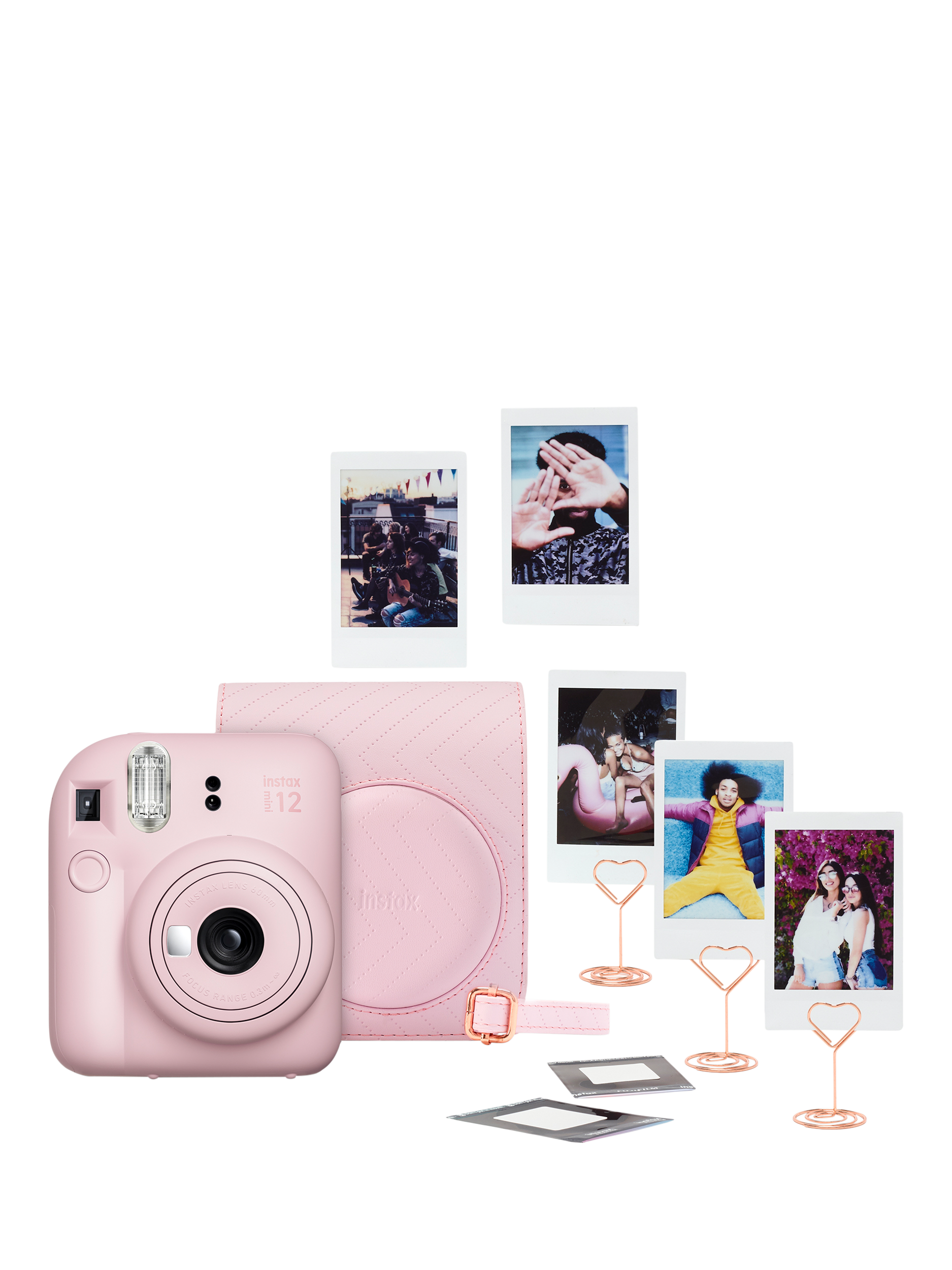 - instax mini 12™ instant camera in Blossom Pink, colour matched case, 5 x Rose Gold heart shaped photo stands,1 x 10 shot instax mini™ film, 1 x pack instax™ display stickers, 2 x AA batteries user manual