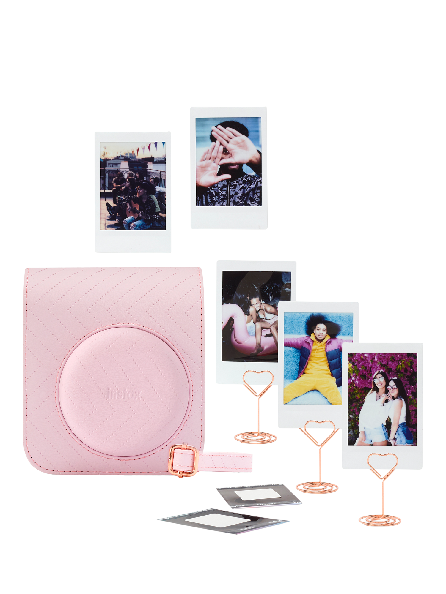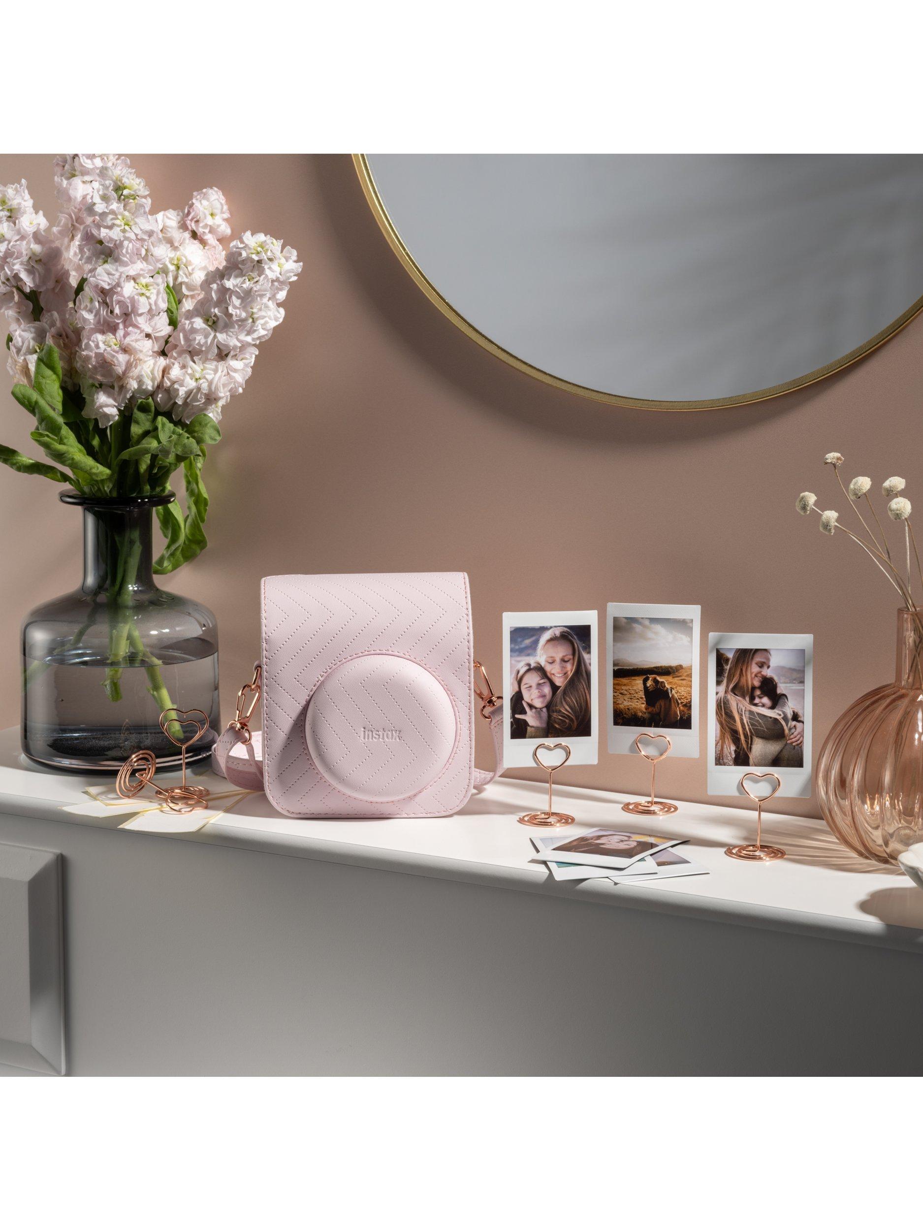 Some might call this a bundle; we view it more as a bouquet. A posy of Blossom Pink wonderfulness. From the Blossom Pink instax™ mini 12TM instant camera, to the Rose Gold heart shaped photo stands and stylish zigzag stitched matching case, prepare to own something truly beautiful.