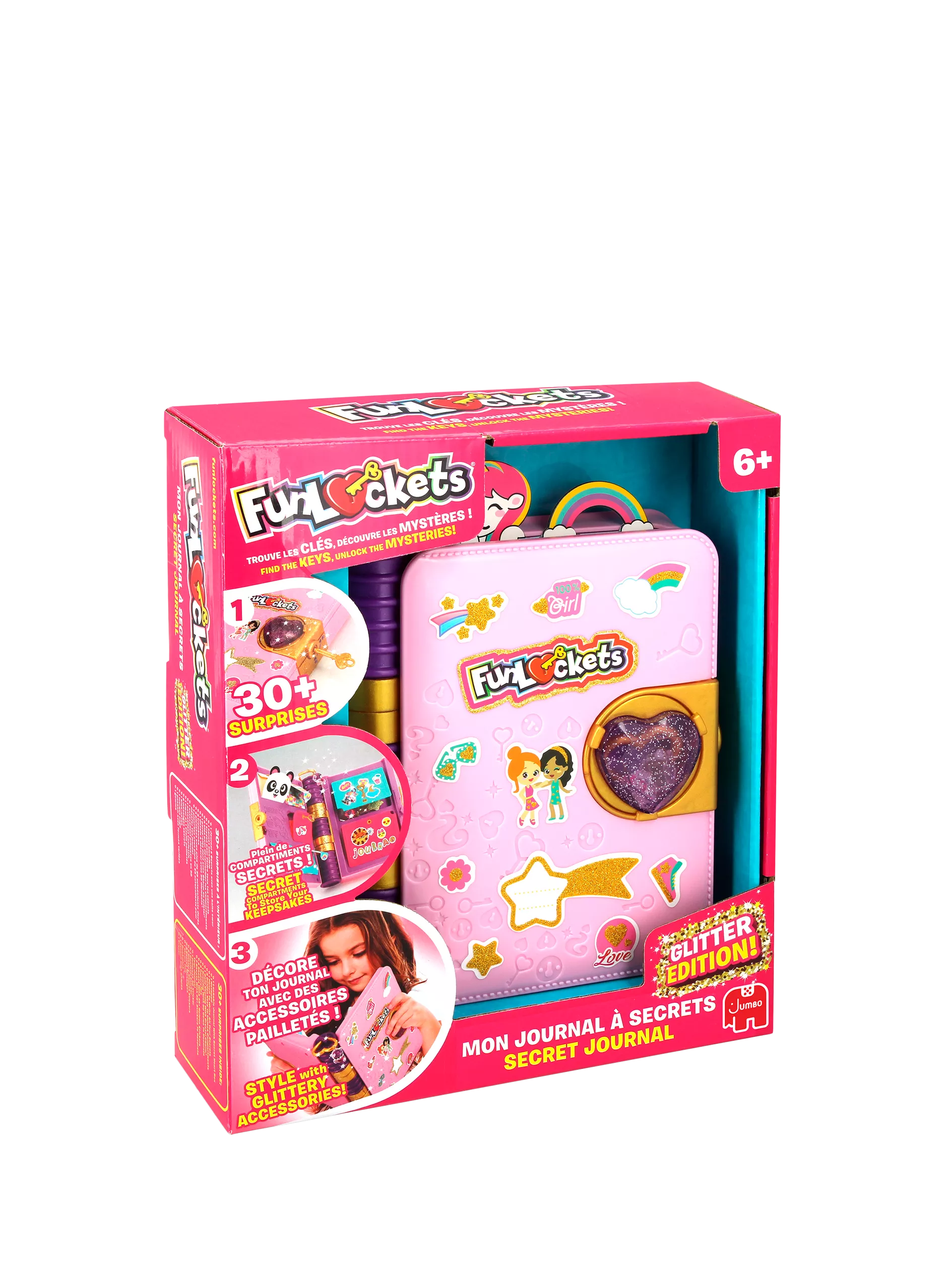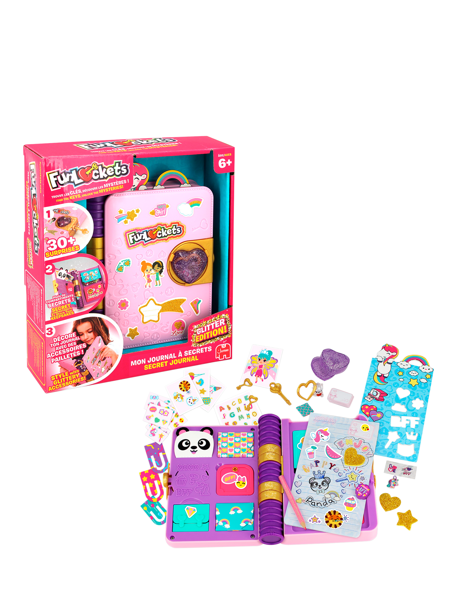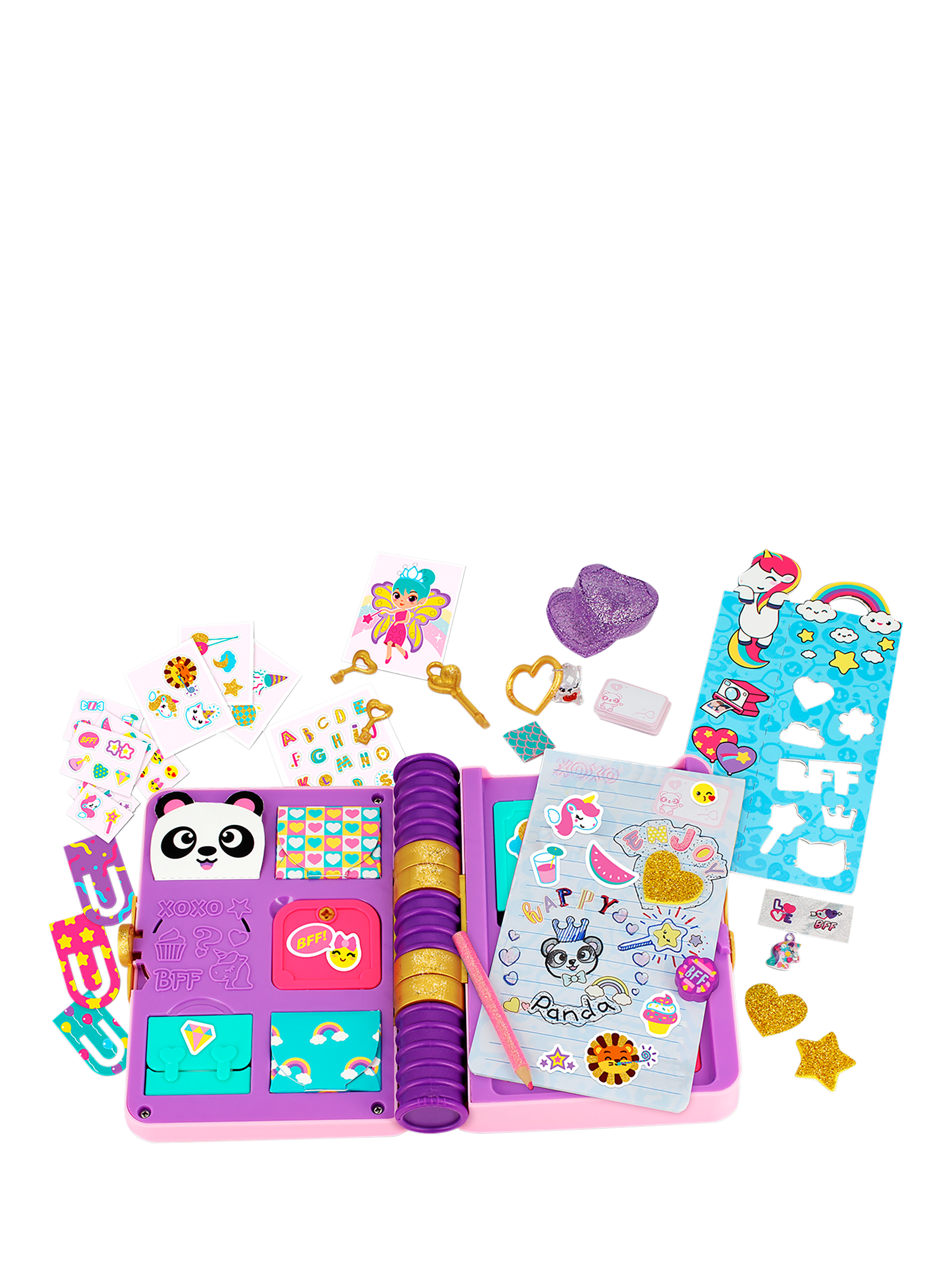 Open the journal and its compartments to find the 30+ surprises. Discover hidden keys to figure out the mysteries inside. Use the pencil to write all your secrets and the stickers, paper clips, stencils, erasers and fun tapes to customise it through hours of creative fun!
